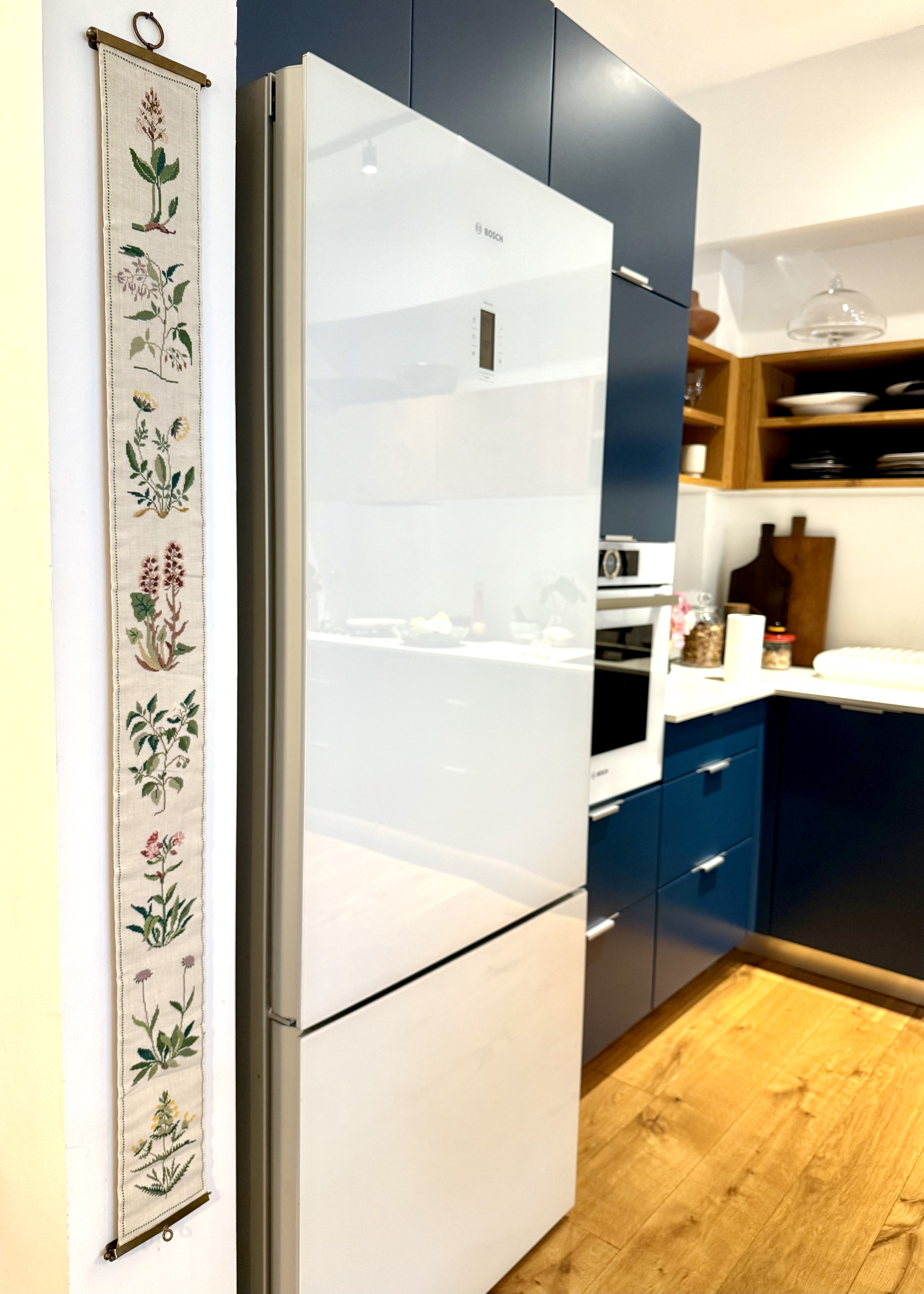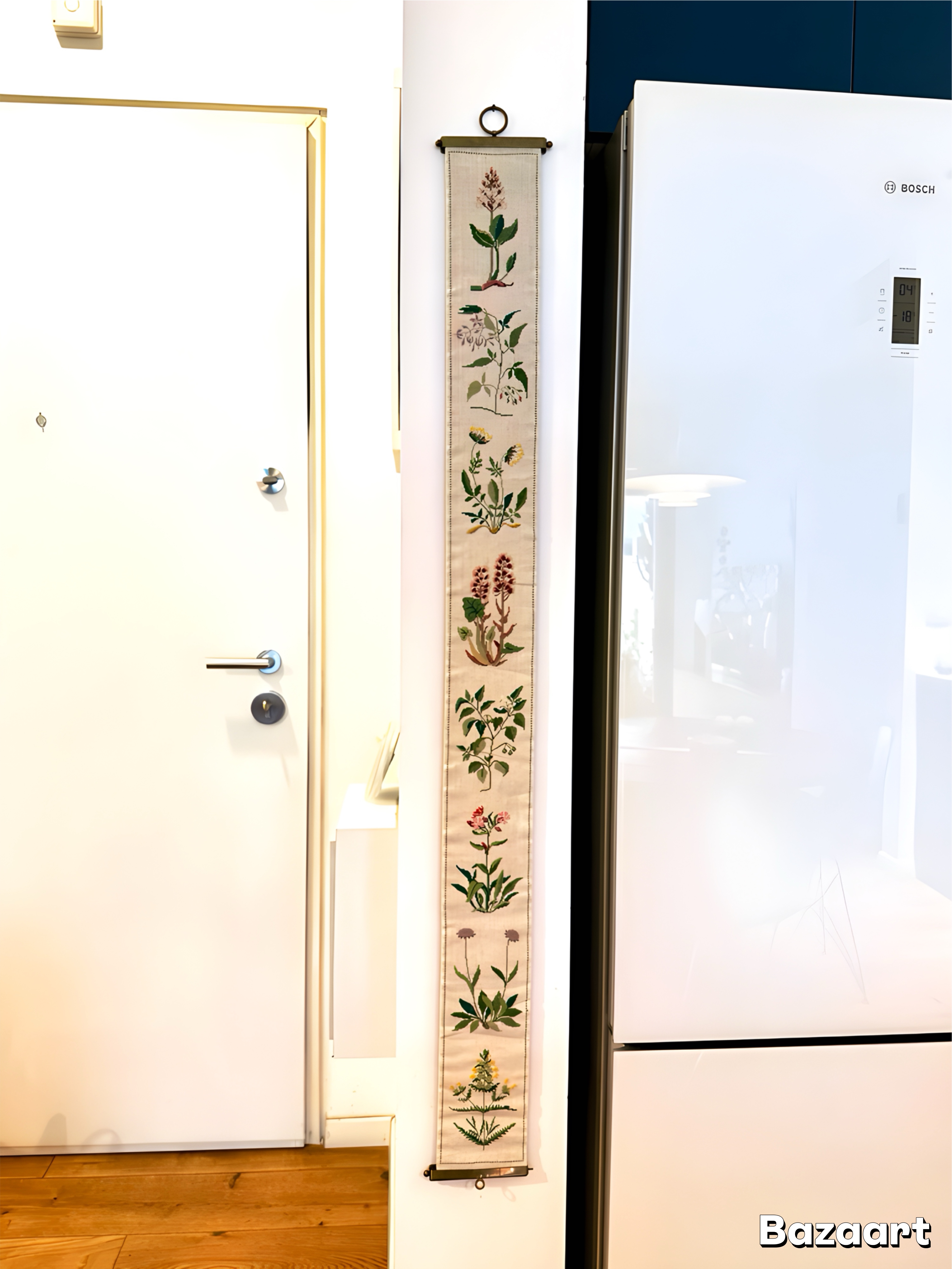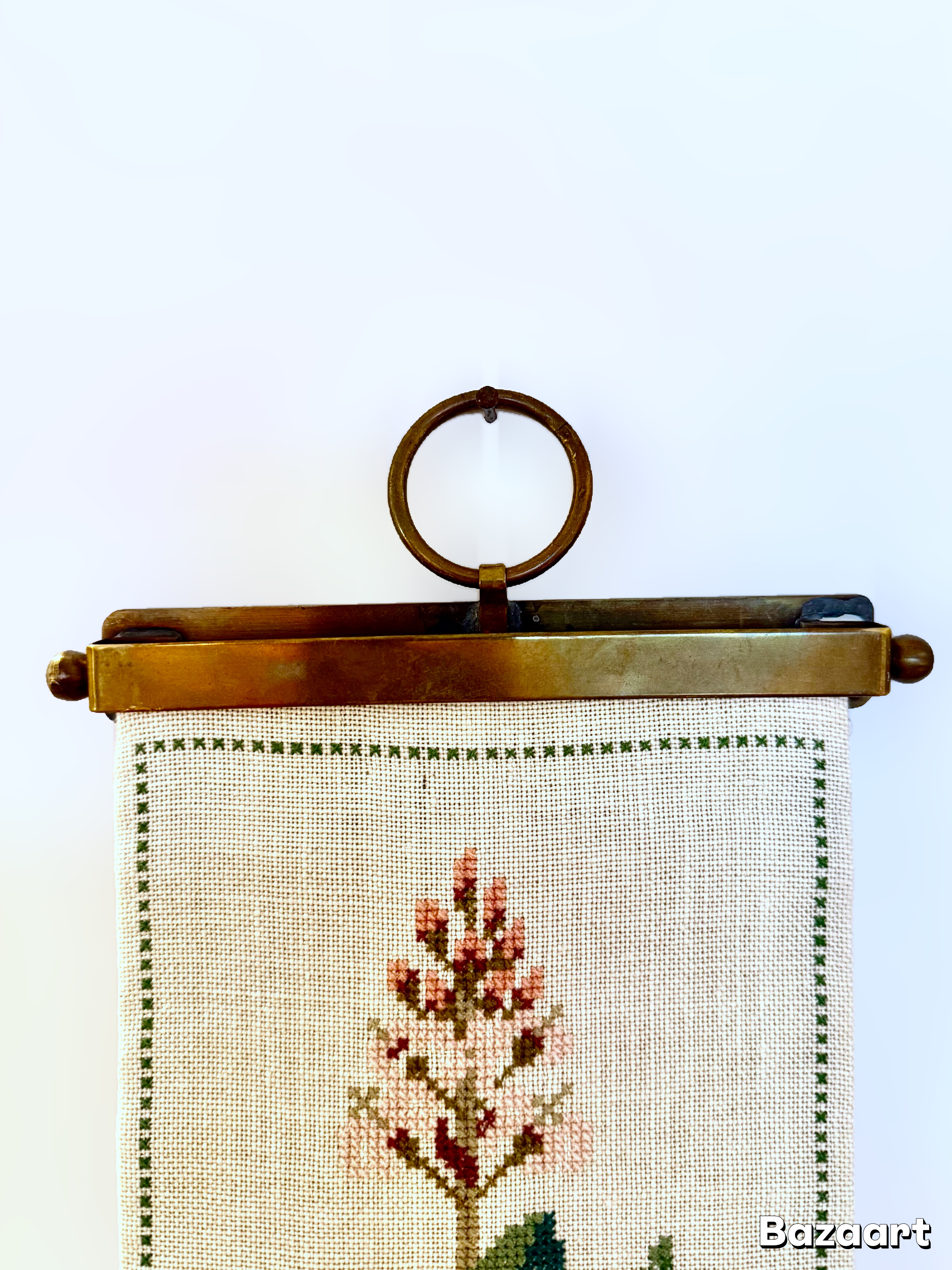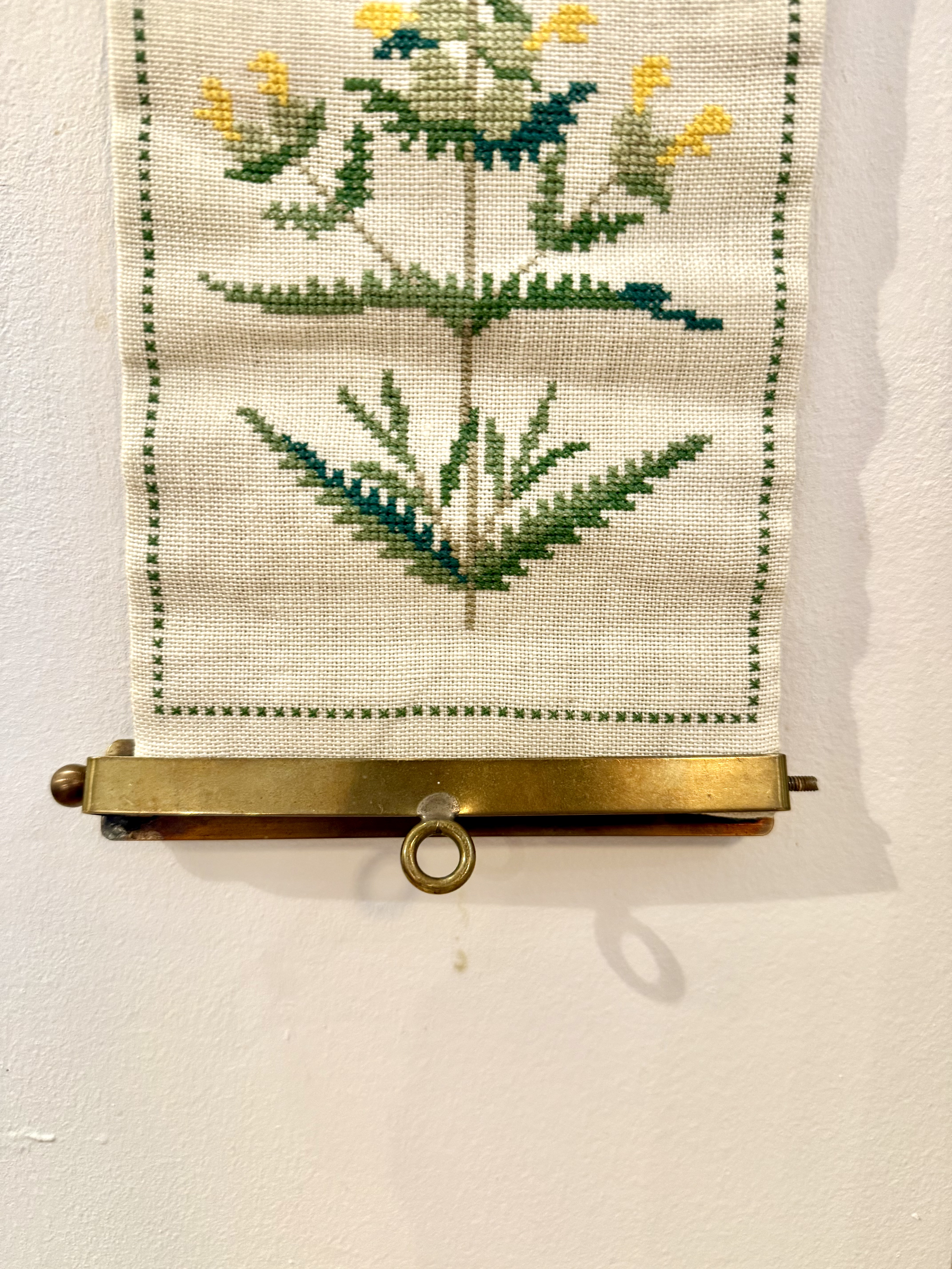Klokkestreng ("bell pull") – originally used to summon servants in aristocratic Danish homes, and during the 20th century became a popular decorative art piece. These traditional Danish embroideries became a symbol of handicraft and patience. Danish women would embroider them over months, often as a gift for a new home or family event. The patterns typically included flowers, leaves, and Scandinavian plants, in the spirit of Danish minimalism. This piece is handmade from wool, traditional cross-stitch embroidery, decorated with plant illustrations. A minimalist pattern that elevates and suits almost any space. Includes original brass metal parts that were connected to the bell system. This is a historical item that reflects early 20th century Danish culture, when large homes needed a way to communicate between rooms, and also an art object representing the Scandinavian tradition of creating beauty through handcraft.