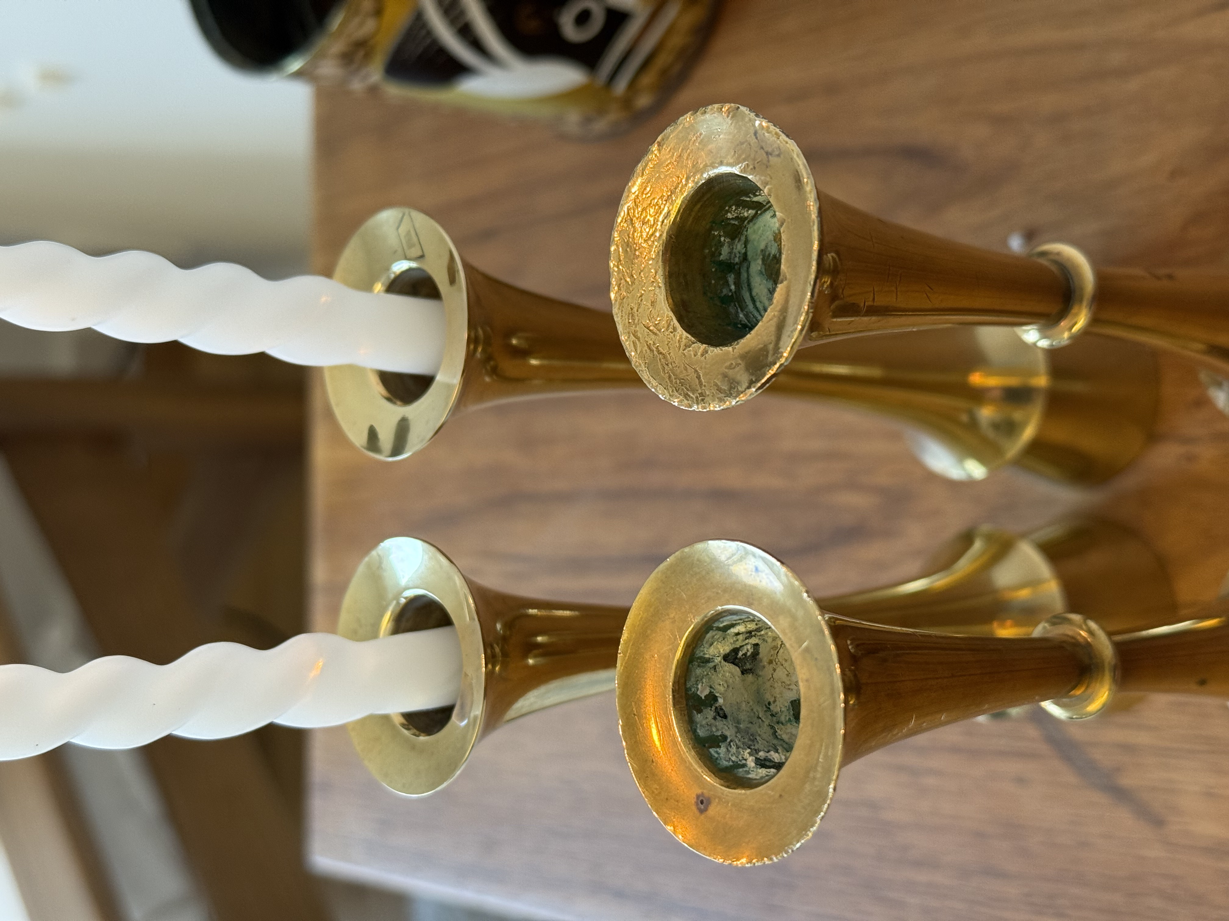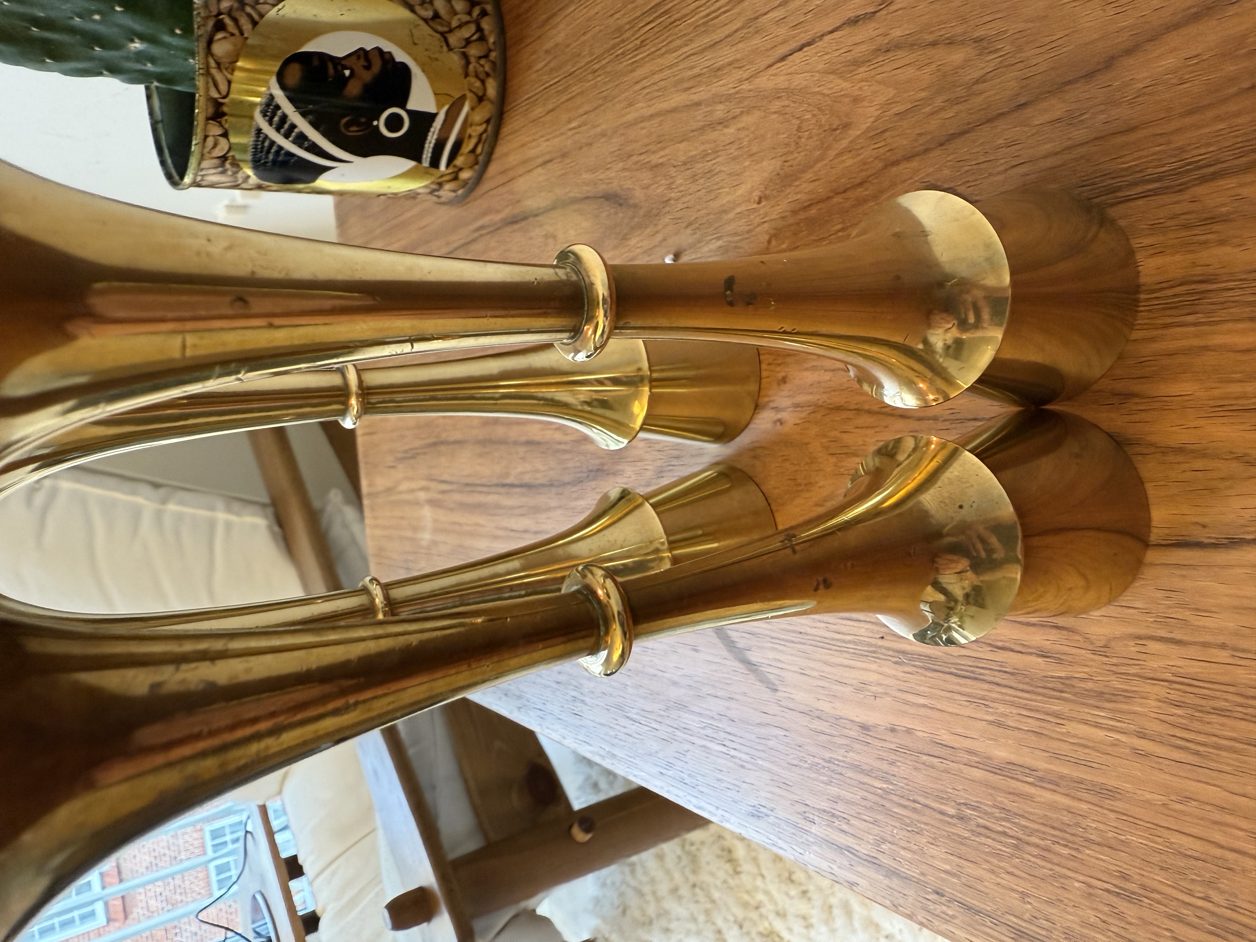 We're used to thinking of design as aesthetics, but design is, no less so, social engineering. The year is 1954. In a dusty studio on Nyhavn street in Copenhagen stands Jens Harald Quistgaard, a Danish sculptor covered in white plaster dust. He is disappointed. Despite his "hybrid" cutlery (Fjord model), which combined industrial steel with Siamese teak wood, having just won a prestigious award, the royal brand "Georg Jensen" refused to produce it. "It's impossible for mass production," they claimed. But a knock on the door from an American tourist couple, Ted and Martha Nierenberg, was about to change the history of dinner. They came from 1950s America, where the meal was a rigid ritual: fragile porcelain, silver utensils requiring polishing, and absolute separation between the kitchen (the dirty "work zone") and the dining area (the sterile "display zone"). Quistgaard spread newspapers on the dirty floor. There, sitting on the floor late into the night in the dusty studio, the Dansk Designs brand was born. Ted the engineer proved that the impossible could be mass-produced and began manufacturing the cutlery with teak wood—yes, that same cutlery so associated with Danish design actually started thanks to an American engineer. Quistgaard, who never changed his residence from Denmark, became America's "modern Viking." He replaced fragile delicacy with utensils radiating the stability of Viking ships: cast iron, wood, and brass. He designed "liminal" tools—boundary-crossing—that could go straight from the stove to the center of the table. In doing so, he redesigned human behavior and the American casualness we know today. He taught an entire generation that the table doesn't need to look like a palace to be dignified; it needs to feel like home. The American casual approach that seems trivial to us today is actually part of the social vision of an artist who never left Denmark. In the 1960s, candlesticks were usually tall, branched, and distant. Quistgaard hated that. He wanted to create intimacy. He designed these candlesticks at a precise height (about 18 cm), from a social concept he called "architecture of conversation": the flame should illuminate faces in flattering light but never block eye contact between diners. The design draws inspiration from ancient Nordic weapons and Viking swords, but in modernist, clean execution. This is solid brass, a heavy, honest material that doesn't apologize and doesn't hide behind coatings. They were meant to be the domestic "tribal fire." This pair includes a minor dent but still functions perfectly and retains its original vintage beauty.