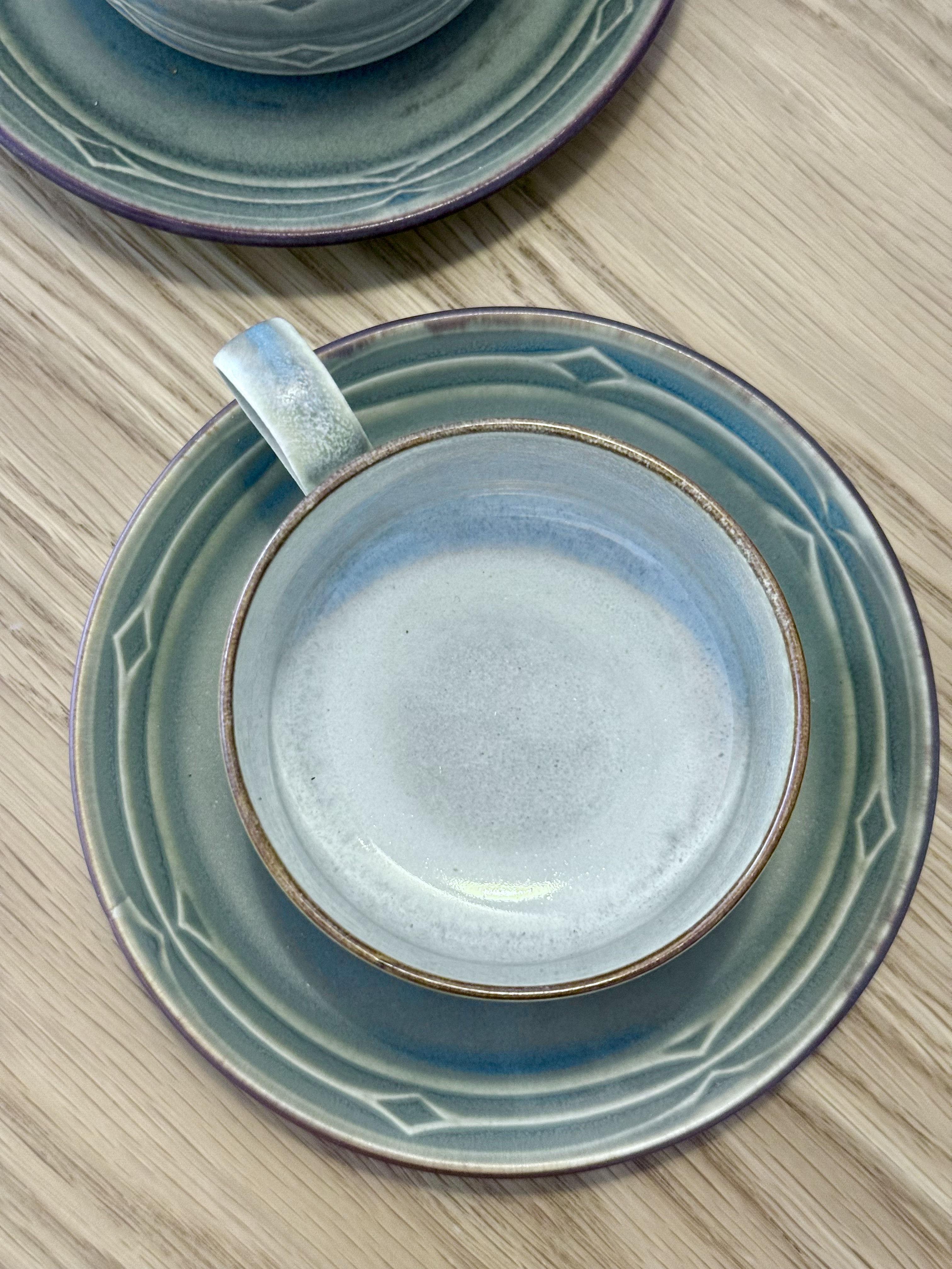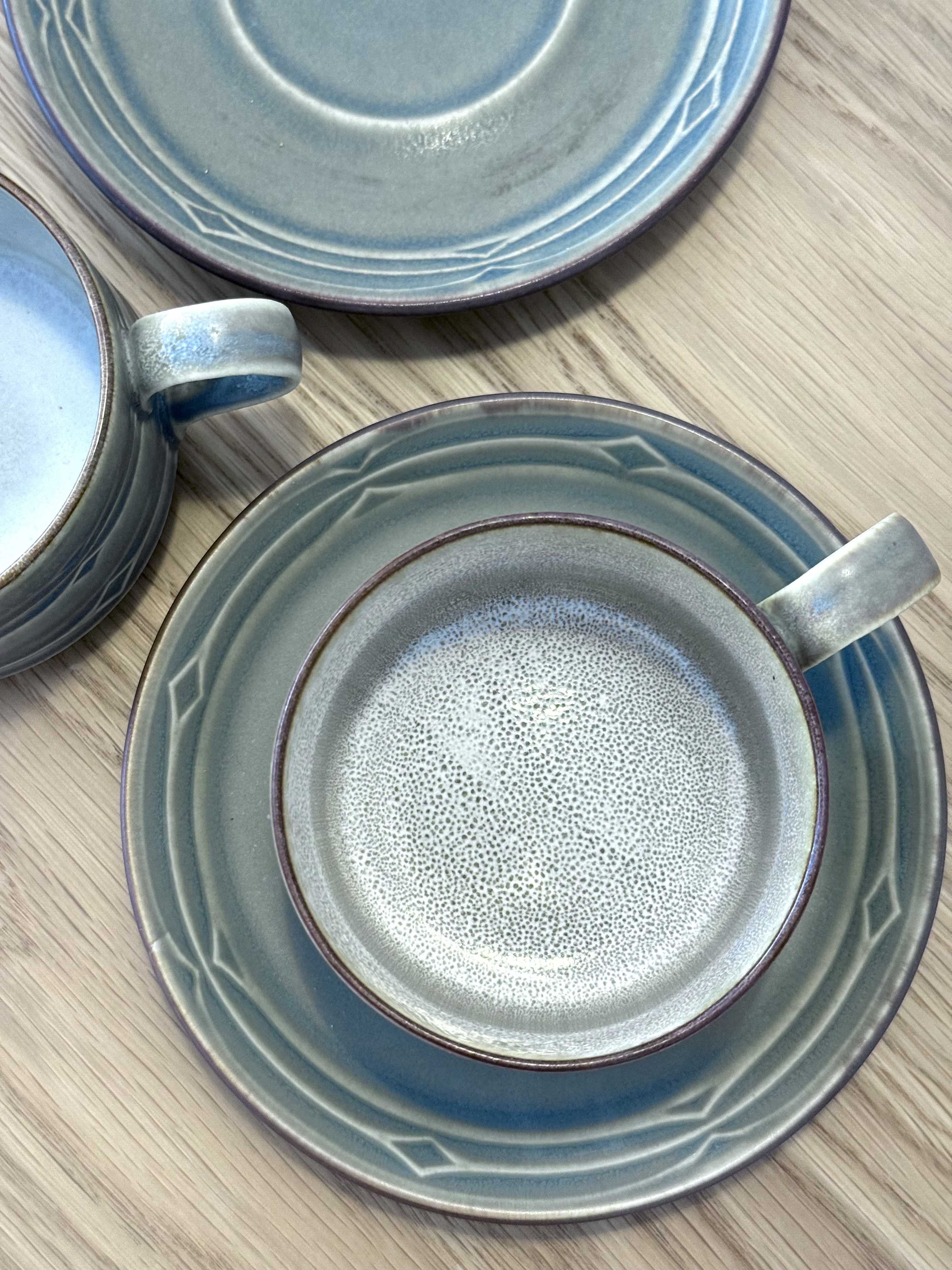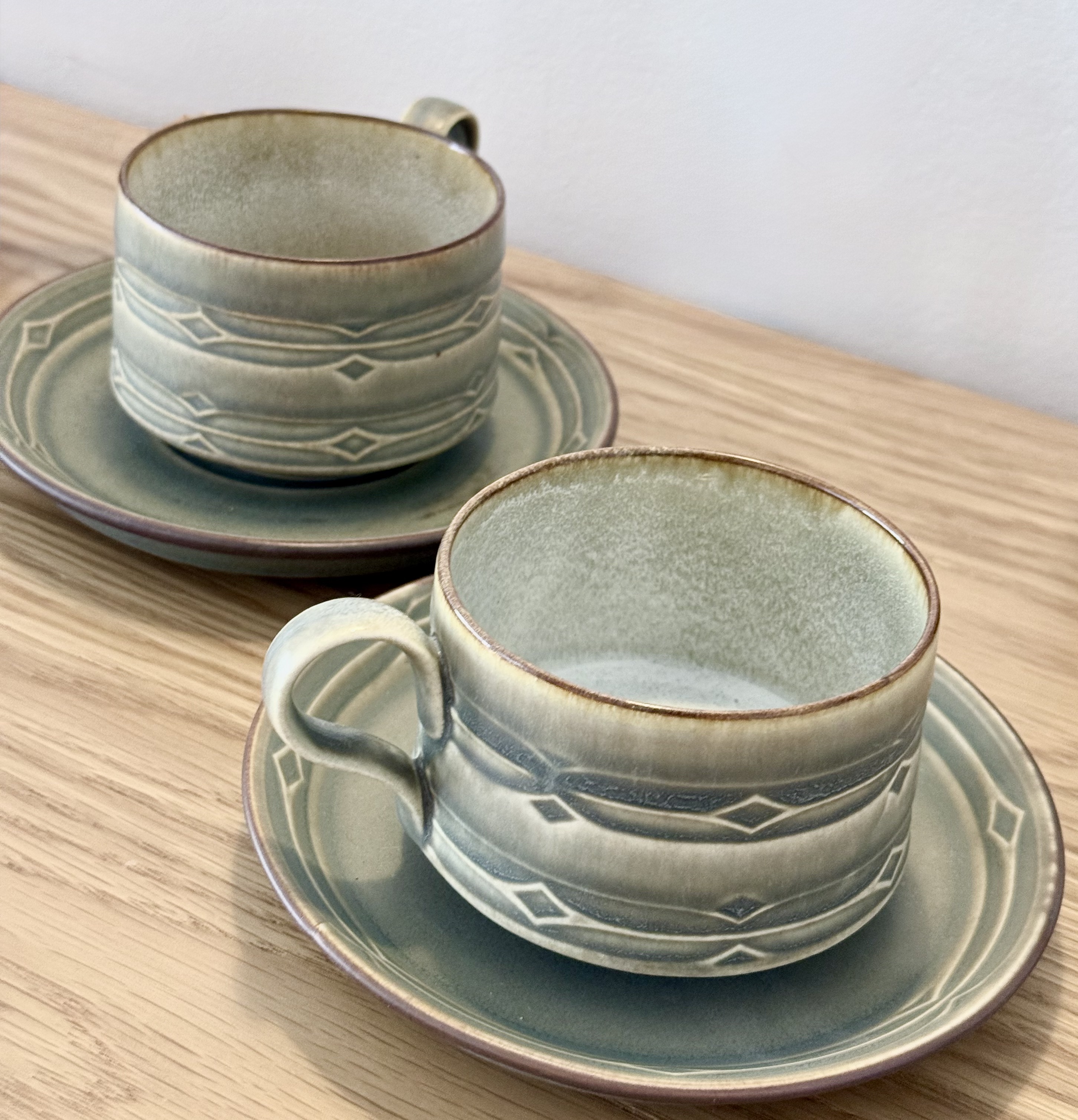 After the candlesticks, comes the more everyday side of Quistgaard. The Rune series is one of his most recognizable collections and became an international icon in the mid-20th century. It achieved enormous success in the United States and especially in Japan, where an obsession formed around this design. The decoration on the pieces draws inspiration from ancient runic inscriptions, the alphabet of Germanic and Scandinavian peoples before adopting the Latin script. Grooves, lines, and diamonds are carved into the material, creating tactile depth felt in the palm of your hand. Quistgaard, trained as a sculptor and silversmith, designed even industrial pieces to feel almost handmade. No two units are completely identical. There's subtle variation in shade, texture, and glaze. The set is made of durable stoneware with a semi-matte glaze in olive green that opens to warm amber tones. A quiet, warm material, very pleasant to touch and ages beautifully. The Rune series was produced over the years by three different manufacturers (Kronjyden / Nissen / Bing & Grøndahl), so you can find different signatures on identical items. All are original, all part of the same design continuum. Quistgaard's works are displayed today in permanent collections of museums, including the Danish Museum of Art & Design in Copenhagen. And still, these are pieces meant for everyday life. Coffee, tea, a small bowl nearby.