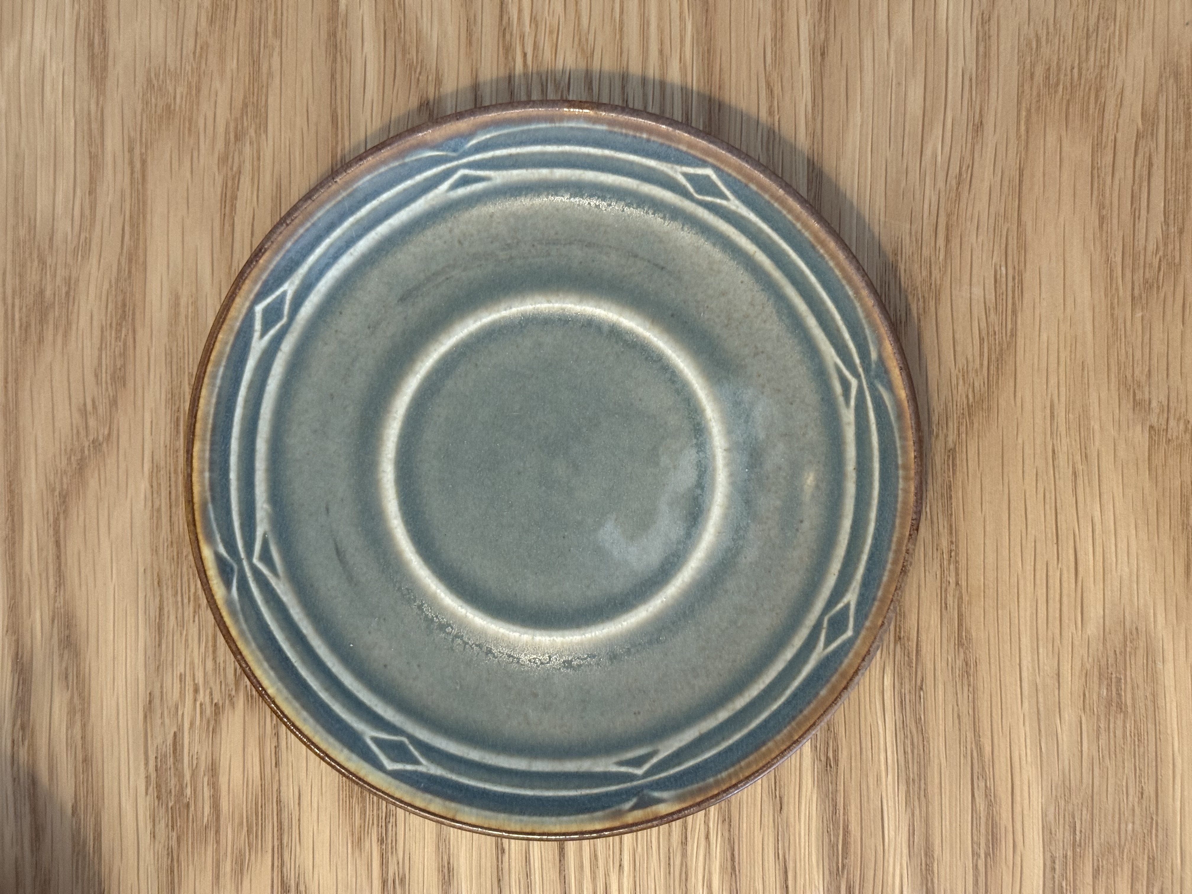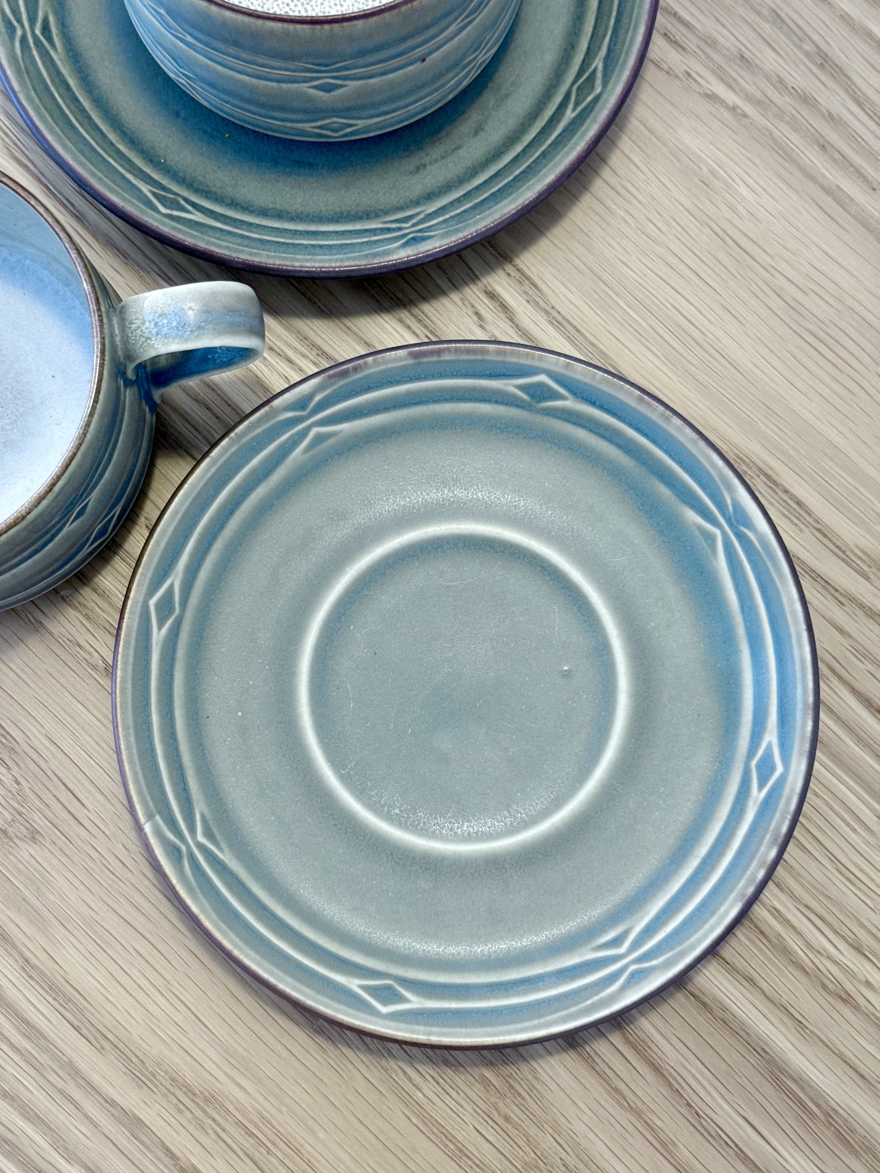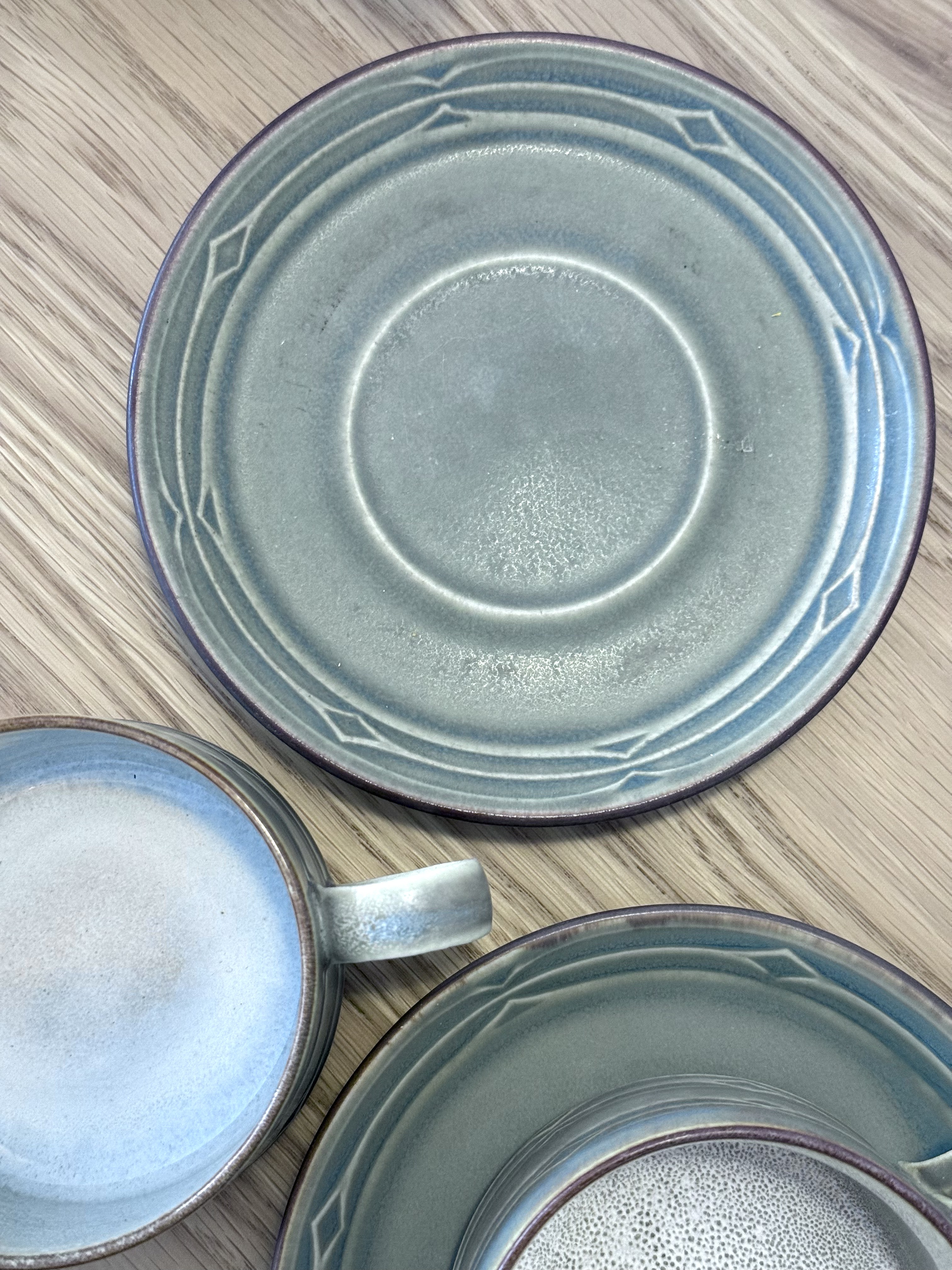 After the candlesticks, comes the more everyday side of Quistgaard. The Rune series is one of his most recognizable collections and became an international icon in the mid-20th century. It achieved enormous success in the United States and especially in Japan, where an obsession formed around this design. The decoration on the pieces draws inspiration from ancient runic inscriptions, the alphabet of Germanic and Scandinavian peoples before adopting the Latin script. Grooves, lines, and diamonds are carved into the material, creating tactile depth felt in the palm of your hand. Quistgaard, trained as a sculptor and silversmith, designed even industrial pieces to feel almost handmade. No two units are completely identical. There's subtle variation in shade, texture, and glaze. The set is made of durable stoneware with a semi-matte glaze in olive green that opens to warm amber tones. A quiet, warm material, very pleasant to touch and ages beautifully. The Rune series was produced over the years by three different manufacturers (Kronjyden / Nissen / Bing & Grøndahl), so you can find different signatures on identical items. All are original, all part of the same design continuum. Quistgaard's works are displayed today in permanent collections of museums, including the Danish Museum of Art & Design in Copenhagen. And still, these are pieces meant for everyday life. Coffee, tea, a small bowl nearby.