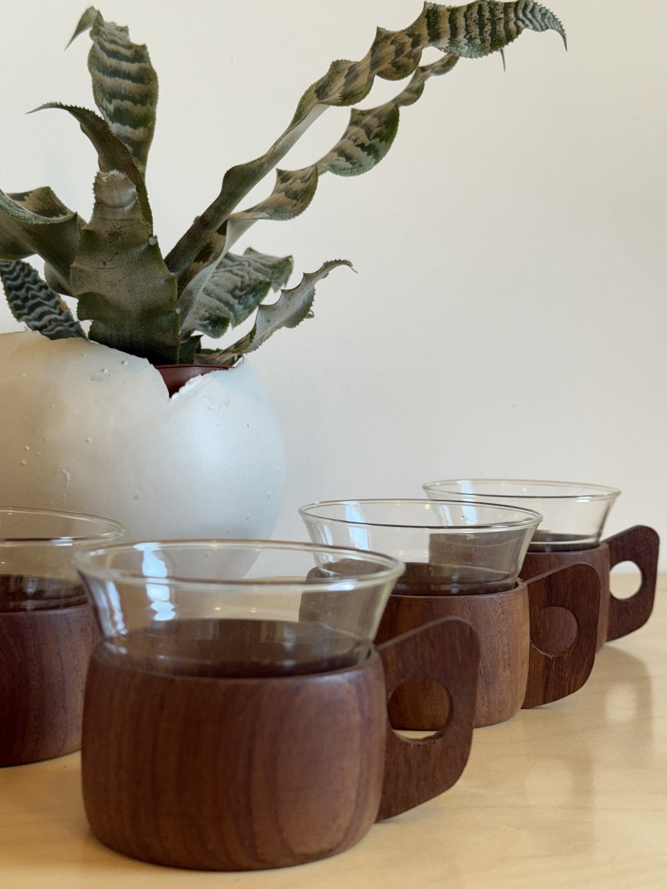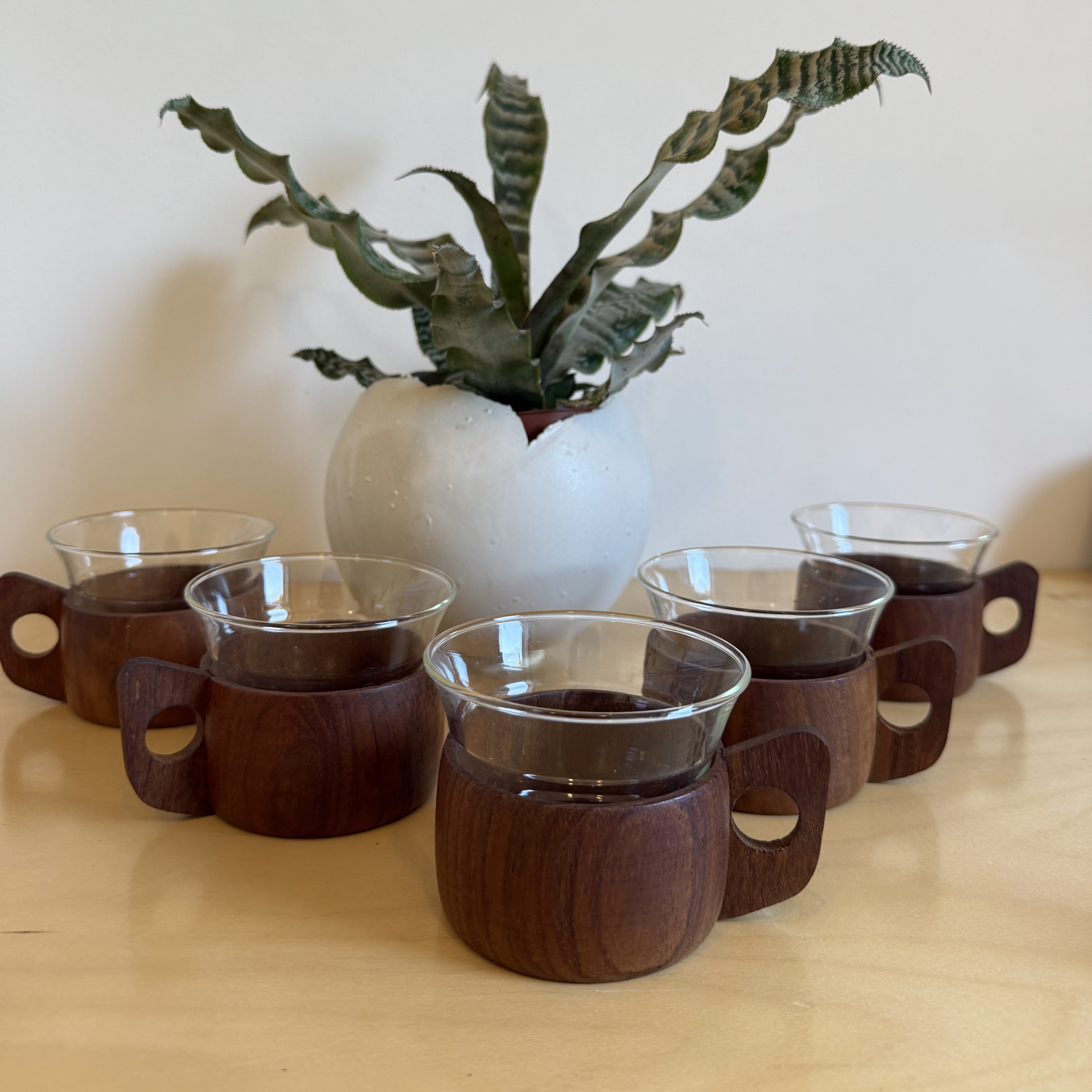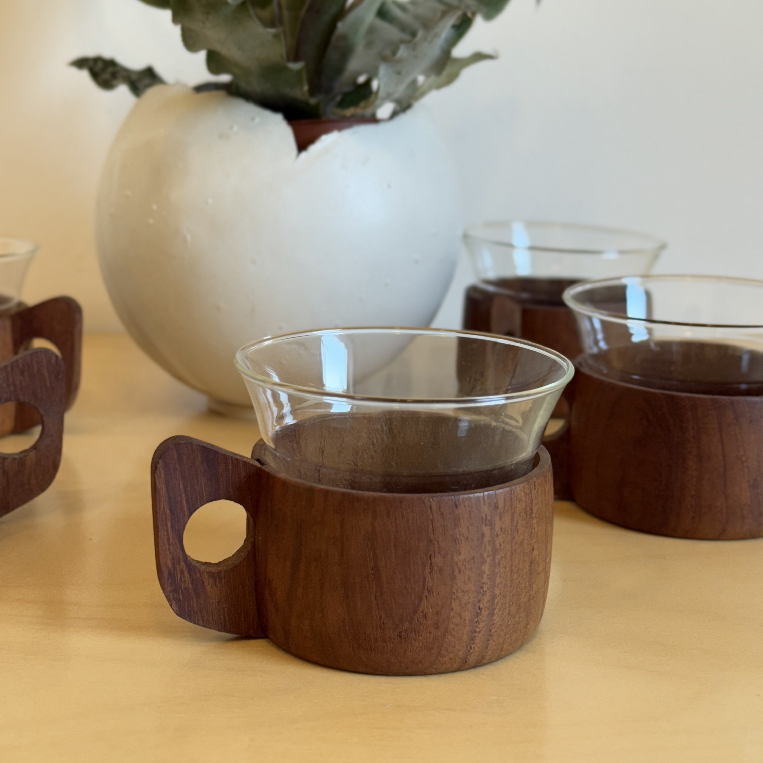 In the 1960s, when European manufacturing began combining science with design, one of the era's most beautiful unions was created: heat-resistant borosilicate glass from Schott / Jenaer Glas, wrapped in warm Scandinavian teak wood. The innovation was revolutionary—glass that looks delicate and minimalist but withstands boiling heat without cracking or discoloring. Because of this combination, the cups became a must-have in student homes, small apartments, and modernist sets—beautiful, practical, and always ready for use. The teak provides a stable, warm grip, the sculpted handle adds a touch of small Scandinavian sculpture, and the glass signed SCHOTT / JENAer GLAS has maintained its original form for 60 years. A set of 5 like this, in this condition, rarely comes to market today. The glass slides out of the wood, so essentially there are two cups in each one—one for hot drinks with the teak holder, and one for cold drinks or desserts on its own. Practical, smart, and space-saving—ideal for small apartments, singles who love smart design without compromising beauty.