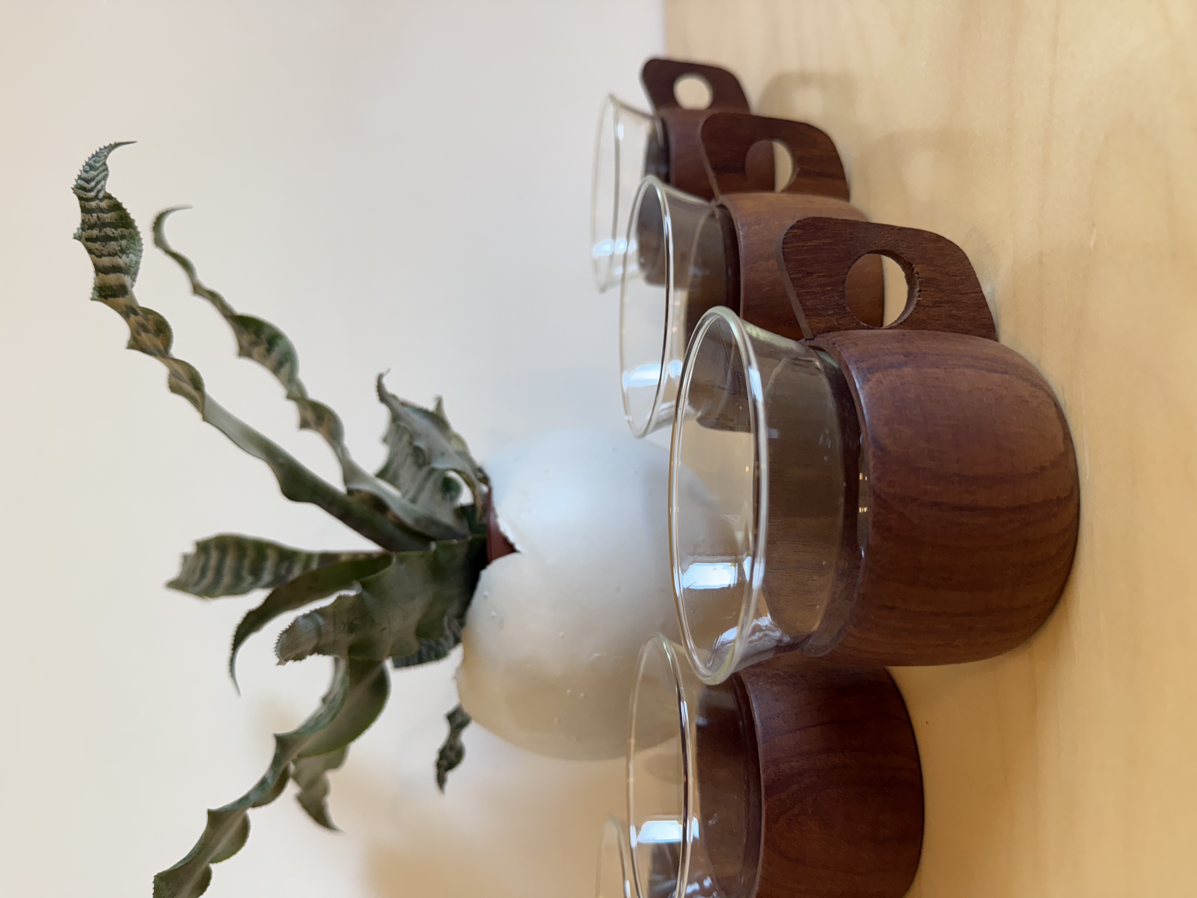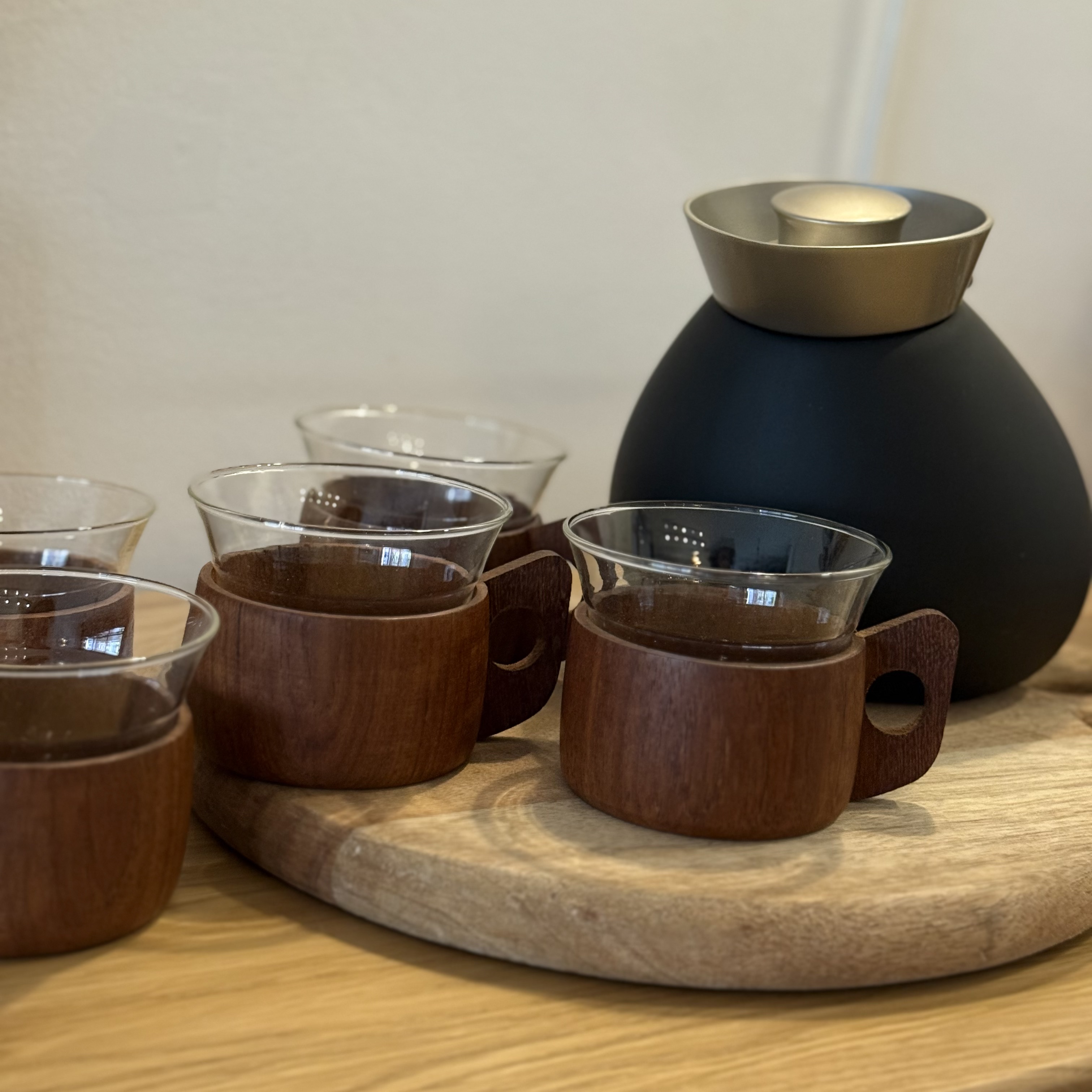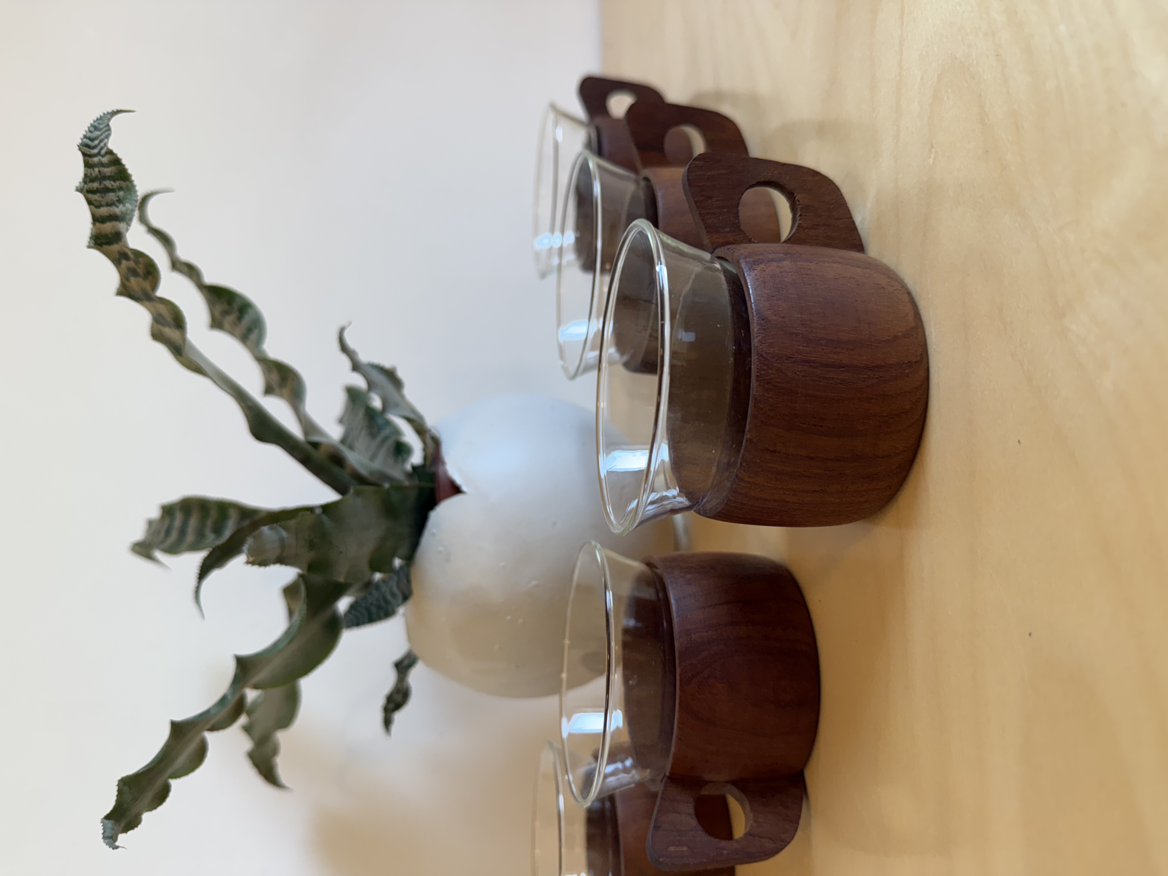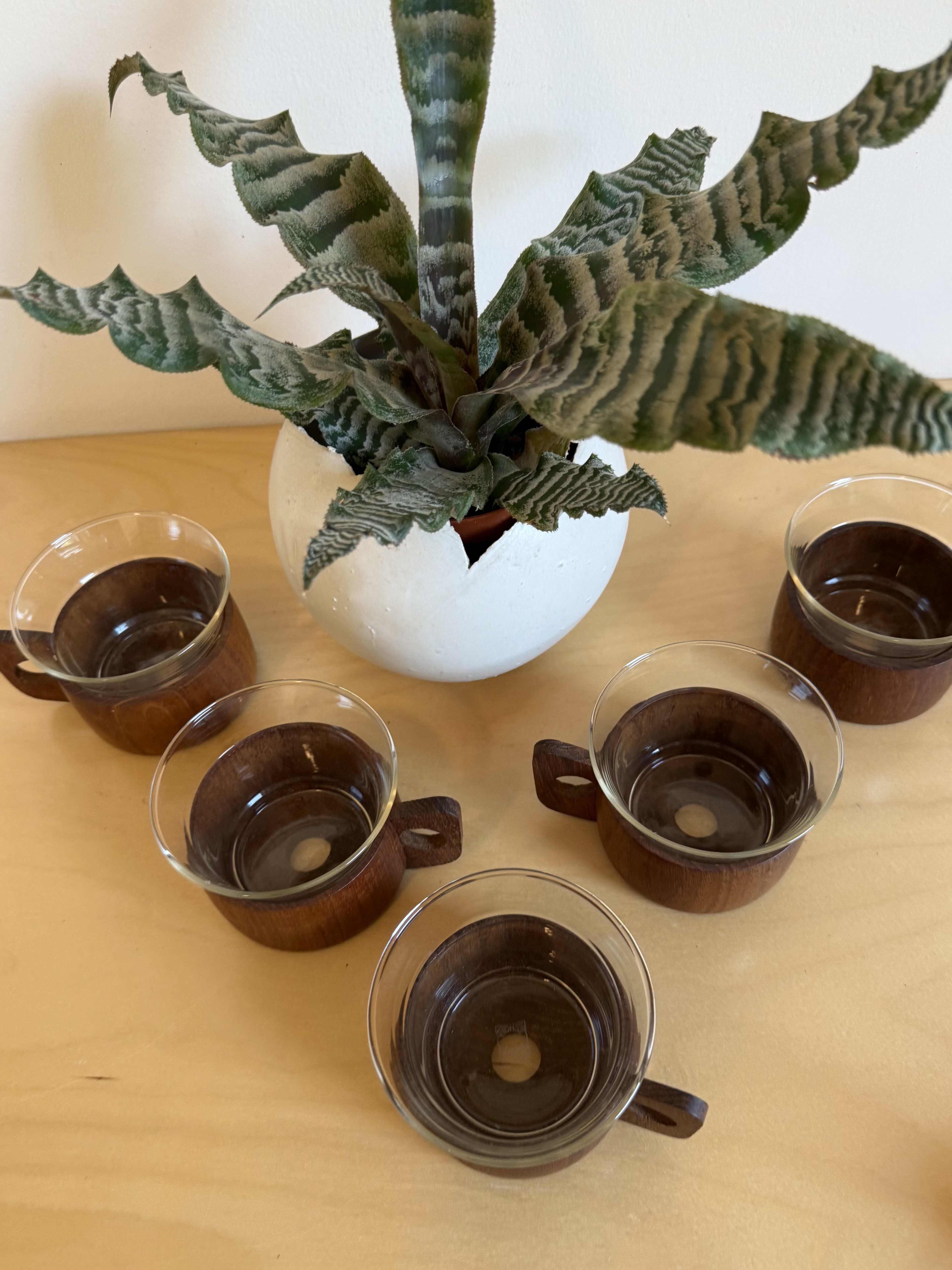 In the 1960s, when European manufacturing began combining science with design, one of the era's most beautiful unions was created: heat-resistant borosilicate glass from Schott / Jenaer Glas, wrapped in warm Scandinavian teak wood. The innovation was revolutionary—glass that looks delicate and minimalist but withstands boiling heat without cracking or discoloring. Because of this combination, the cups became a must-have in student homes, small apartments, and modernist sets—beautiful, practical, and always ready for use. The teak provides a stable, warm grip, the sculpted handle adds a touch of small Scandinavian sculpture, and the glass signed SCHOTT / JENAer GLAS has maintained its original form for 60 years. A set of 5 like this, in this condition, rarely comes to market today. The glass slides out of the wood, so essentially there are two cups in each one—one for hot drinks with the teak holder, and one for cold drinks or desserts on its own. Practical, smart, and space-saving—ideal for small apartments, singles who love smart design without compromising beauty.