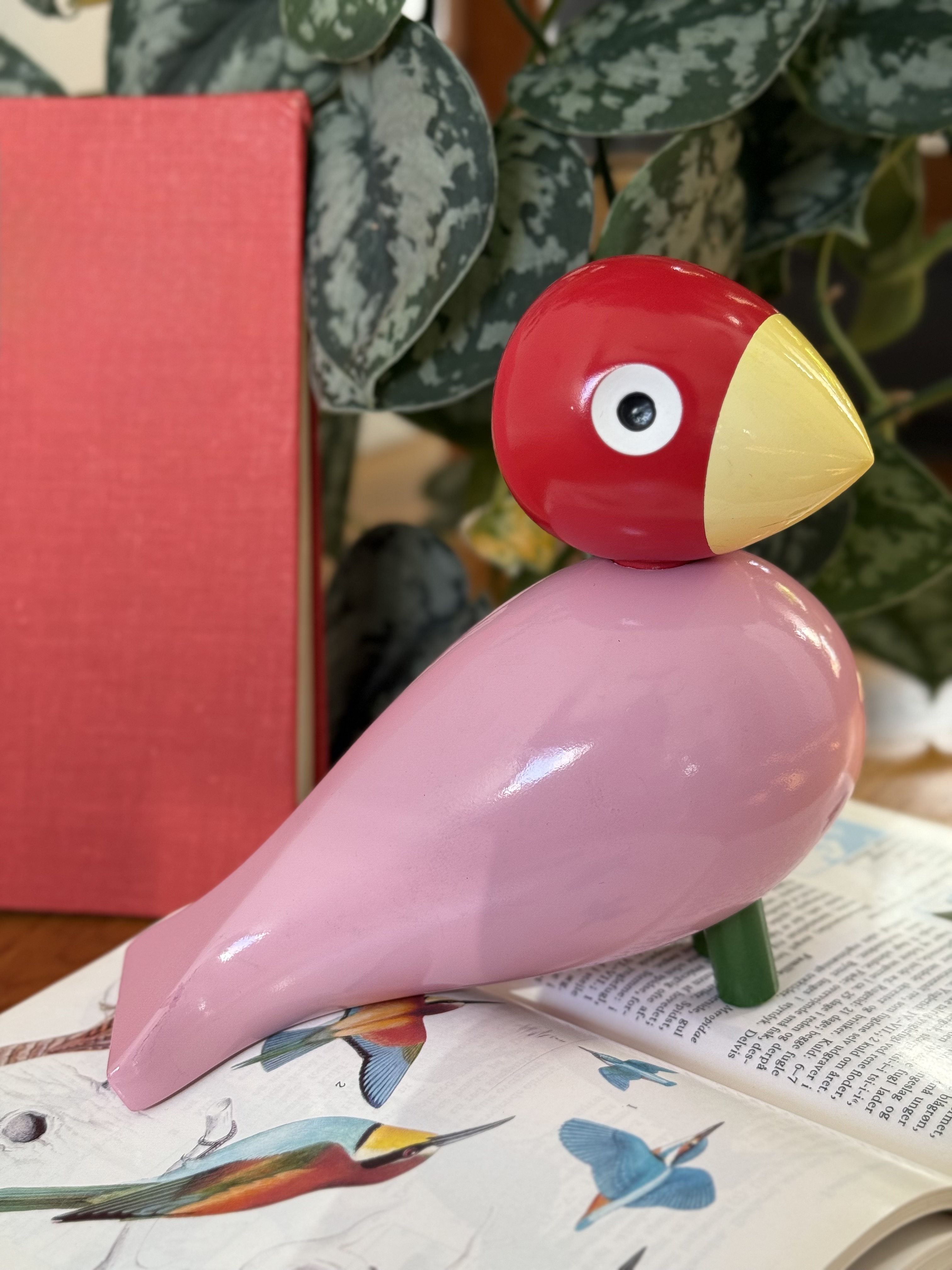 The Kay Bojesen Songbird Ruth is a charming wooden figurine designed by the renowned Danish craftsman Kay Bojesen. Recognized for his whimsical wooden animals, Bojesen designed Ruth in the mid-20th century, reflecting a playful yet refined Scandinavian aesthetic. Made primarily from beech wood, the songbird is painted in vibrant red, yellow, pink, and green colors, embodying a purely decorative object with modernist appeal. Bojesen's work was part of a broader movement in Denmark aimed at bringing functional art into everyday life. Each piece was crafted with an emphasis on simple, organic forms, which won international acclaim for blending modesty with joyful expression. Despite its minimalist design, the Songbird Ruth holds cultural significance, often considered a collector's item due to its historical roots in Danish design. The bird's simple lines and lively coloration make it stand out in any decorative setting. These figurines were typically handcrafted, and their solid wood construction adds durability, making them prized collectibles today. In recent years, originals and reproductions have captured the interest of design enthusiasts and collectors worldwide. The songbird's compact size, about 15 cm in height, makes it a perfect decorative piece for shelves or desks. Its lively design continues to appeal to both children and adults, revealing Bojesen's enduring impact on Danish design.