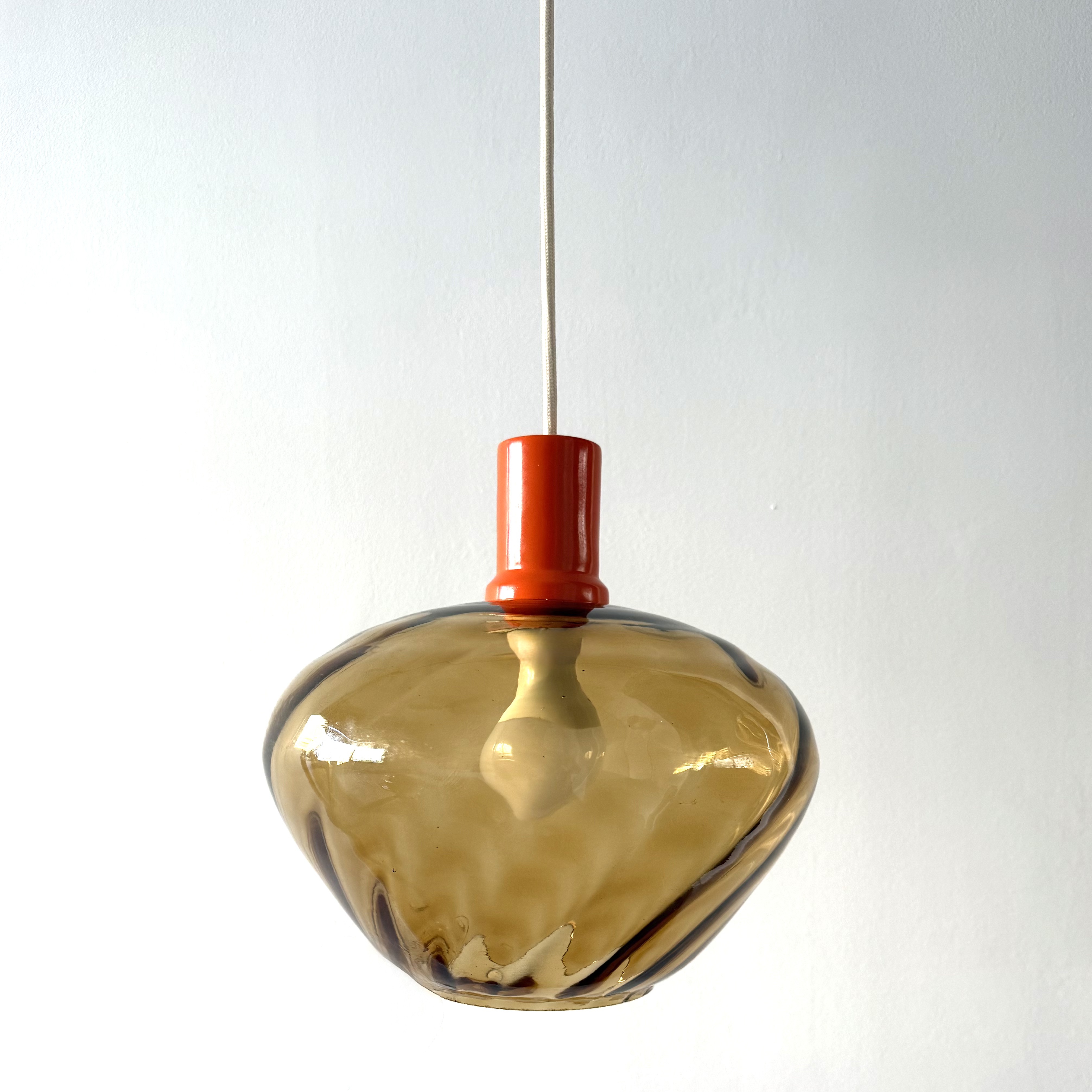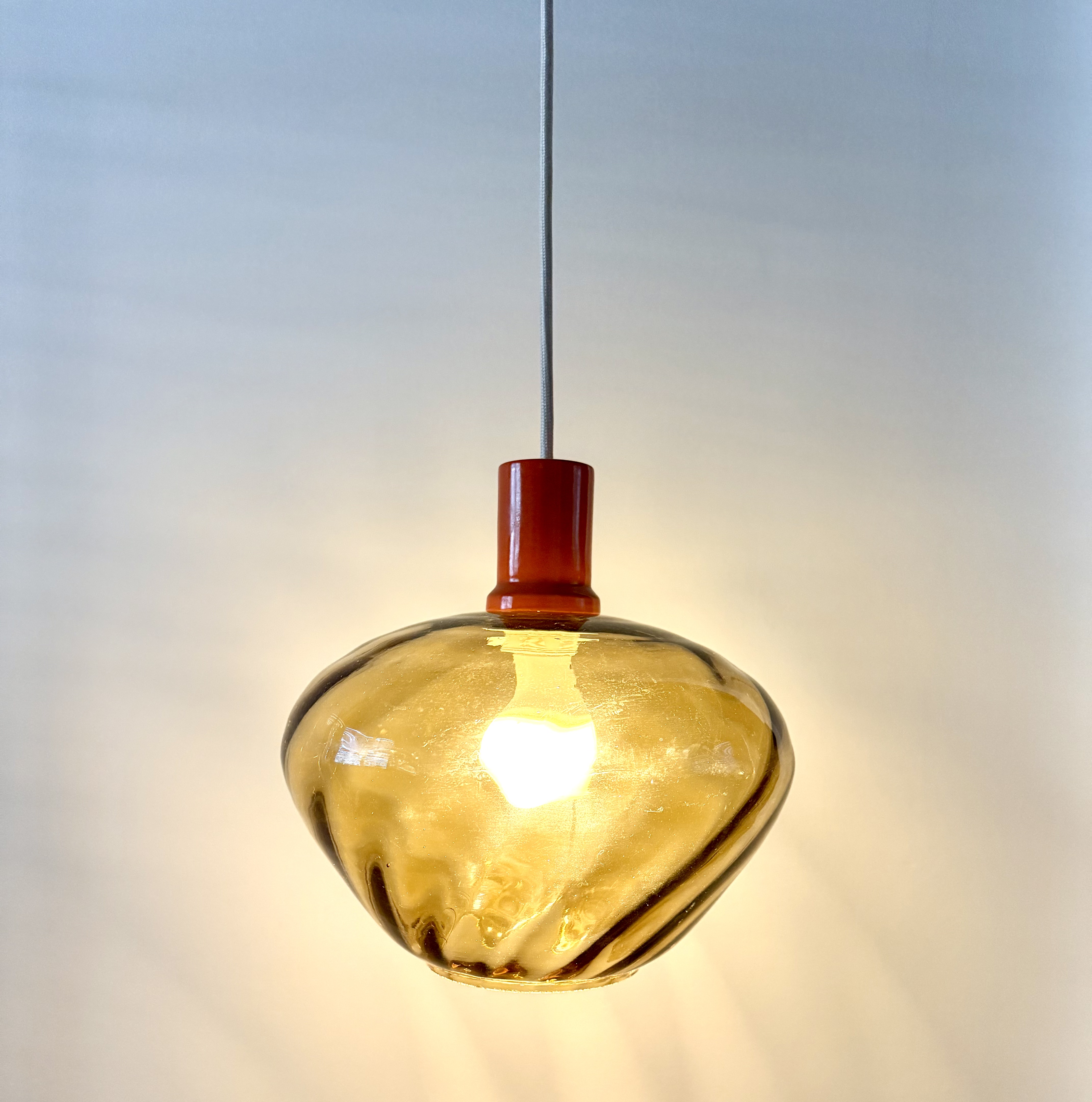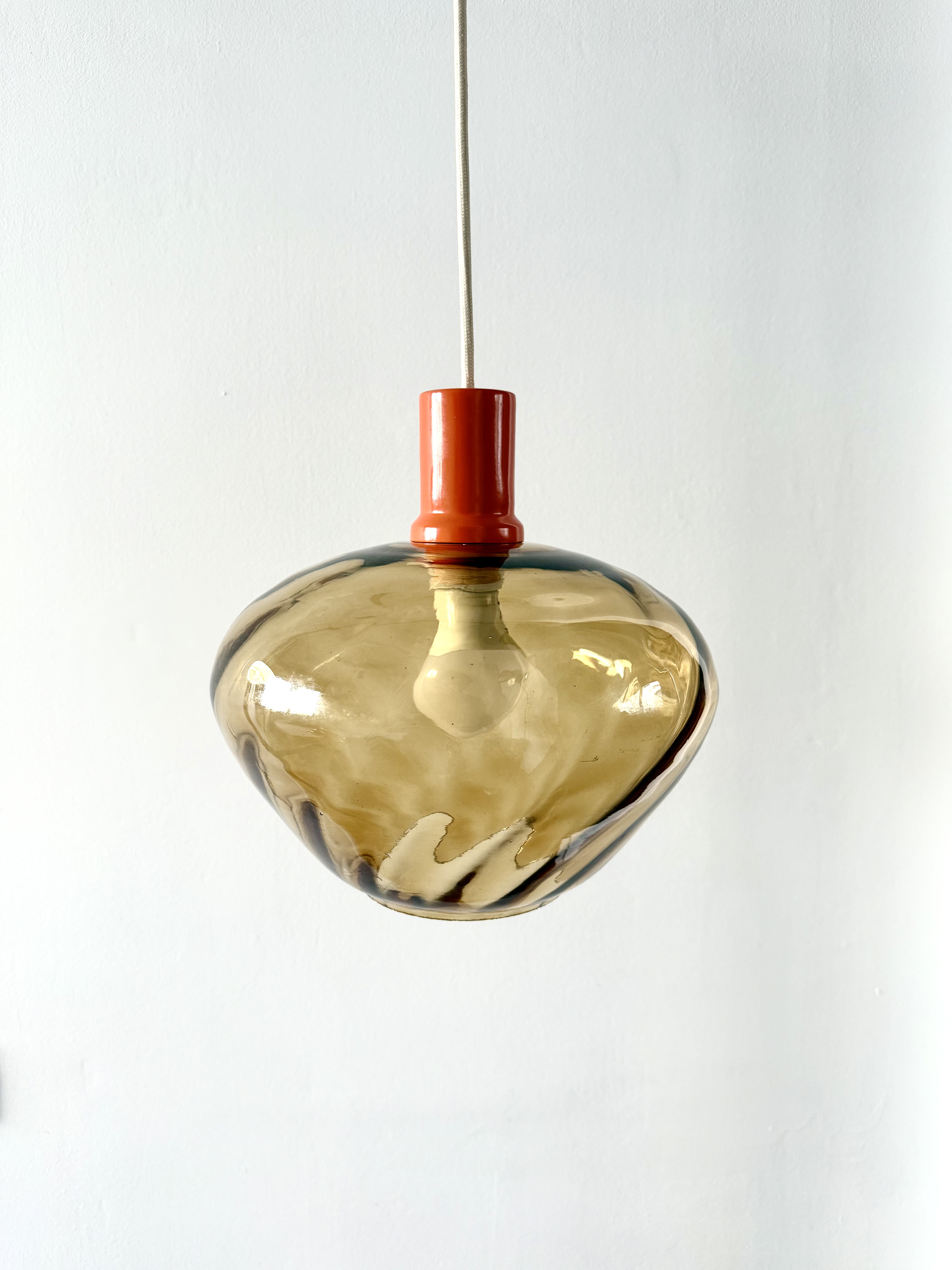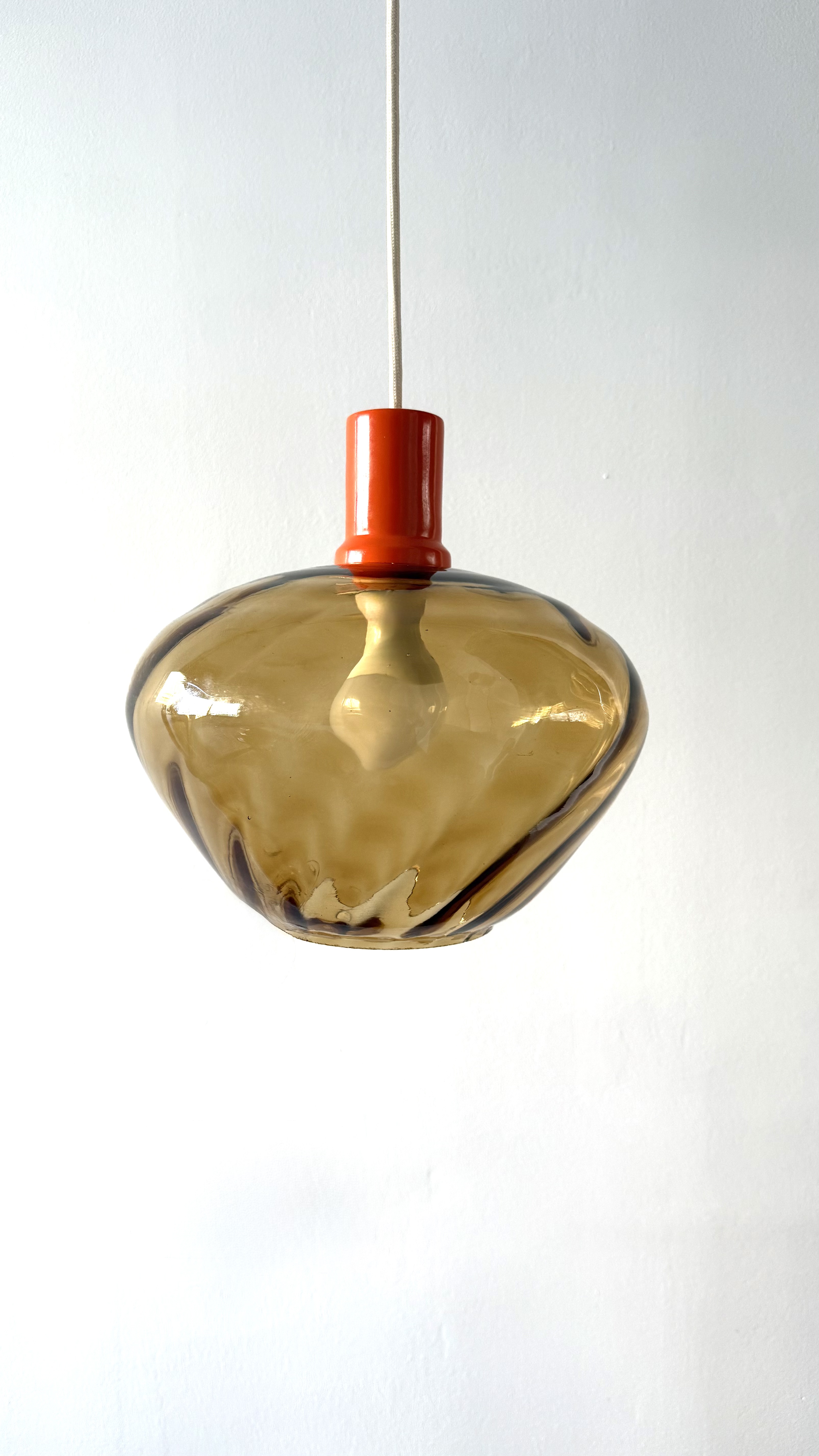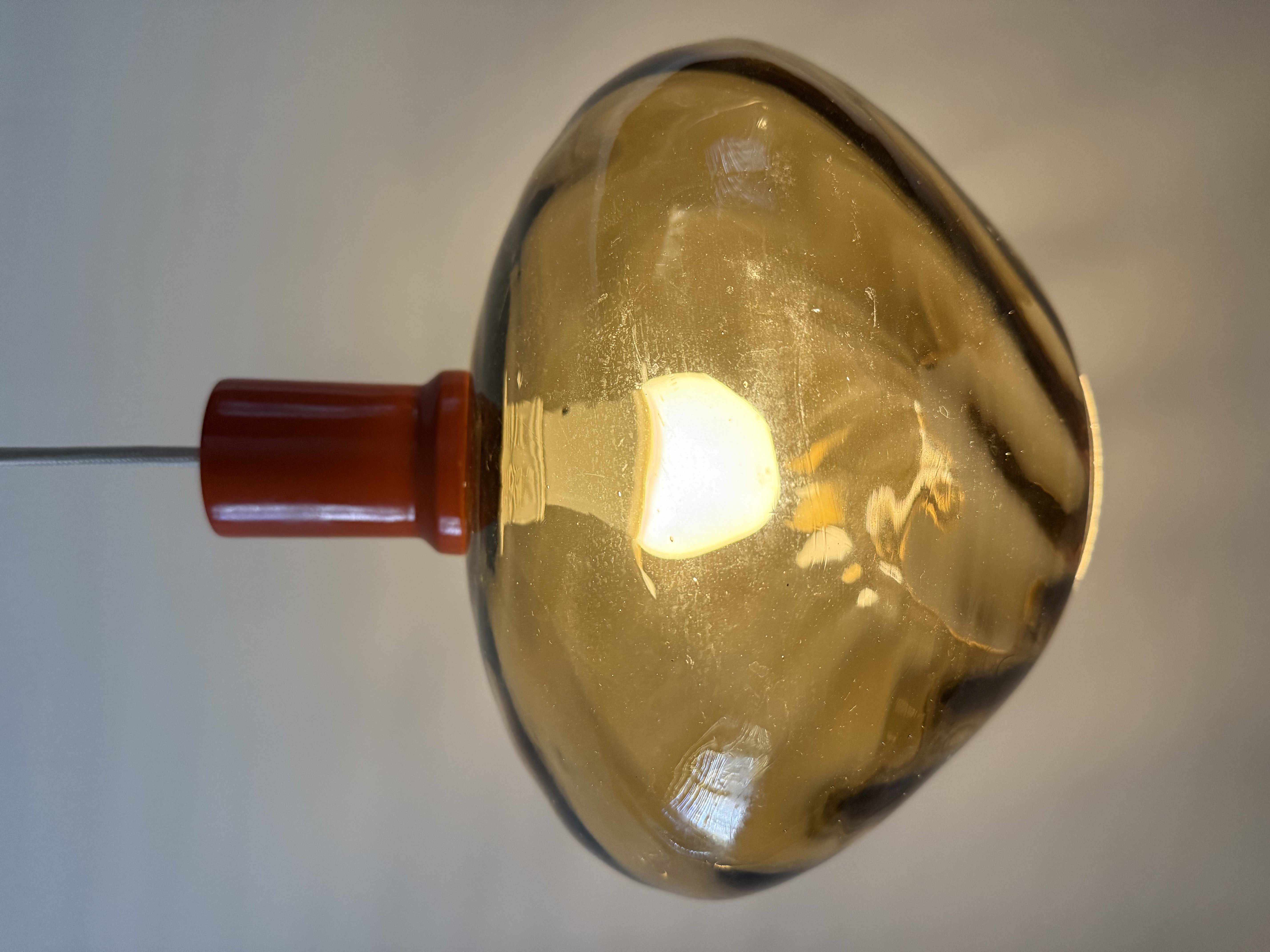 "Amber Pop" glass pendant lamp (1970s). The hand-blown amber glass creates a permanent golden-hour glow, warming the room with classic Hygge light. The glossy orange neck introduces a playful 1970s pop-art accent. Its organic onion/pumpkin form is typical of the era—sculptural when off, and sunset-warm when lit. Details: approx. 30 cm diameter. Materials: mouth-blown glass with a ceramic/plastic neck. Condition: excellent vintage, glass intact and glossy. Pickup: Tel Aviv, Ramat Hasharon, or Alon Abba.