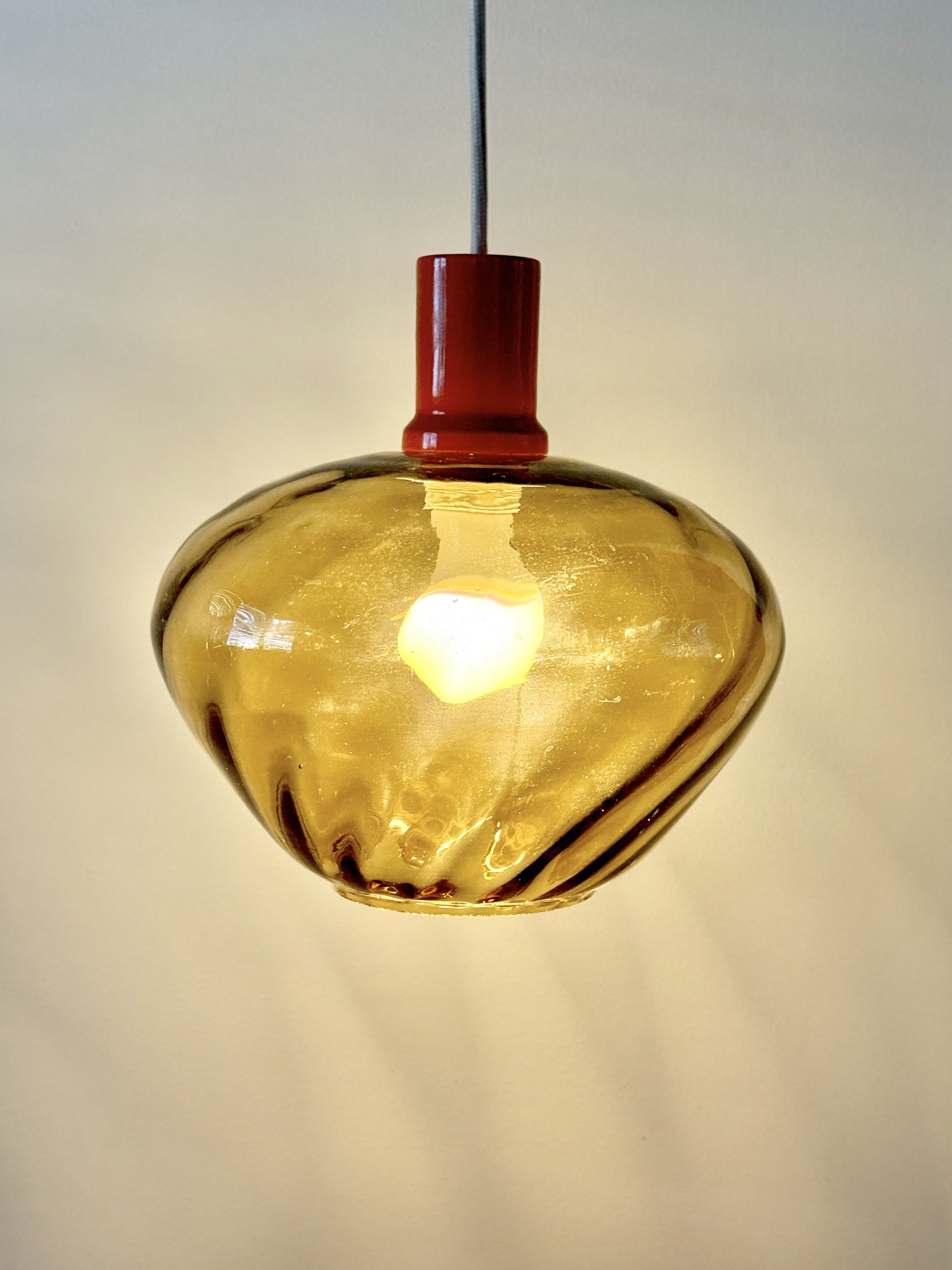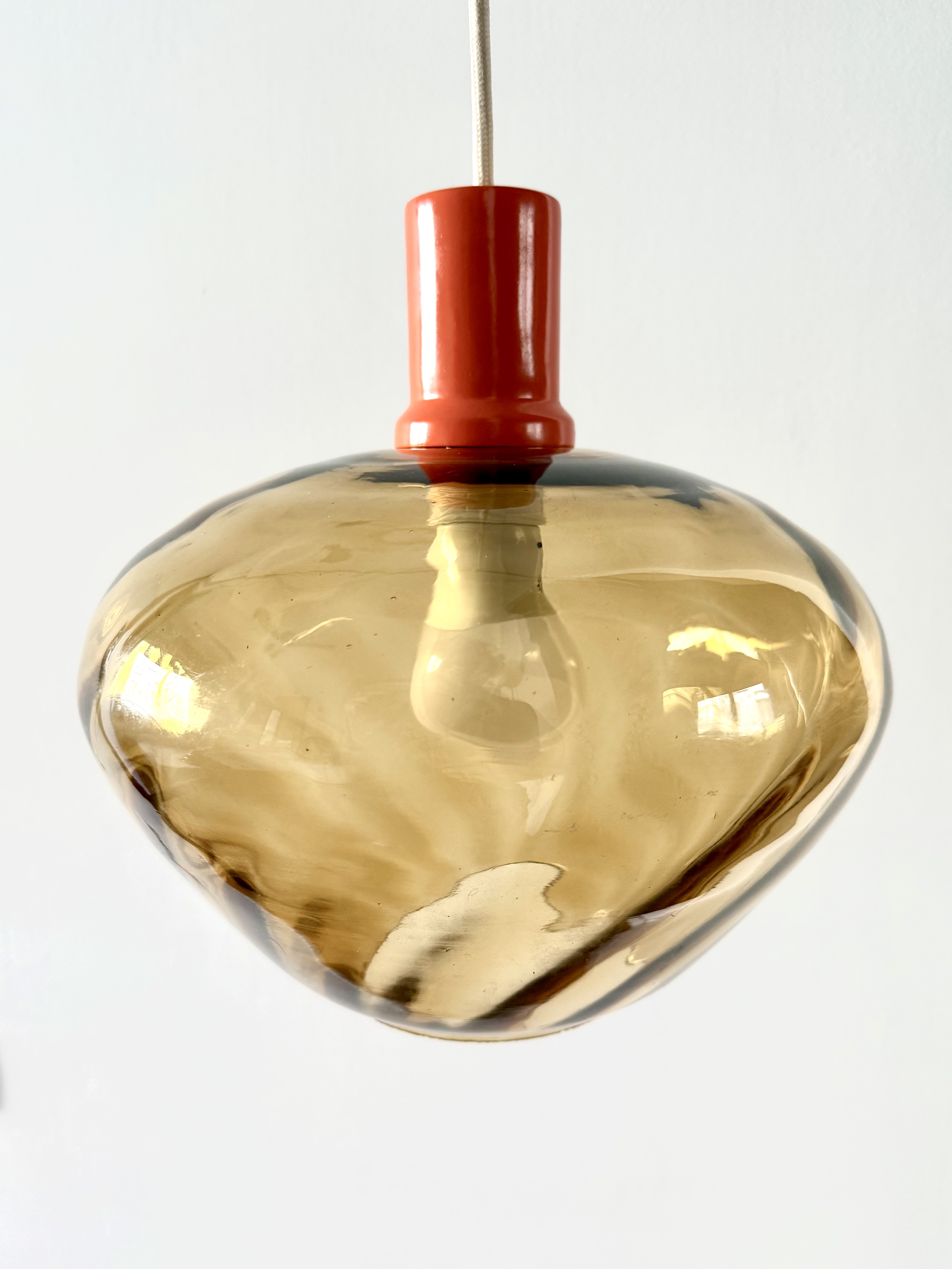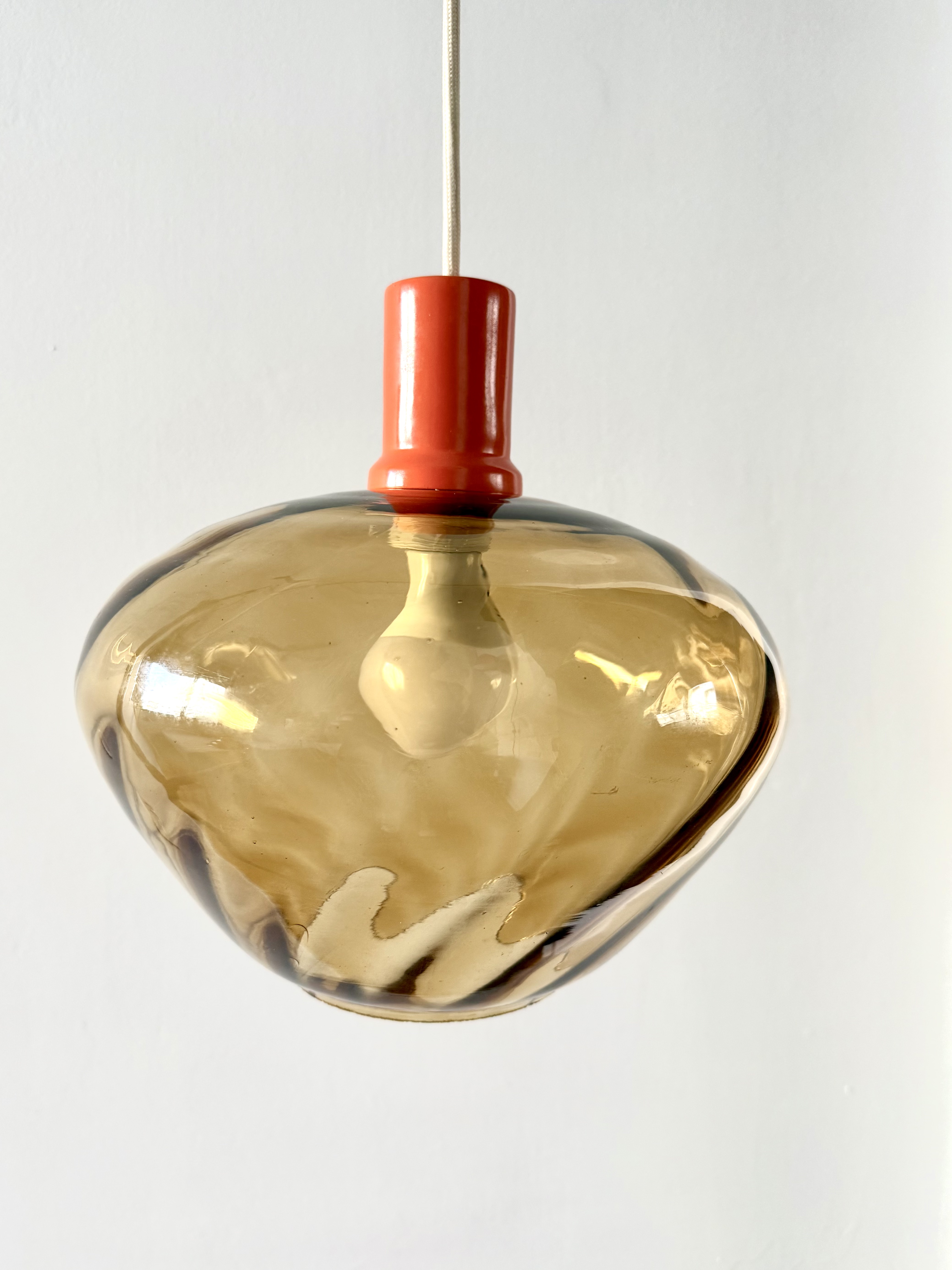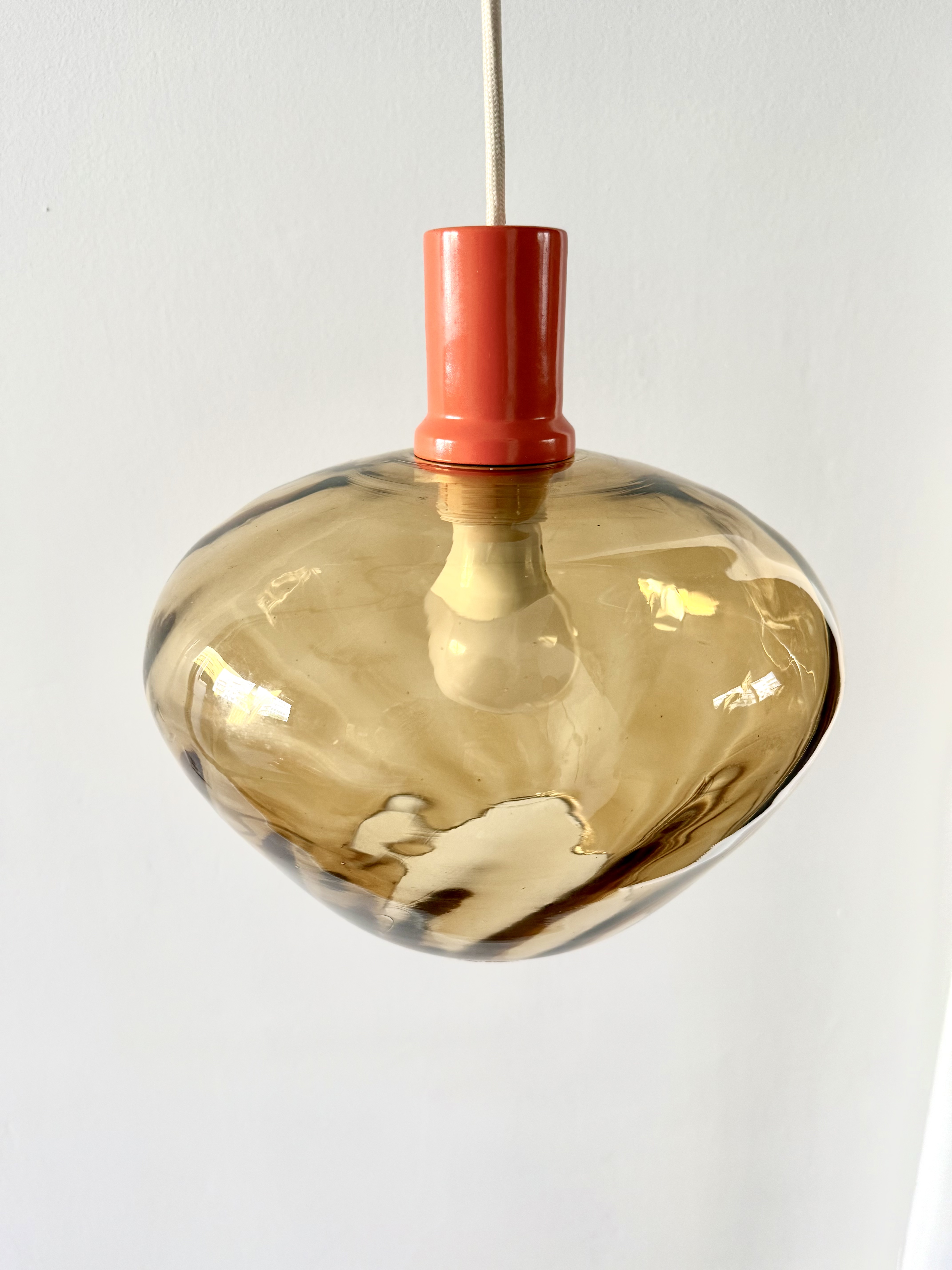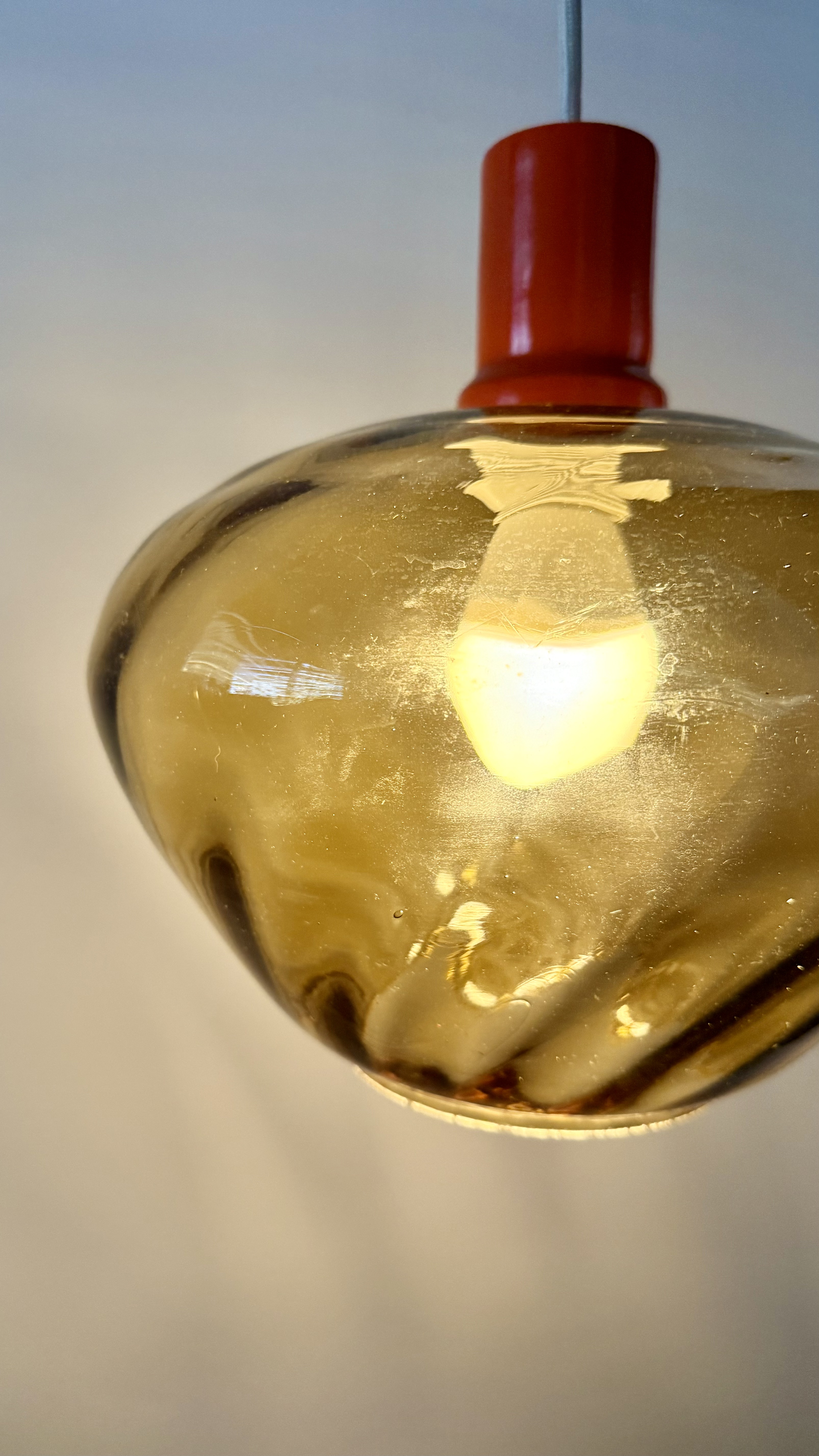 "Amber Pop" glass pendant lamp (1970s). The hand-blown amber glass creates a permanent golden-hour glow, warming the room with classic Hygge light. The glossy orange neck introduces a playful 1970s pop-art accent. Its organic onion/pumpkin form is typical of the era—sculptural when off, and sunset-warm when lit. Details: approx. 30 cm diameter. Materials: mouth-blown glass with a ceramic/plastic neck. Condition: excellent vintage, glass intact and glossy. Pickup: Tel Aviv, Ramat Hasharon, or Alon Abba.