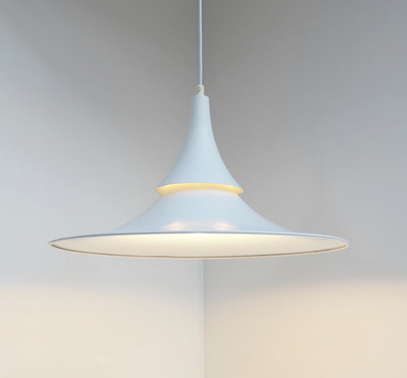 This stylish white pendant light is a classic example of Danish design from the 1970s, showcasing the sleek, minimalist aesthetic that has come to define Scandinavian lighting. Made by Hamalux, a notable Danish company, this fixture combines form and function seamlessly. The flared design, often referred to as a 'witch hat' shape, contributes to its unique and appealing silhouette, which was a popular style during the space age design movement. Crafted from durable metal and glass, it provides both direct and ambient lighting, making it suitable for dining areas or living spaces. During the 1970s, there was a fascination with modern, futuristic designs, and this pendant embodies that era's innovative approach to home decor. The white finish adds a touch of elegance and versatility, allowing it to blend with various interior styles. Collectors and enthusiasts of mid-century modern design highly value such pieces, especially when they retain their original condition. Its Danish origin reflects the country's long-standing tradition of craftsmanship and quality in furniture and lighting design. The pendant's understated yet sophisticated design speaks volumes about the era's taste for simplicity and practicality, while still making a bold visual statement.