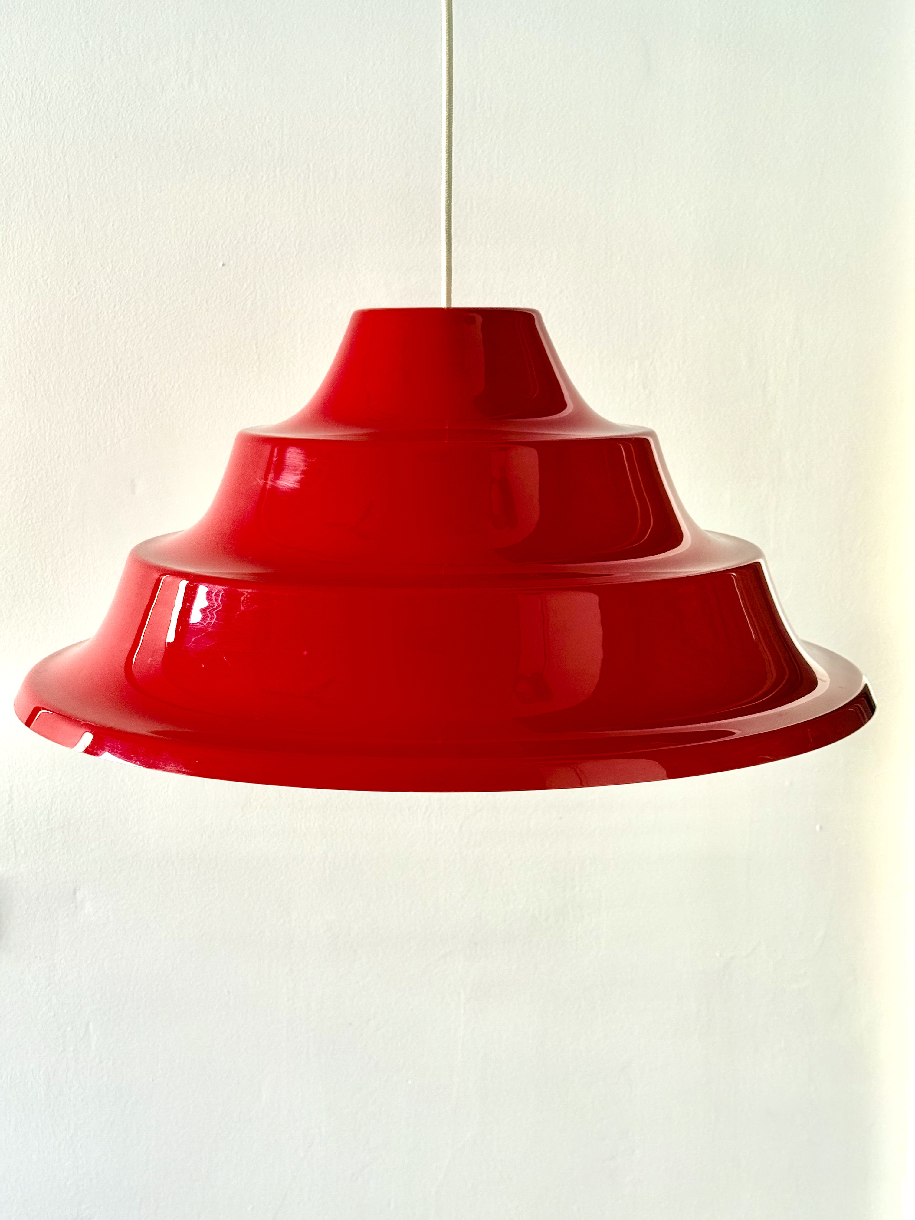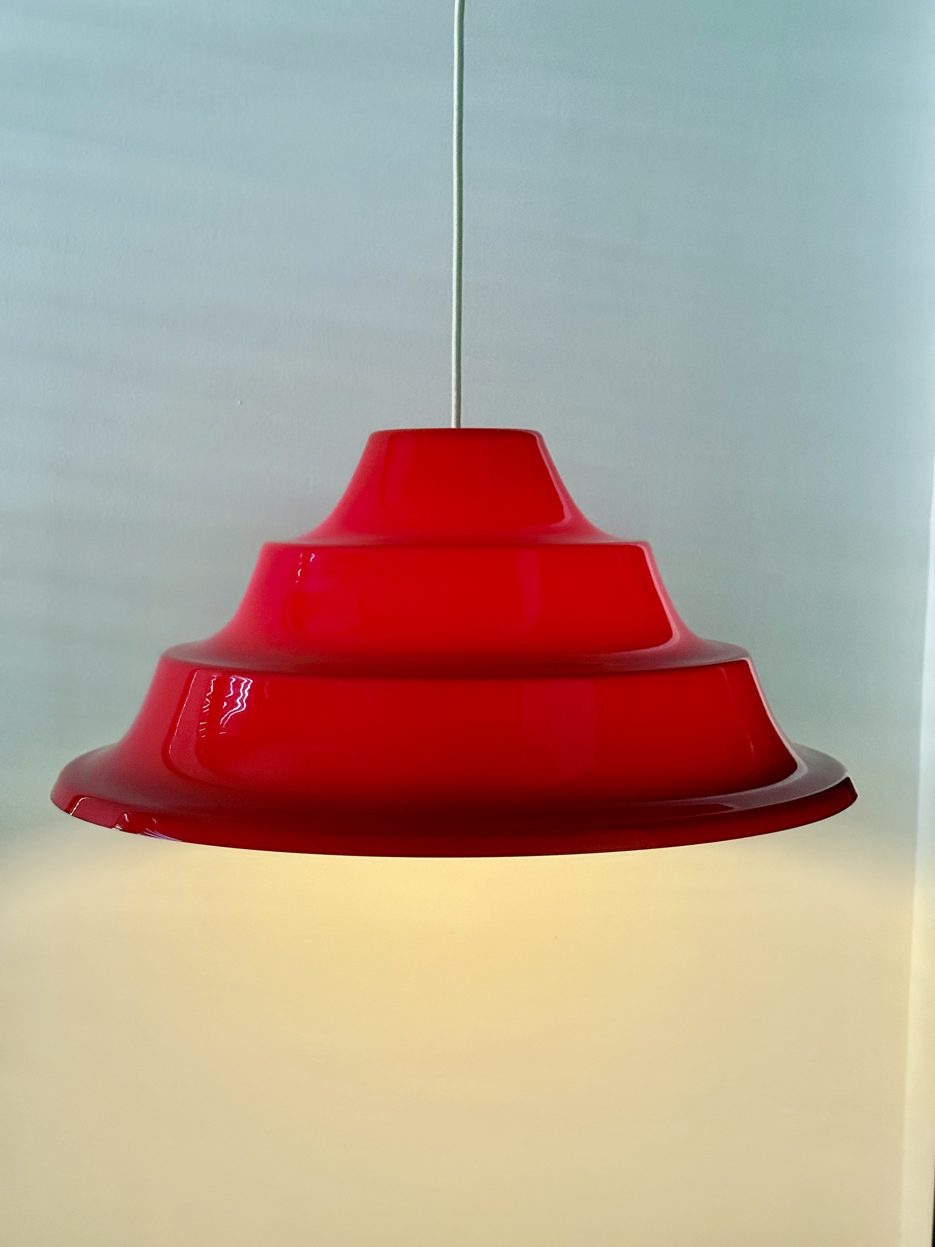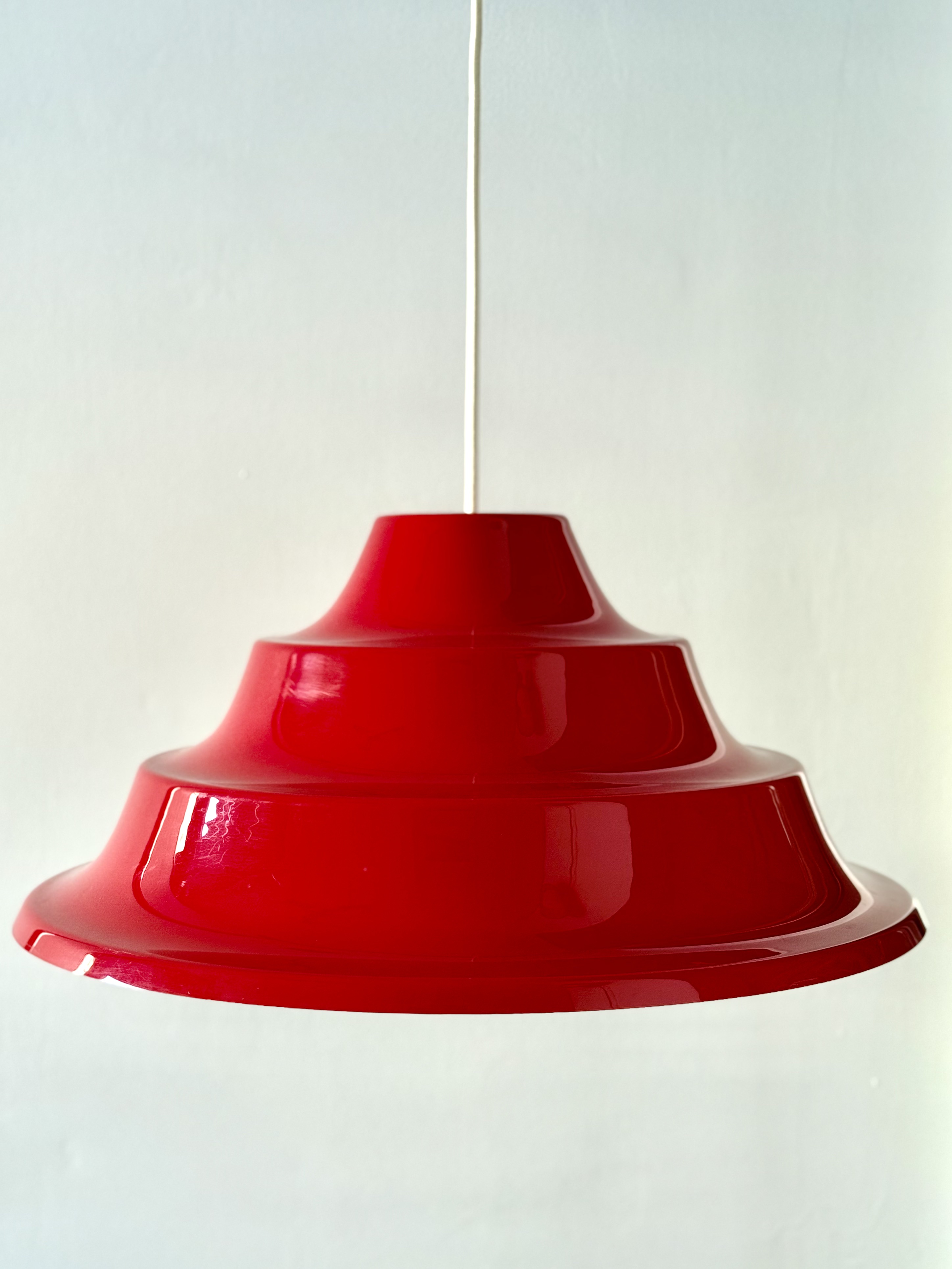 In the 1970s, Denmark was immersed in an intoxicating blend of technological optimism and revolutionary aspirations. On one hand, the Space Age was at its peak; humanity had walked on the moon, and there was a palpable feeling that we were on our way to conquering the stars. The aesthetics of this era abandoned straight, rigid lines in favor of amorphous, rounded, and "spaceship-like" forms—everything looked like spaceship parts or astronaut helmets. This lamp, with its tiered and futuristic shape, is the embodiment of that promise of a new and exciting world. Simultaneously, the streets were stormy. The student generation of '68 brought with it a fresh Marxist breeze; eyes turned eastward, to communes in China and to Vietnam, and young Danes dreamed of social justice and workers' liberation. They traveled to volunteer on kibbutzim in Israel to learn what true equality looked like and returned to Denmark with a passion to change the class structure. The choice of acrylic (plastic) for the lamp was both a political and material statement. Plastic was perceived as the ultimate modern material: it enabled industrial production for the masses, and unlike opaque metal, acrylic could transmit light through it, creating a soft halo and turning the lighting fixture into a glowing sculpture. It shattered the exclusivity of aristocratic crystal and copper and made high aesthetics accessible to every home in the welfare state. The vibrant red color completes this story dramatically. It is a double homage—both to the traditional colors of the Danish flag and to the color of the socialist revolution. An entire generation of intellectuals chose to bring this bold red into the domestic space to declare that change begins in the living room. This is the thrilling moment of transition from restrained and conservative Scandinavian modernism to playful postmodernism; a period when the lamp ceased to be merely a functional object and became a bold, uninhibited pop-art item. From an engineering perspective, its tiered form is a masterful work of classic Danish light design. The structure is built from layers designed to capture the light beam and diffuse it with precise softness downward and to the sides, creating an "island" of intimacy and warmth within the space while preventing glare from any angle. With an impressive diameter of 55 cm, it is not just a lighting fixture but a magnetic presence that holds the entire room. It tells a story of an era when people truly believed that design, color, and material could create a more just and moving world.