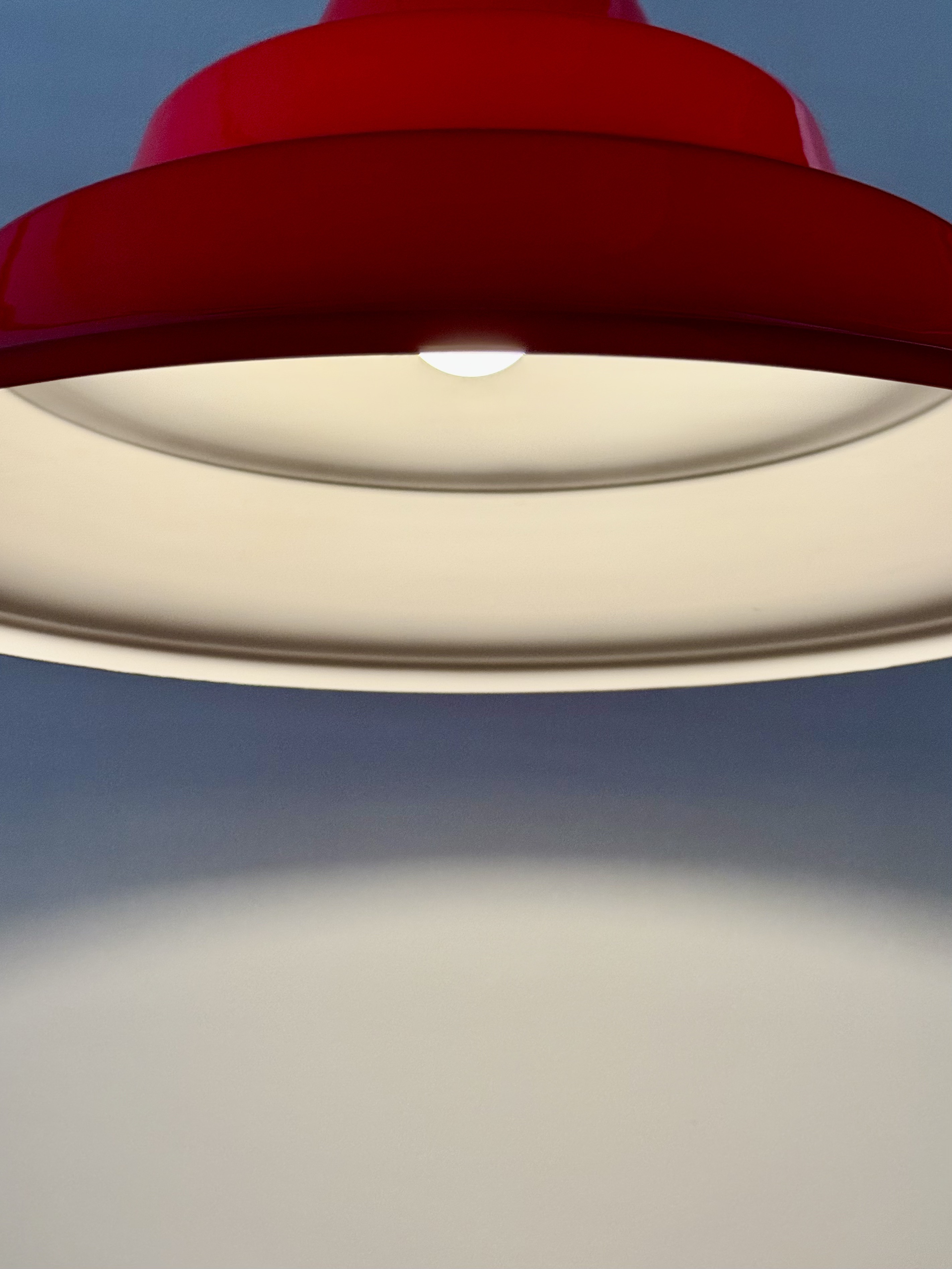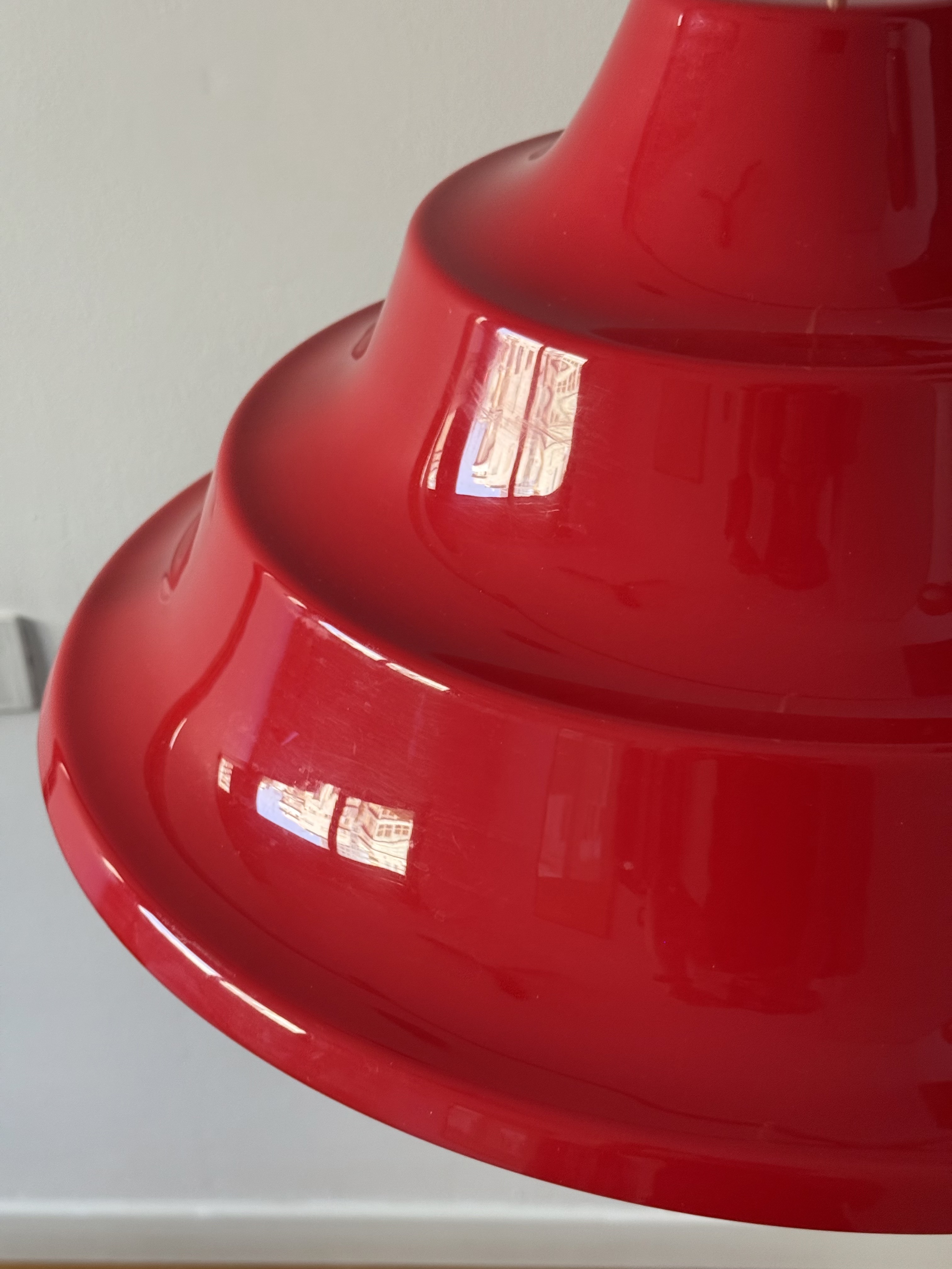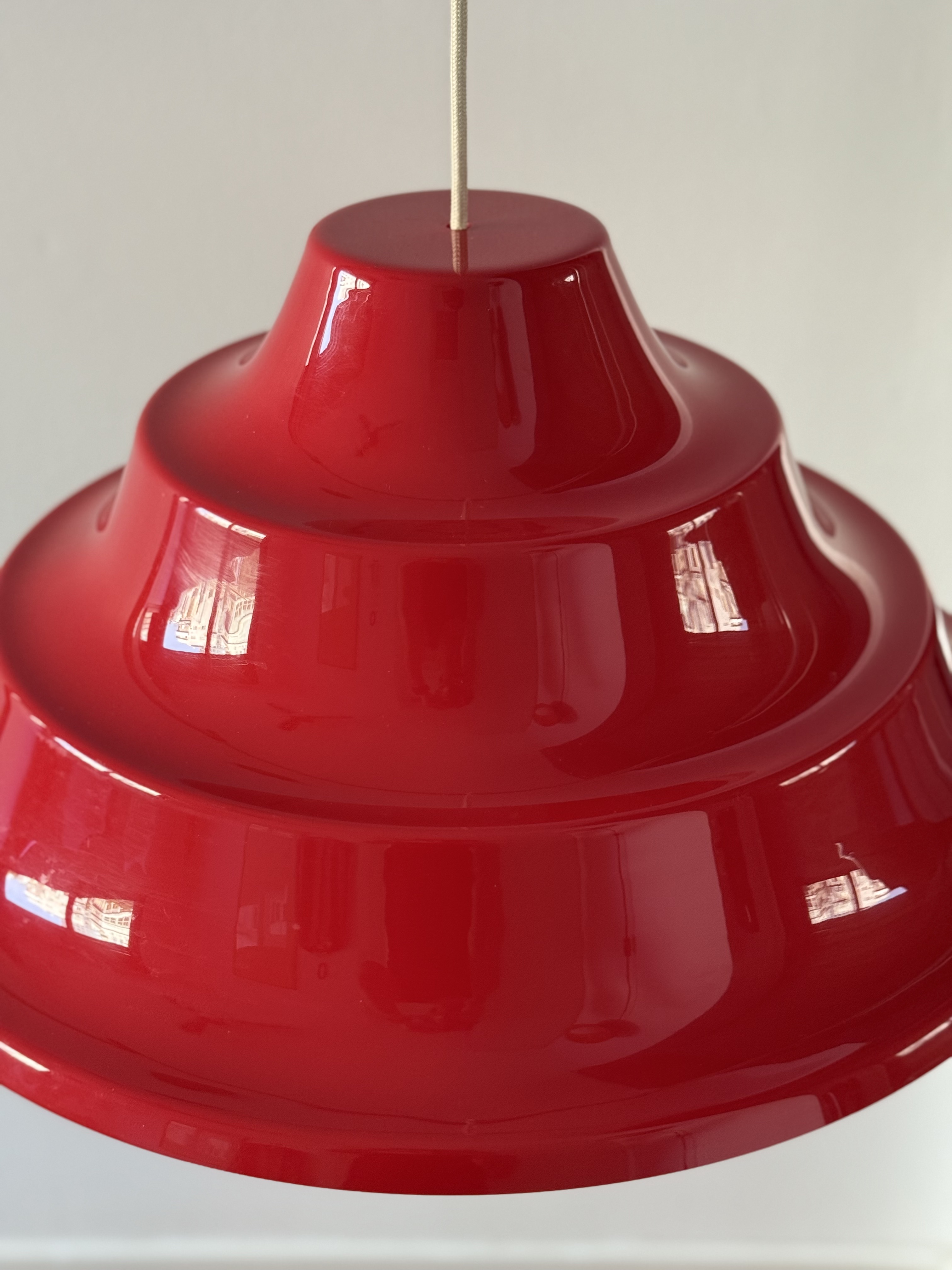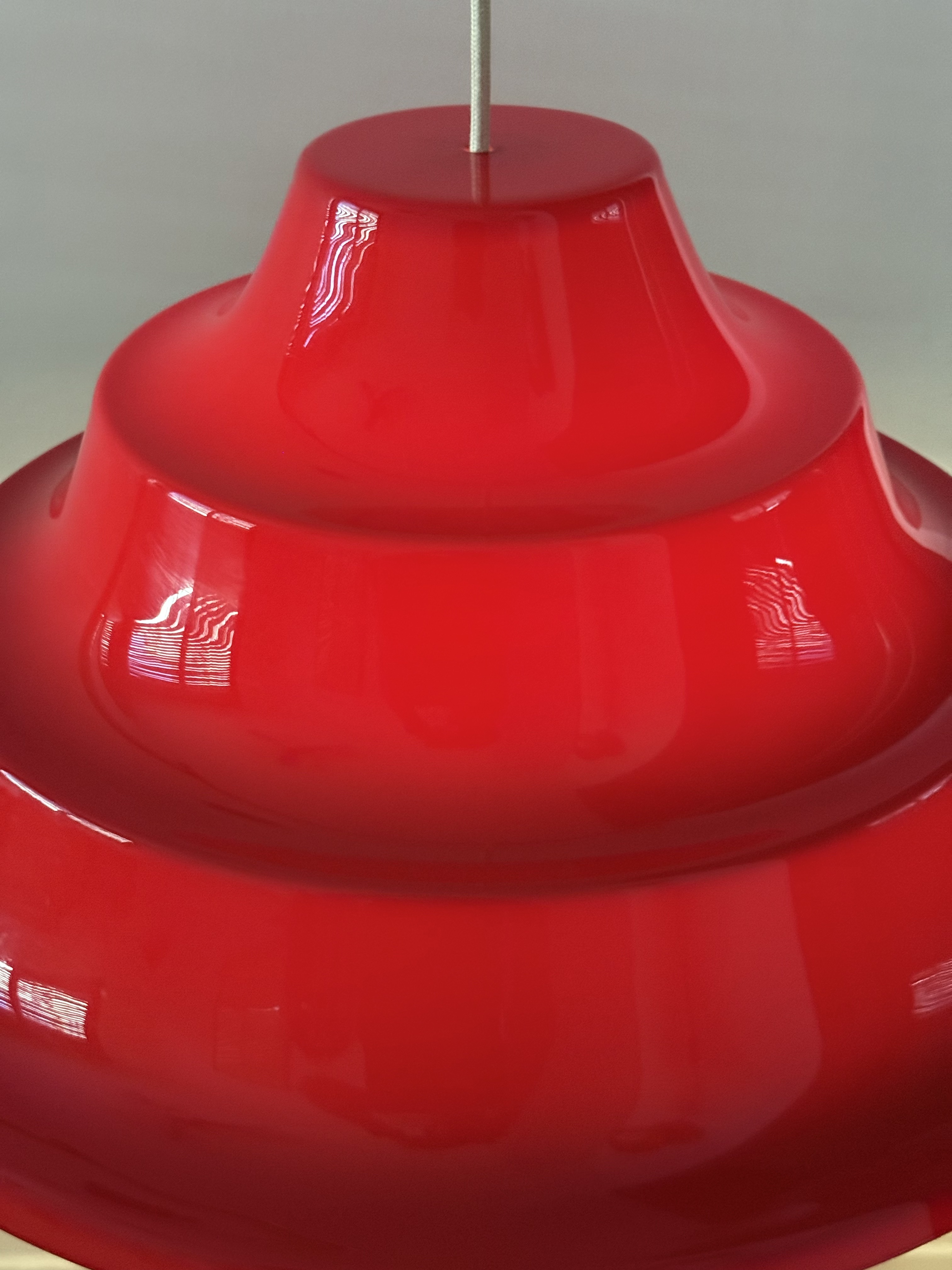 In the 1970s, Denmark was immersed in an intoxicating blend of technological optimism and revolutionary aspirations. On one hand, the Space Age was at its peak; humanity had walked on the moon, and there was a palpable feeling that we were on our way to conquering the stars. The aesthetics of this era abandoned straight, rigid lines in favor of amorphous, rounded, and "spaceship-like" forms—everything looked like spaceship parts or astronaut helmets. This lamp, with its tiered and futuristic shape, is the embodiment of that promise of a new and exciting world. Simultaneously, the streets were stormy. The student generation of '68 brought with it a fresh Marxist breeze; eyes turned eastward, to communes in China and to Vietnam, and young Danes dreamed of social justice and workers' liberation. They traveled to volunteer on kibbutzim in Israel to learn what true equality looked like and returned to Denmark with a passion to change the class structure. The choice of acrylic (plastic) for the lamp was both a political and material statement. Plastic was perceived as the ultimate modern material: it enabled industrial production for the masses, and unlike opaque metal, acrylic could transmit light through it, creating a soft halo and turning the lighting fixture into a glowing sculpture. It shattered the exclusivity of aristocratic crystal and copper and made high aesthetics accessible to every home in the welfare state. The vibrant red color completes this story dramatically. It is a double homage—both to the traditional colors of the Danish flag and to the color of the socialist revolution. An entire generation of intellectuals chose to bring this bold red into the domestic space to declare that change begins in the living room. This is the thrilling moment of transition from restrained and conservative Scandinavian modernism to playful postmodernism; a period when the lamp ceased to be merely a functional object and became a bold, uninhibited pop-art item. From an engineering perspective, its tiered form is a masterful work of classic Danish light design. The structure is built from layers designed to capture the light beam and diffuse it with precise softness downward and to the sides, creating an "island" of intimacy and warmth within the space while preventing glare from any angle. With an impressive diameter of 55 cm, it is not just a lighting fixture but a magnetic presence that holds the entire room. It tells a story of an era when people truly believed that design, color, and material could create a more just and moving world.