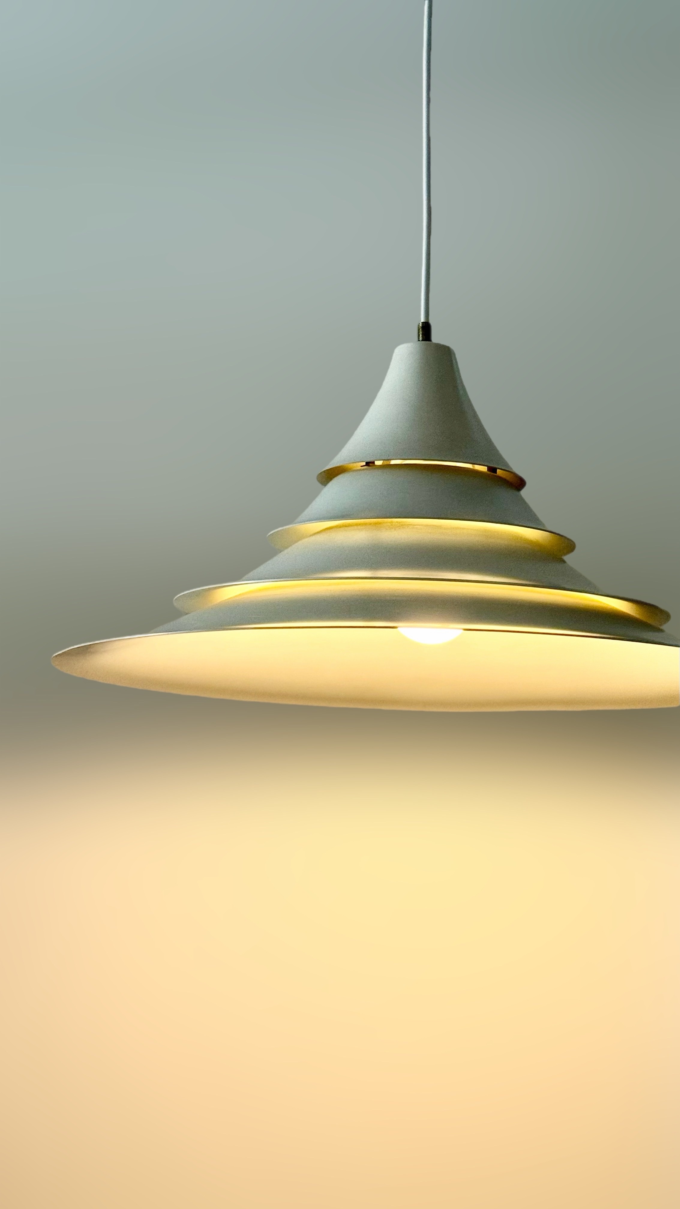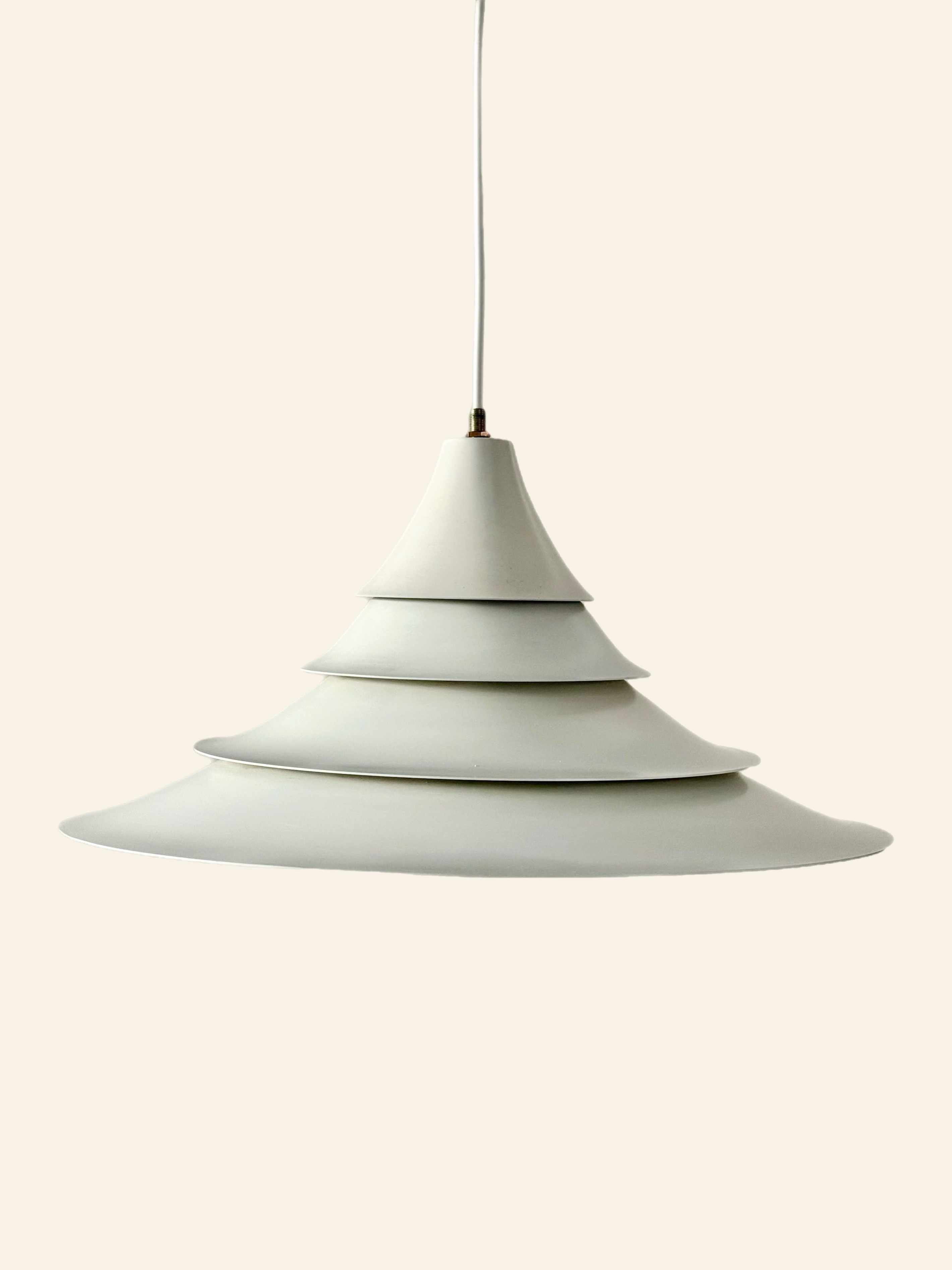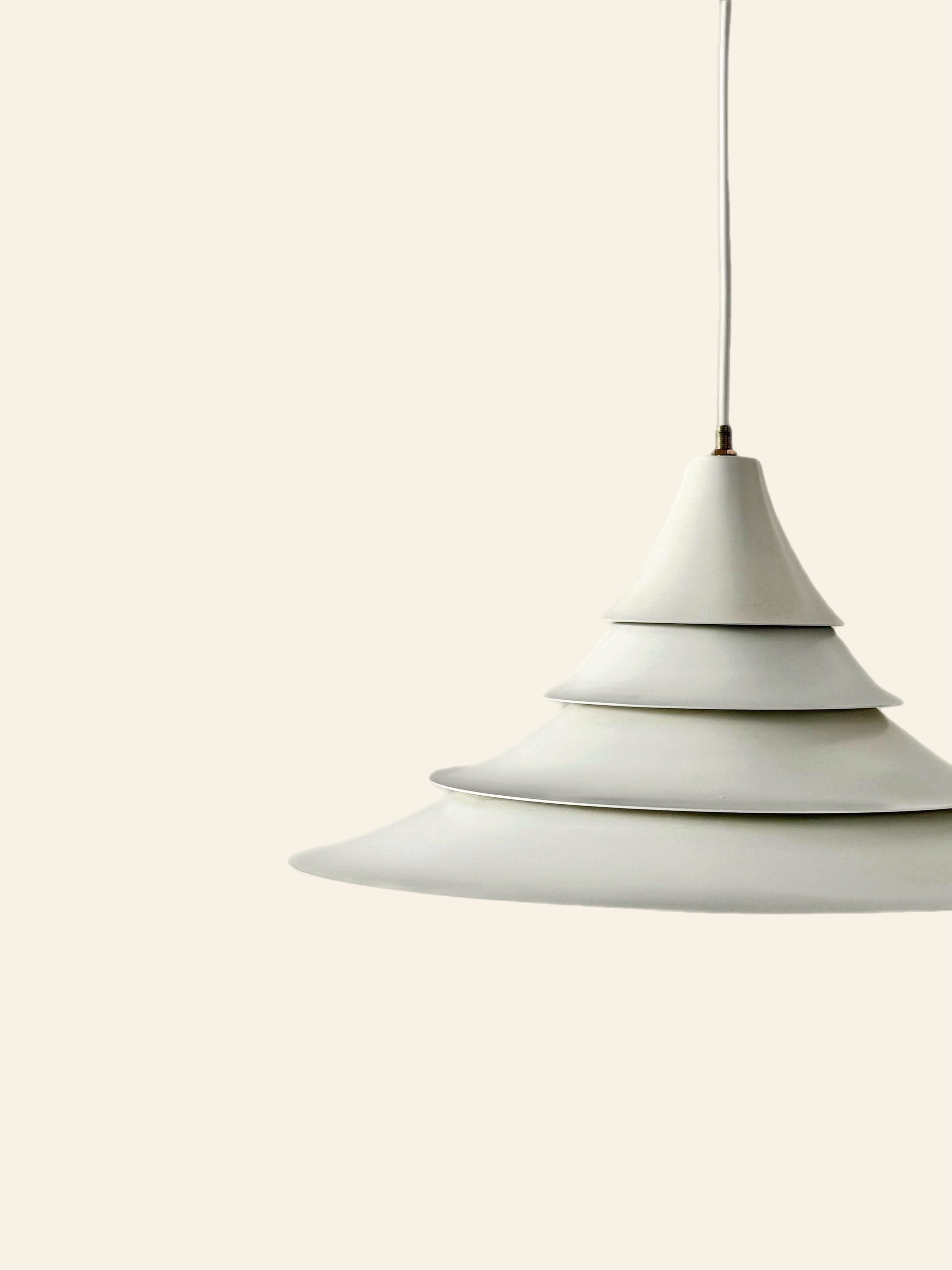 In the early 1980s, when the design world began turning to bold colors and daring forms, Nordisk Solar Compagni chose instead to deepen the quiet Danish tradition. The company, which actually started by manufacturing electric clocks and radios, became an institution of "light engineering" in the second half of the 20th century. The Pagode is a prime example of this philosophy: an attempt to sculpt light, not just the lamp. Designer Jørgen Ricardoni didn't try to create just any lighting fixture but to solve the eternal challenge of Nordic lighting: how to illuminate a room powerfully without blinding the eye? His solution was architectural. Inspired by Far Eastern temple roofs (hence the name "Pagode"), he created a system of five aluminum rings stacked one above the other. This structure wasn't designed just for beauty; it's a precise light machine. Each ring is painted in brilliant white on its interior to break and soften the light, while the gaps between layers allow light to "spill" outward and wash the lamp itself in a soft halo. The result is fully functional lighting above the dining table that feels like a giant, calming candle in the evening hours. This is a collector's item for those who understand that lighting is the architecture of the home. Unlike many lamps from that era that faded or warped, this Pagode has survived in excellent vintage condition, testament to Solar's uncompromising production quality. Perfect for those seeking design tranquility and Danish light quality above the dining area or in the center of the living room.
