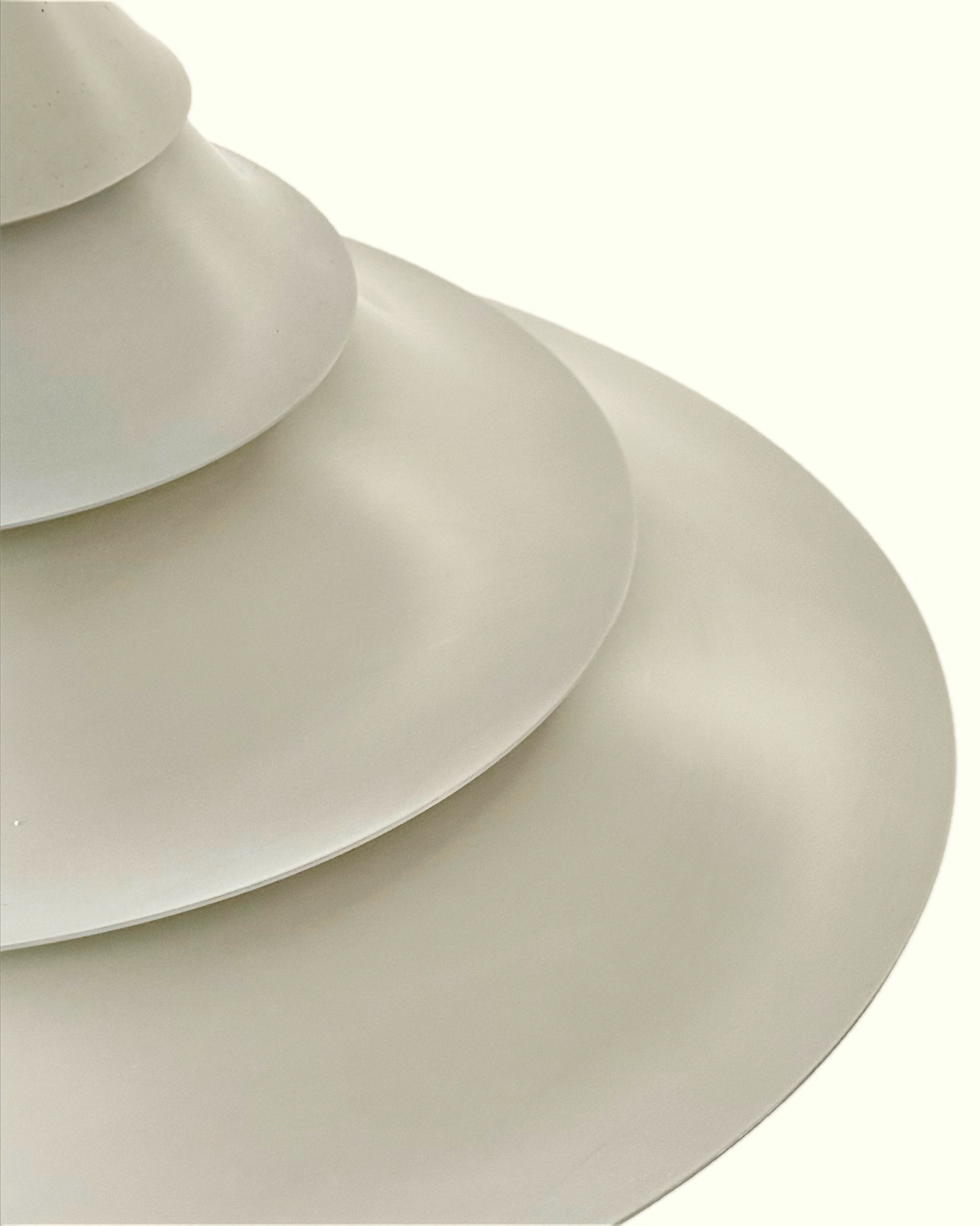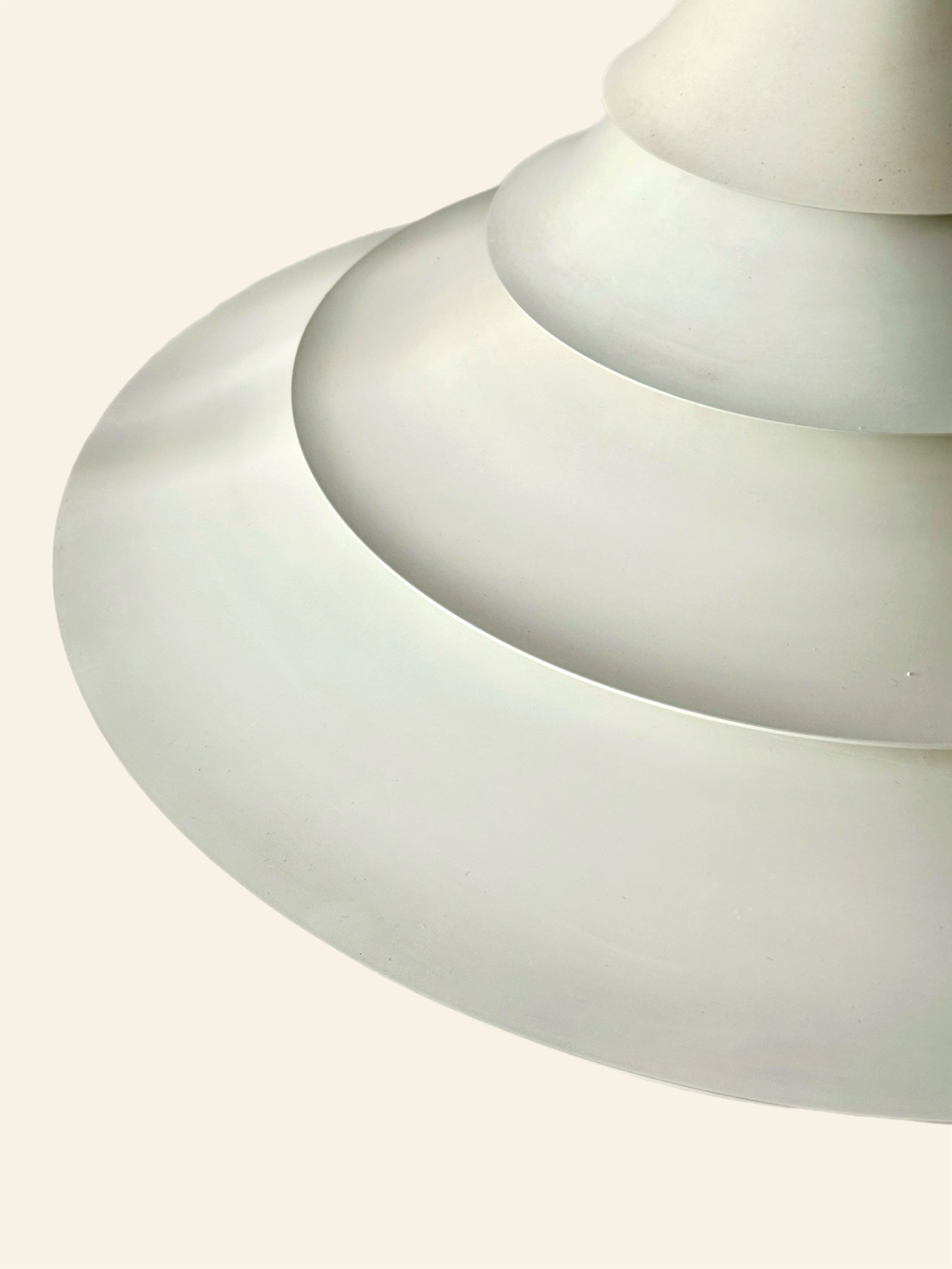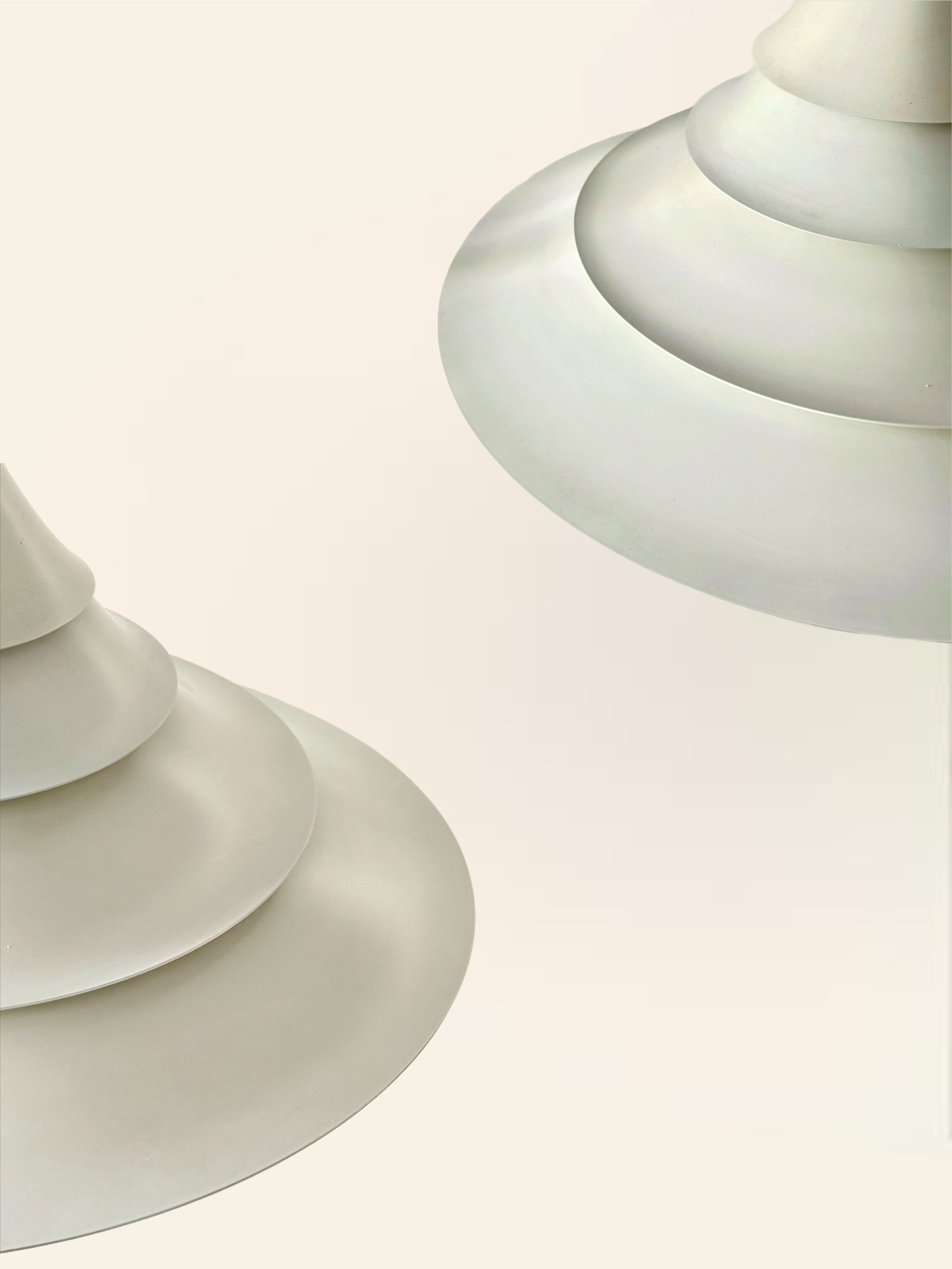 In the early 1980s, when the design world began turning to bold colors and daring forms, Nordisk Solar Compagni chose instead to deepen the quiet Danish tradition. The company, which actually started by manufacturing electric clocks and radios, became an institution of "light engineering" in the second half of the 20th century. The Pagode is a prime example of this philosophy: an attempt to sculpt light, not just the lamp. Designer Jørgen Ricardoni didn't try to create just any lighting fixture but to solve the eternal challenge of Nordic lighting: how to illuminate a room powerfully without blinding the eye? His solution was architectural. Inspired by Far Eastern temple roofs (hence the name "Pagode"), he created a system of five aluminum rings stacked one above the other. This structure wasn't designed just for beauty; it's a precise light machine. Each ring is painted in brilliant white on its interior to break and soften the light, while the gaps between layers allow light to "spill" outward and wash the lamp itself in a soft halo. The result is fully functional lighting above the dining table that feels like a giant, calming candle in the evening hours. This is a collector's item for those who understand that lighting is the architecture of the home. Unlike many lamps from that era that faded or warped, this Pagode has survived in excellent vintage condition, testament to Solar's uncompromising production quality. Perfect for those seeking design tranquility and Danish light quality above the dining area or in the center of the living room.