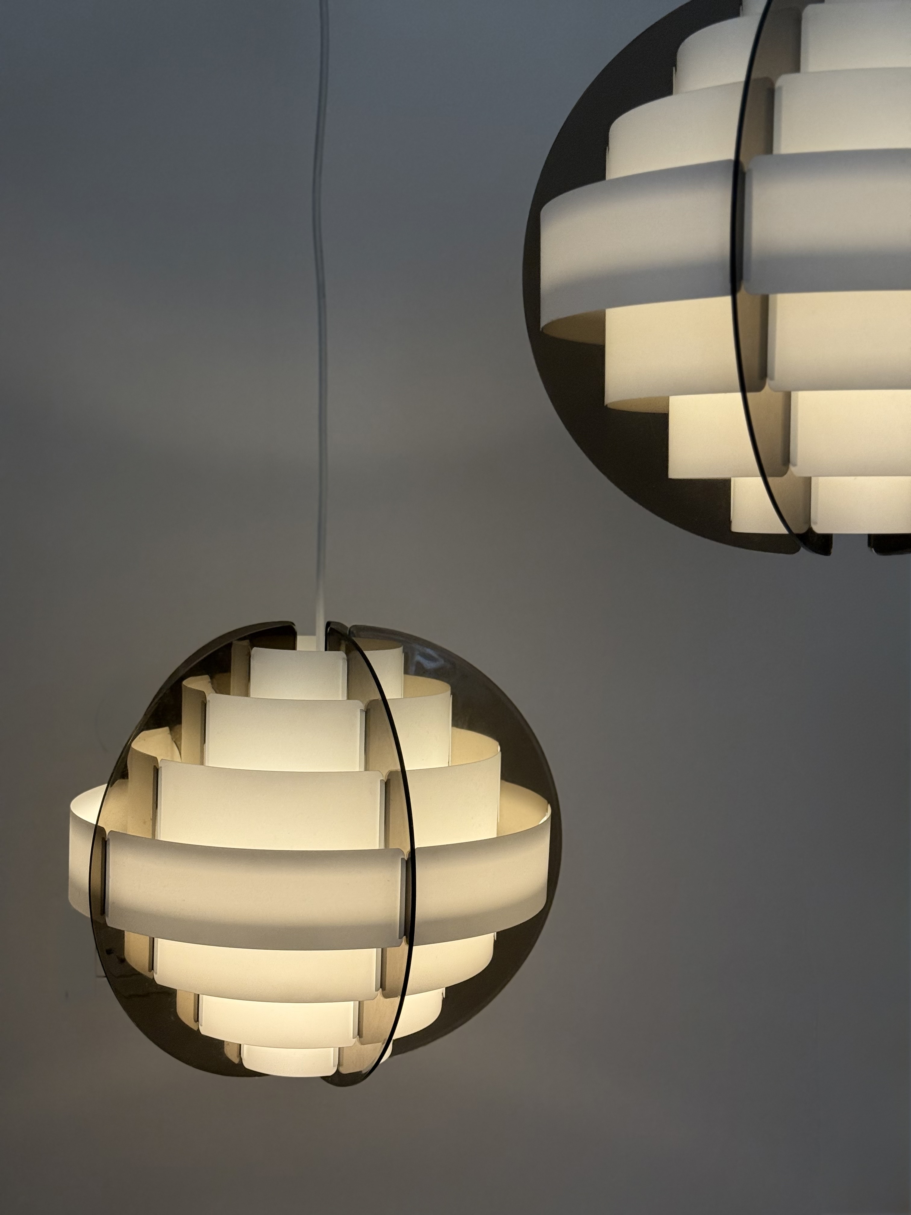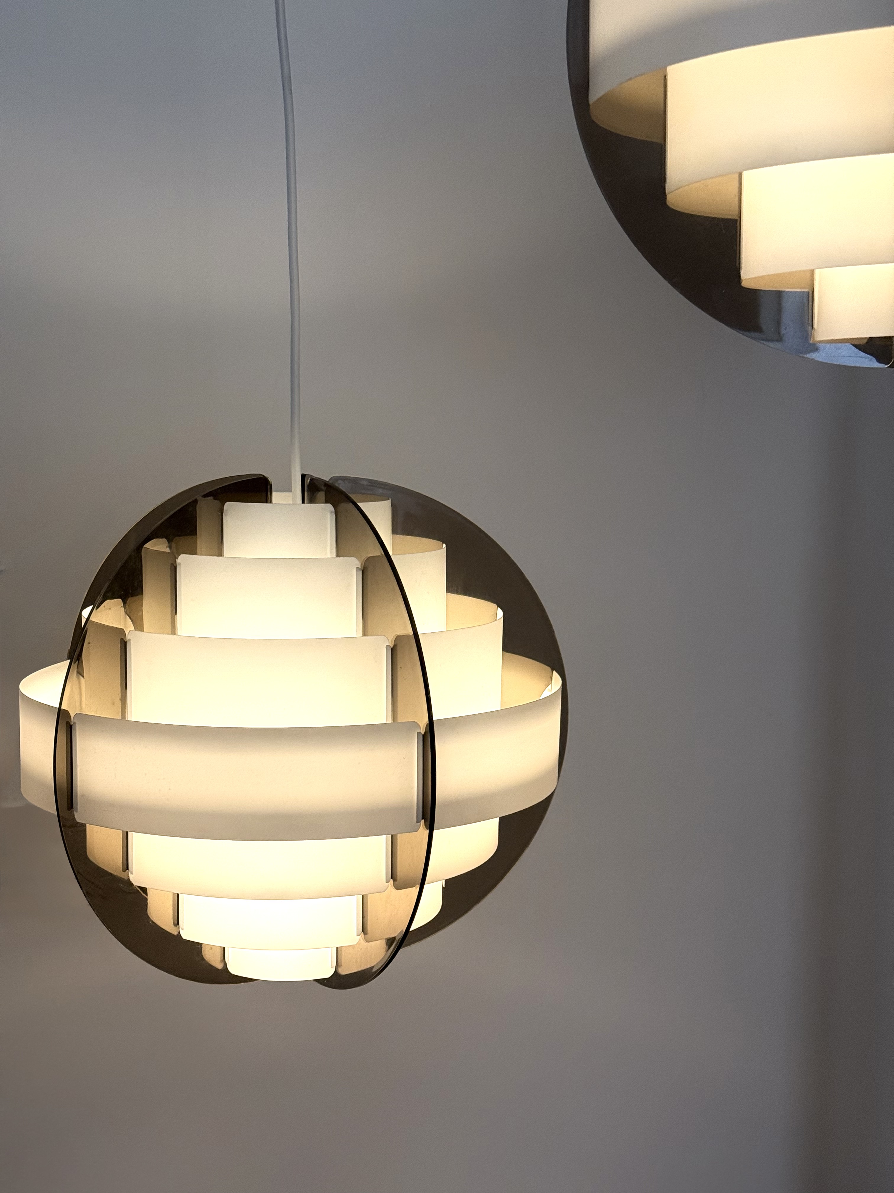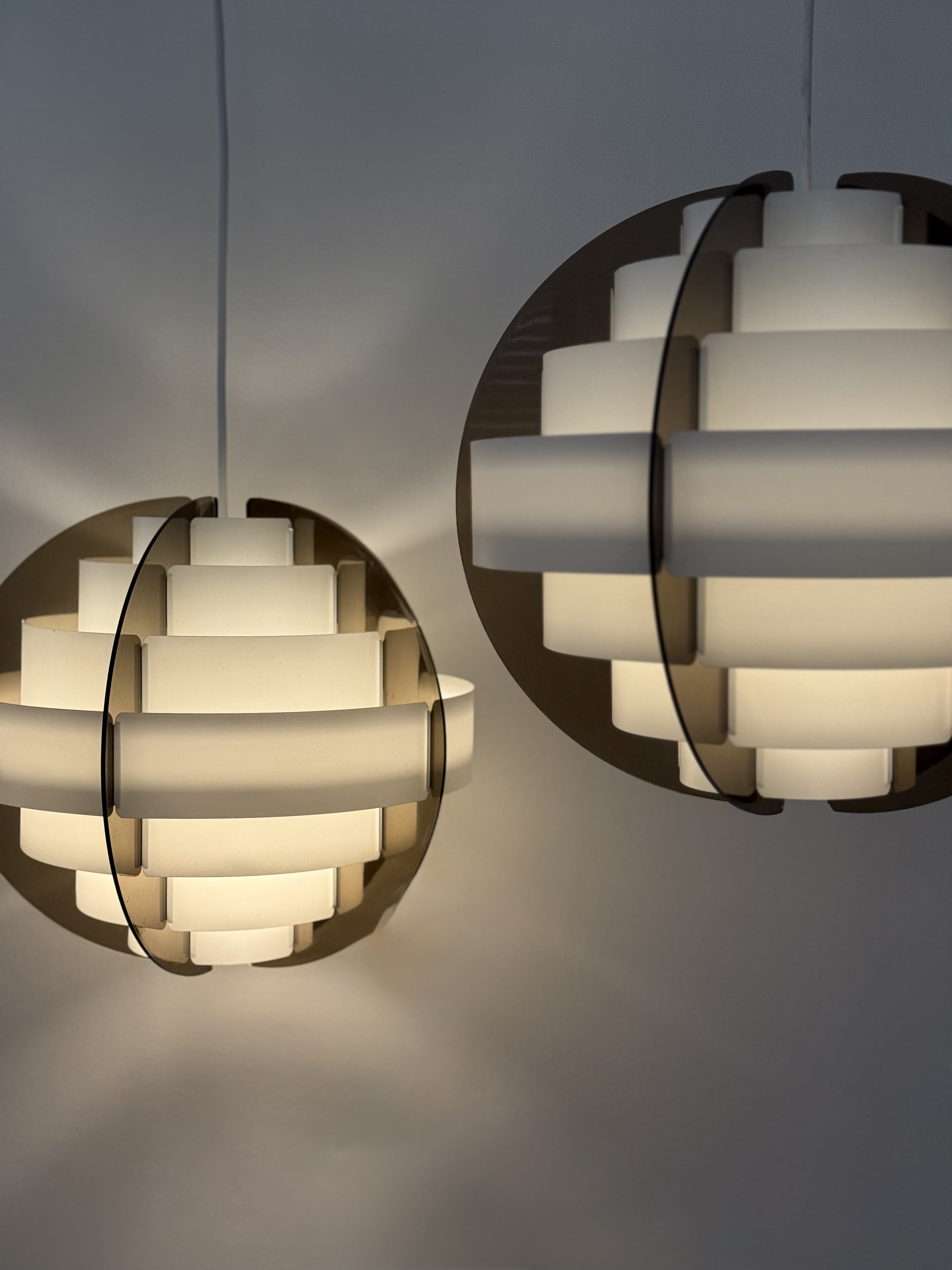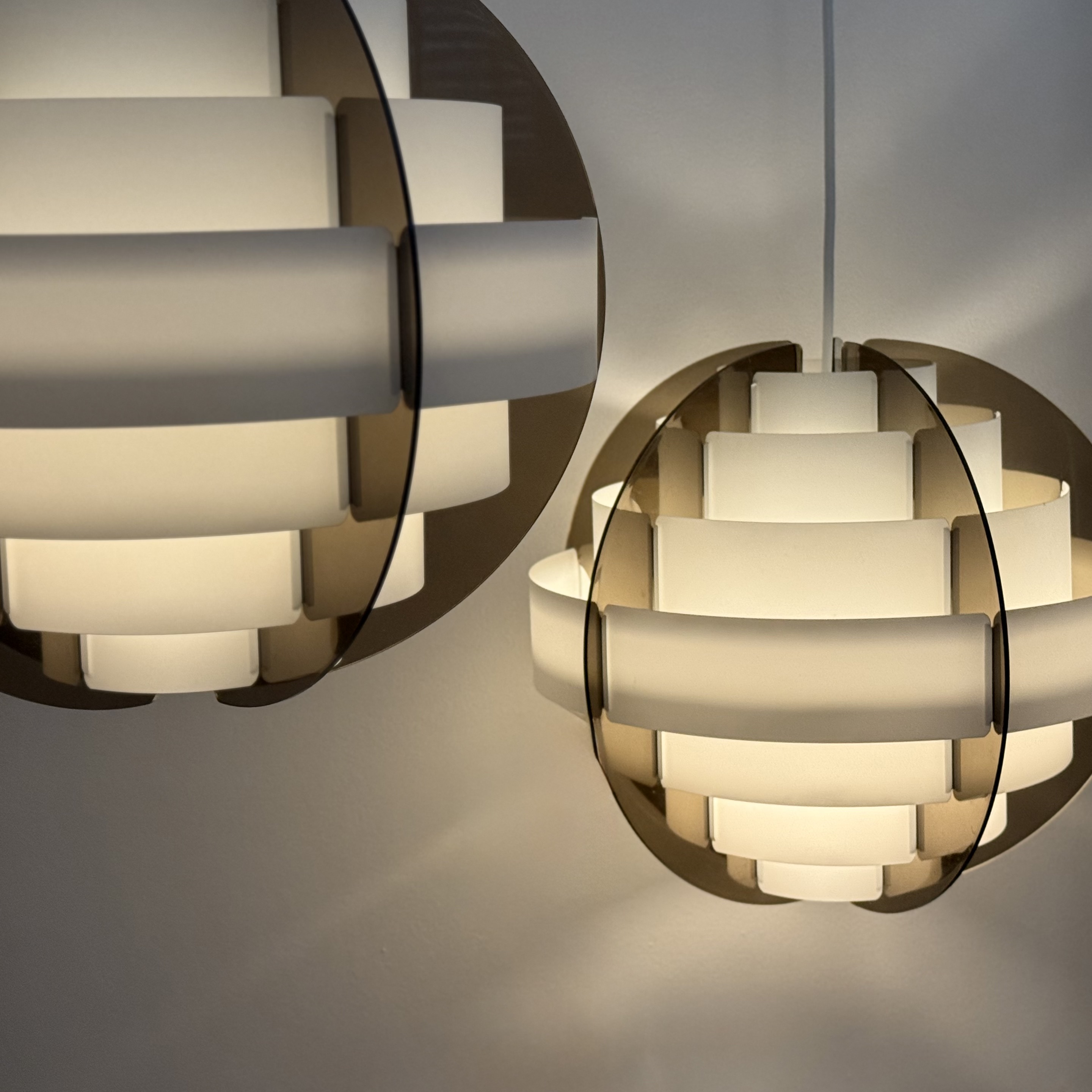 In the 1970s, when Denmark was searching for new ways to think about light and material, two young designers from Frederiksberg presented an idea considered radical at the time. Brylle & Jacobsen proposed a lamp that doesn't come as a finished product, but as an assembly kit. The idea was simple and clever: dozens of white plastic strips that lock into each other and create a precise optical form that softens the light. Around them, a smoked acrylic frame holds everything in clean and clear tension. This approach made Strips a milestone. It was one of the first lamps in the world sold as flat-pack. Decades before a global furniture giant made the method standard, Quality System already made it democratic and accessible. The design was so successful that in the 1990s, IKEA purchased the copyright and released a renewed version called Lakene. Strips has something timeless: a connection between technical innovation and the softness of light. The white strips break the glare and diffuse warm, quiet light. The smoked acrylic gives depth and form. The result is modern yet delicate, iconic yet not loud. The two lamps I found come from Danish village homes. Original from the period, preserved in an unusual way, without distortions and without scratches. True and good vintage condition. Perfect for a dining area, living room, or office seeking soft, modernist light.