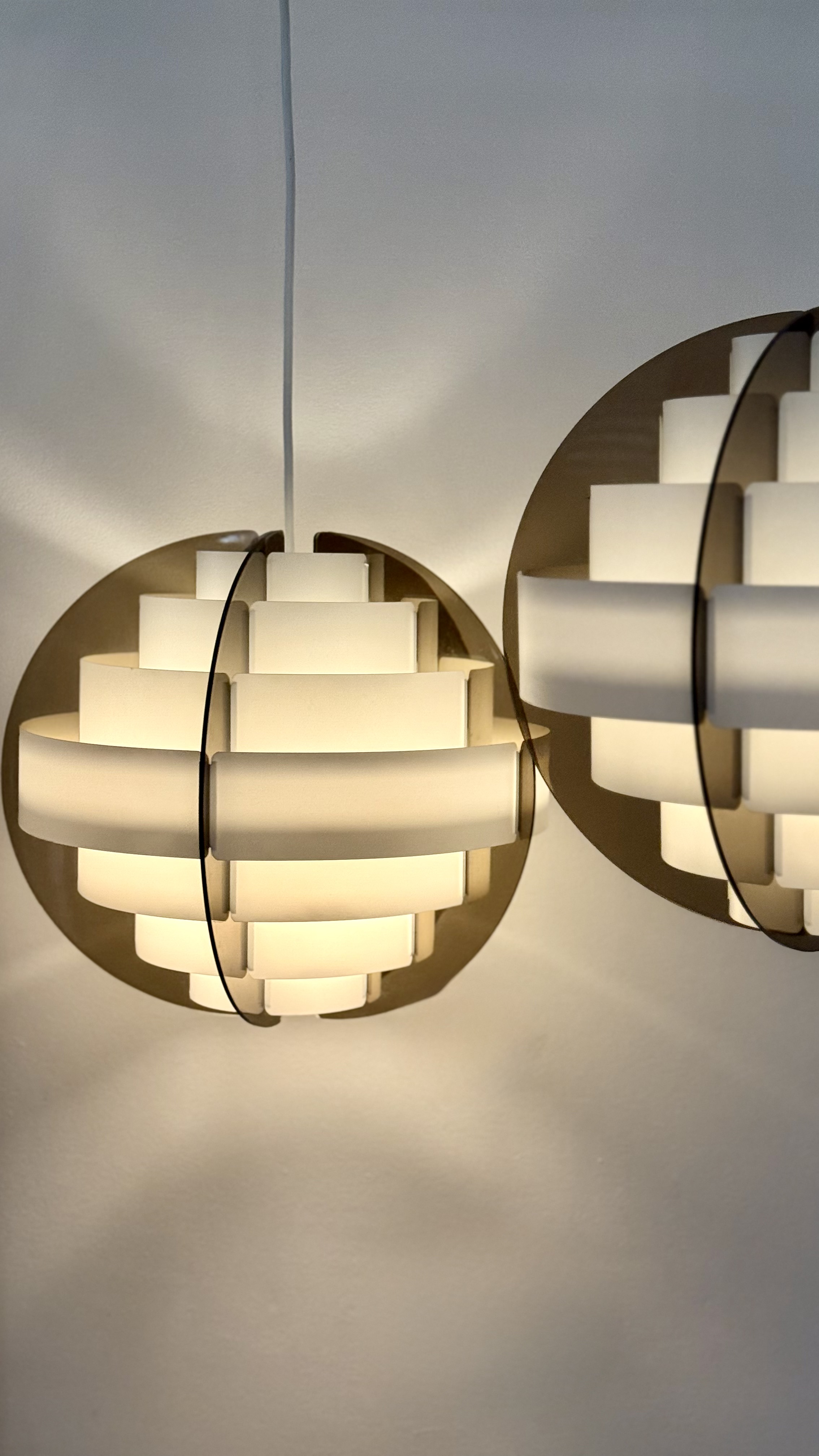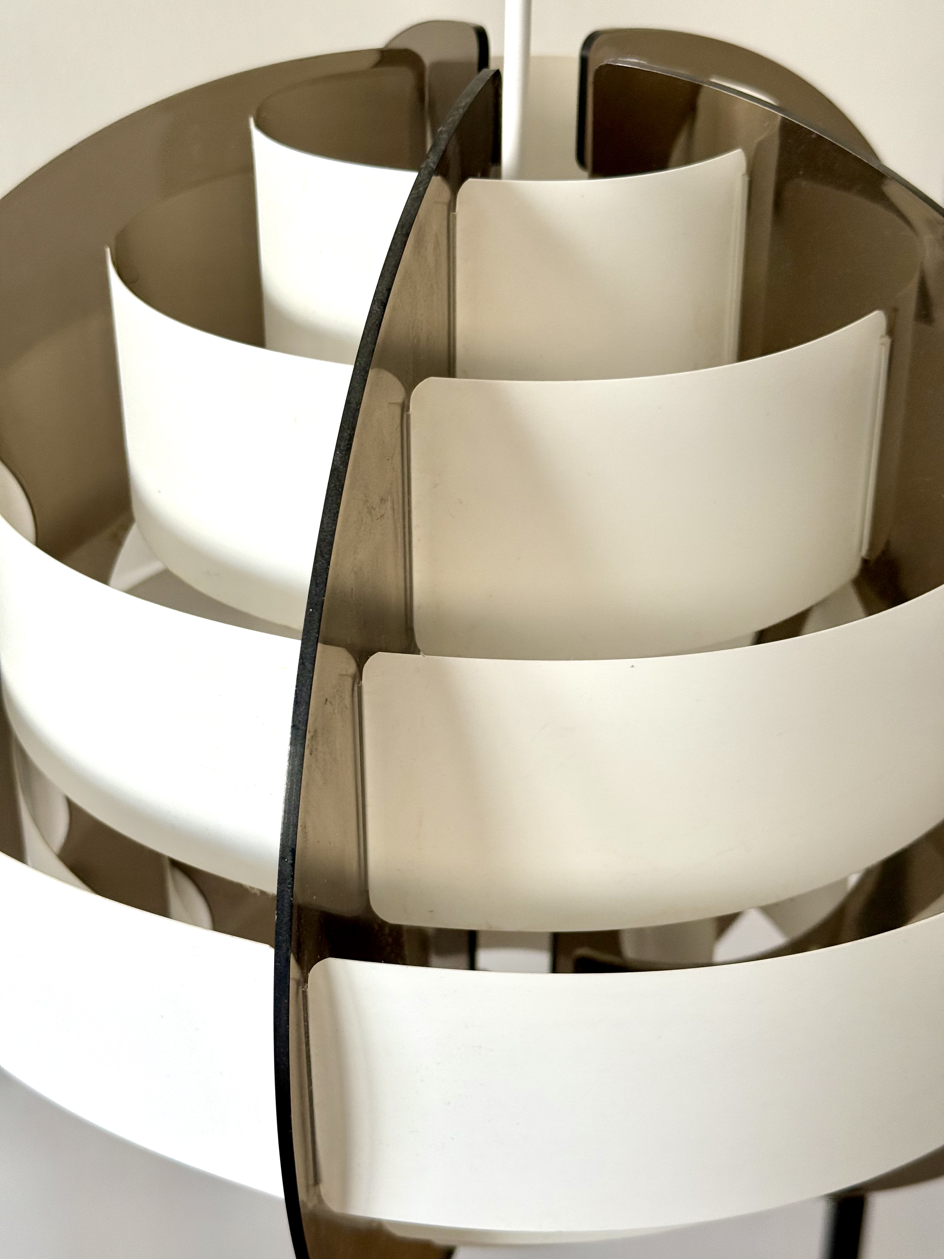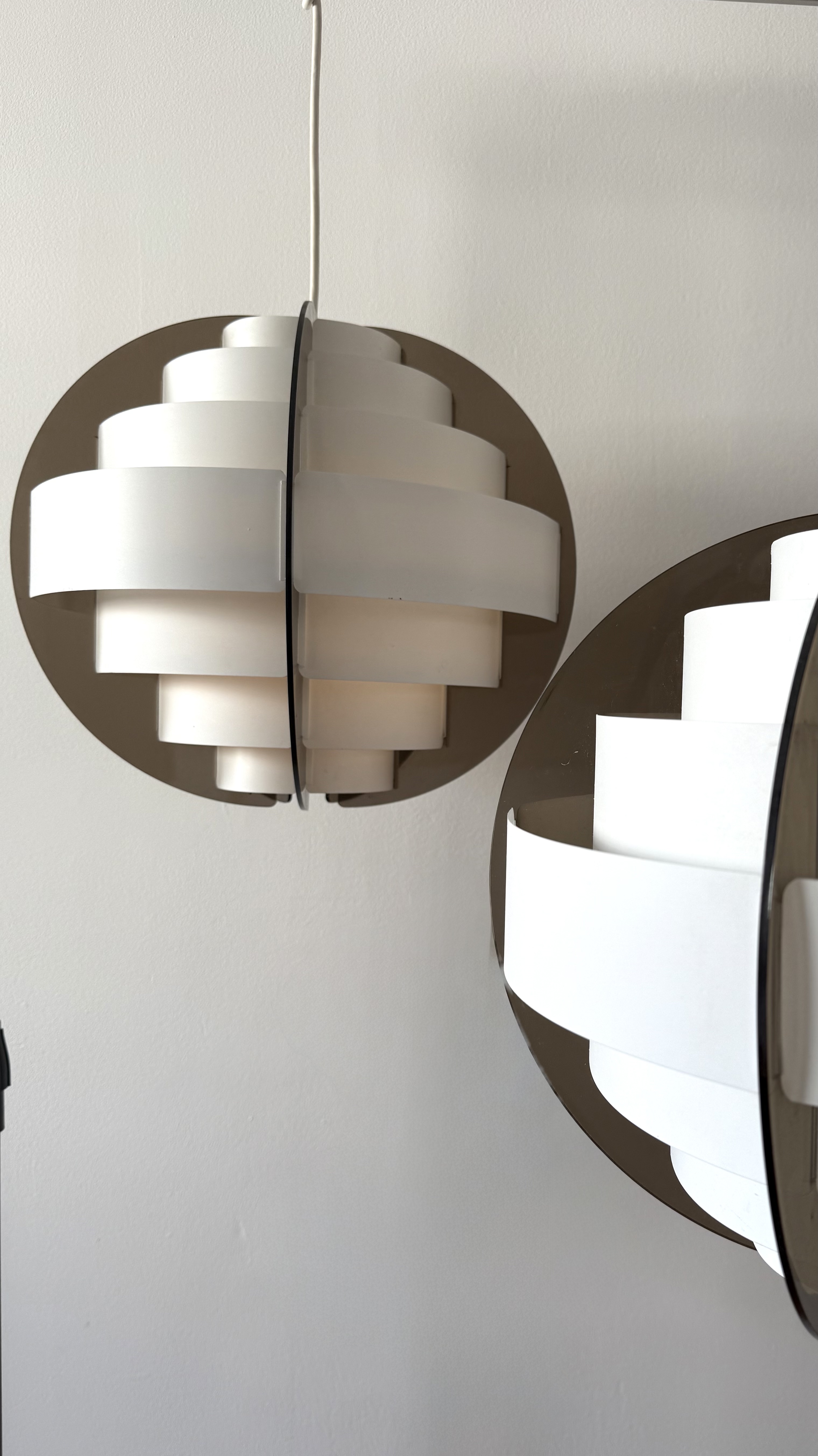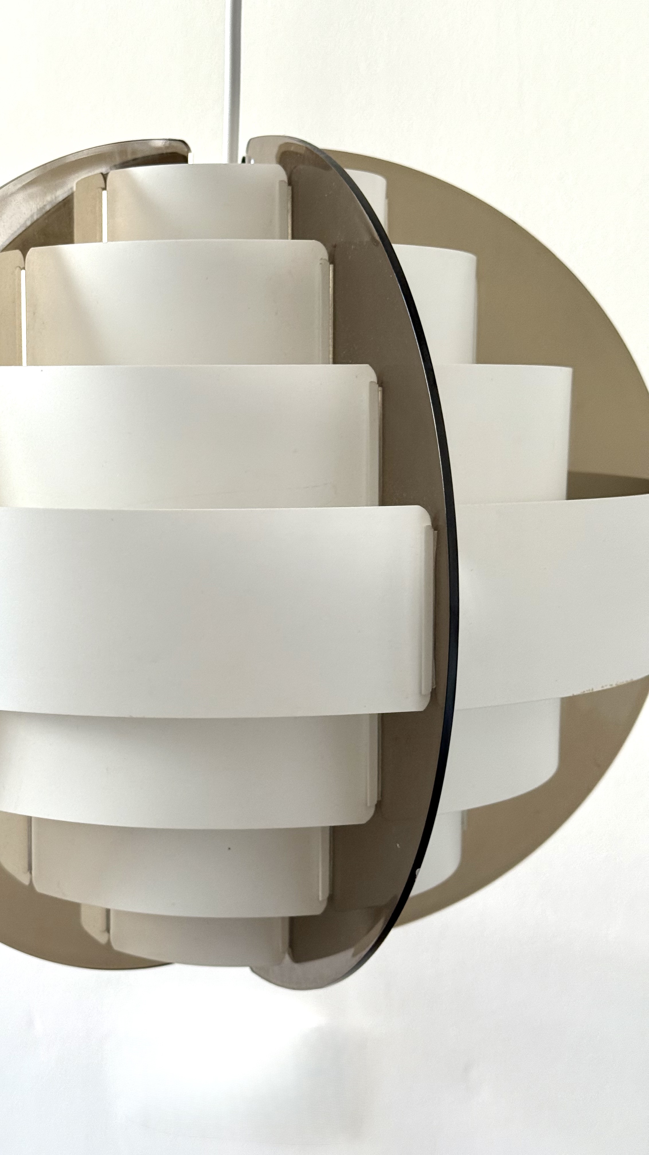 In the 1970s, when Denmark was searching for new ways to think about light and material, two young designers from Frederiksberg presented an idea considered radical at the time. Brylle & Jacobsen proposed a lamp that doesn't come as a finished product, but as an assembly kit. The idea was simple and clever: dozens of white plastic strips that lock into each other and create a precise optical form that softens the light. Around them, a smoked acrylic frame holds everything in clean and clear tension. This approach made Strips a milestone. It was one of the first lamps in the world sold as flat-pack. Decades before a global furniture giant made the method standard, Quality System already made it democratic and accessible. The design was so successful that in the 1990s, IKEA purchased the copyright and released a renewed version called Lakene. Strips has something timeless: a connection between technical innovation and the softness of light. The white strips break the glare and diffuse warm, quiet light. The smoked acrylic gives depth and form. The result is modern yet delicate, iconic yet not loud. The two lamps I found come from Danish village homes. Original from the period, preserved in an unusual way, without distortions and without scratches. True and good vintage condition. Perfect for a dining area, living room, or office seeking soft, modernist light.