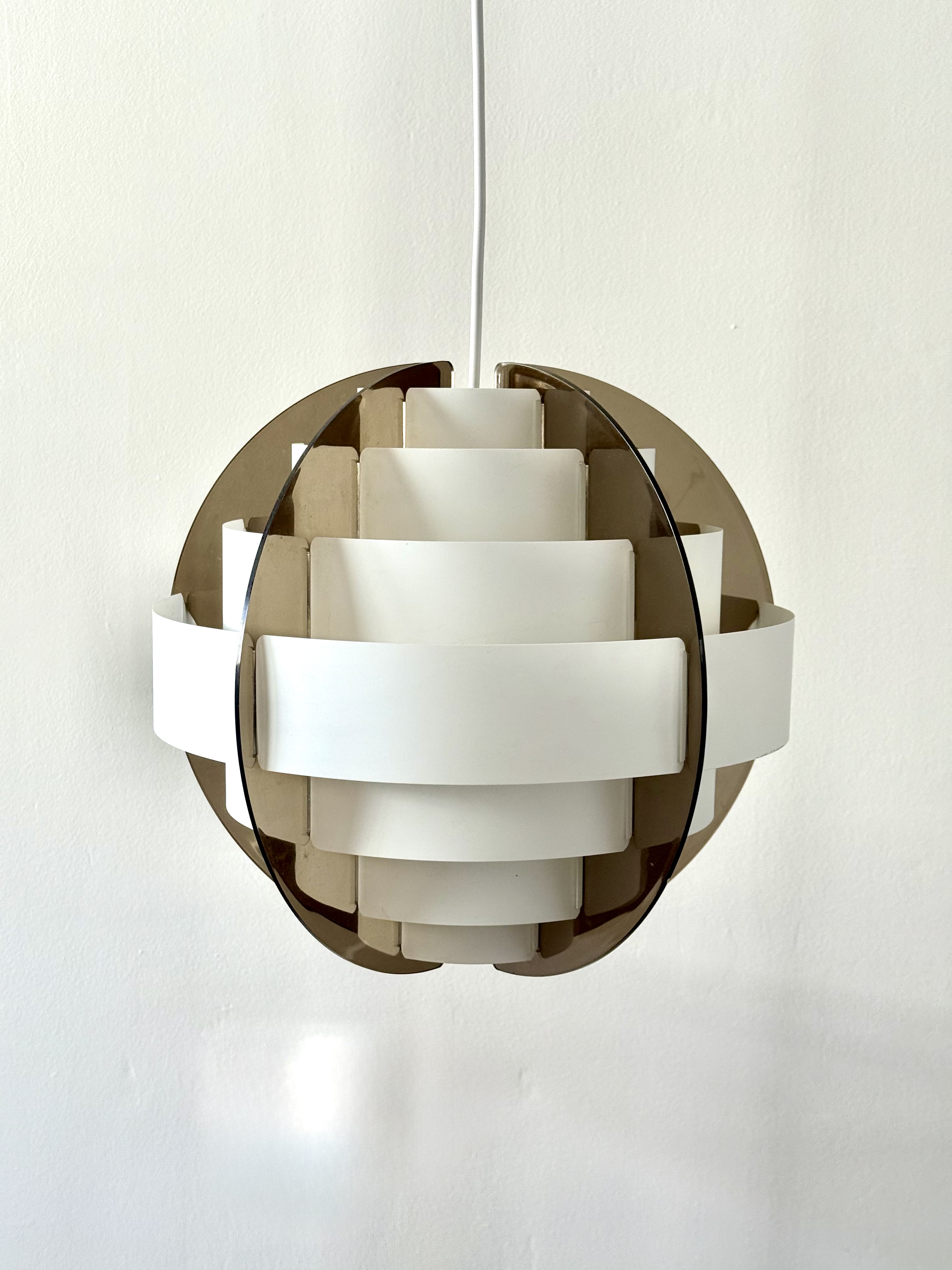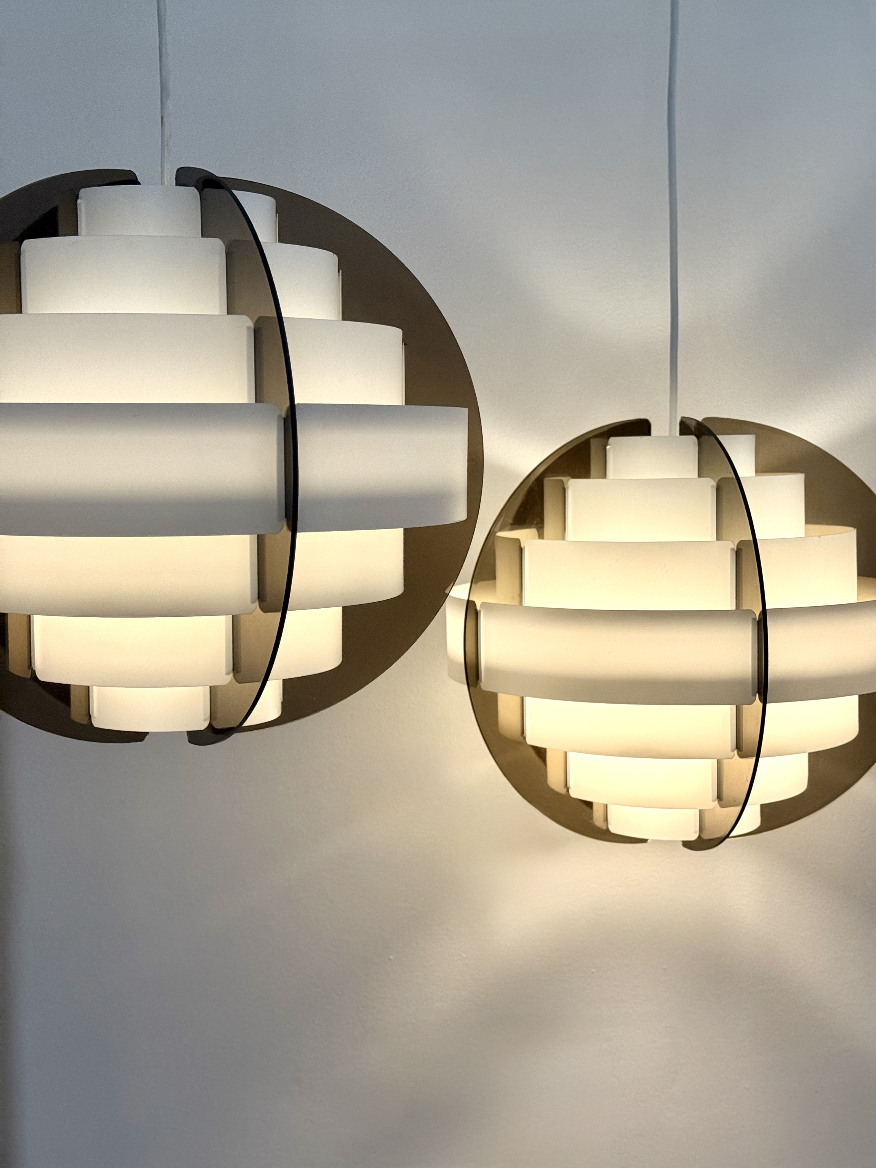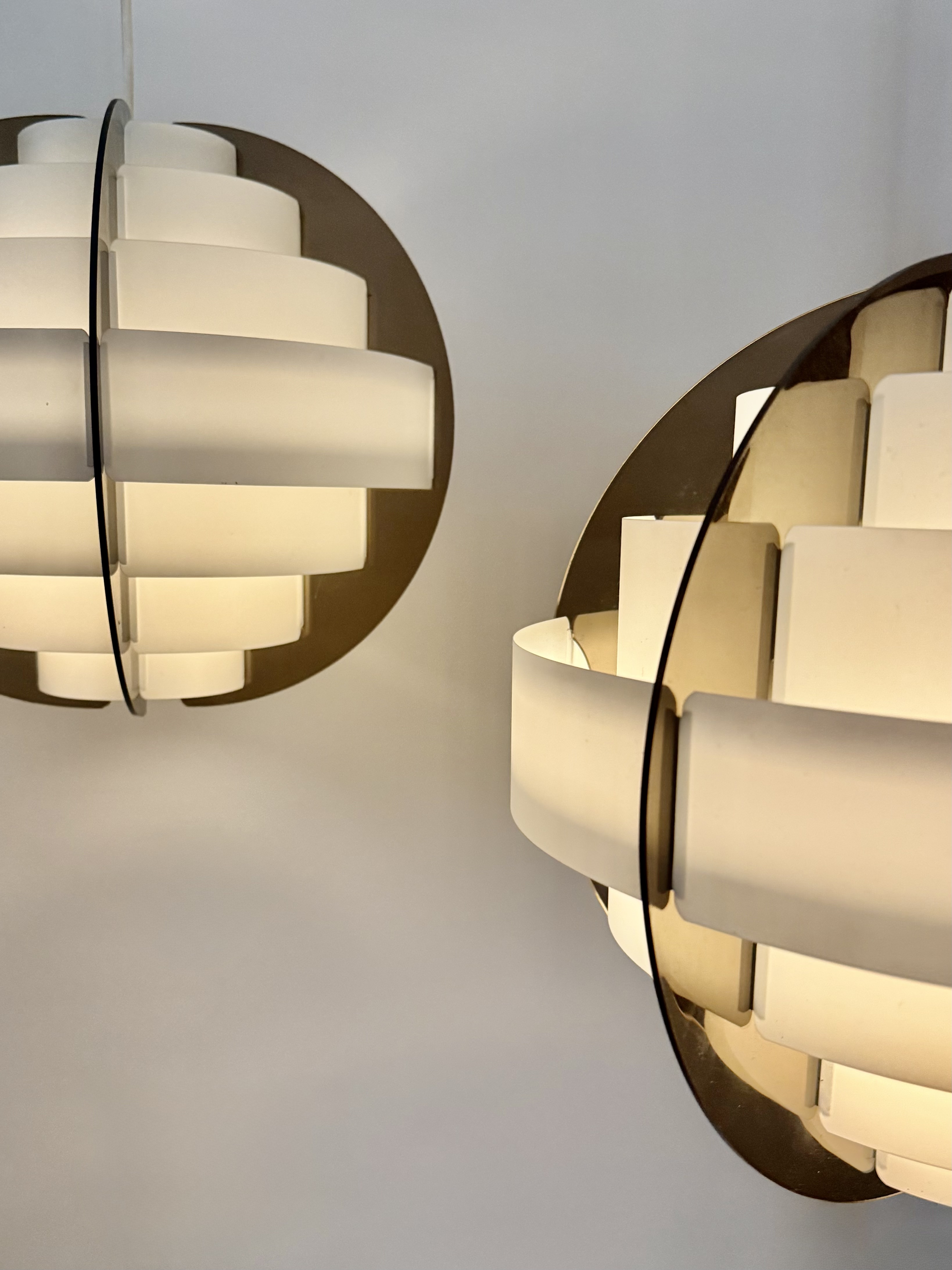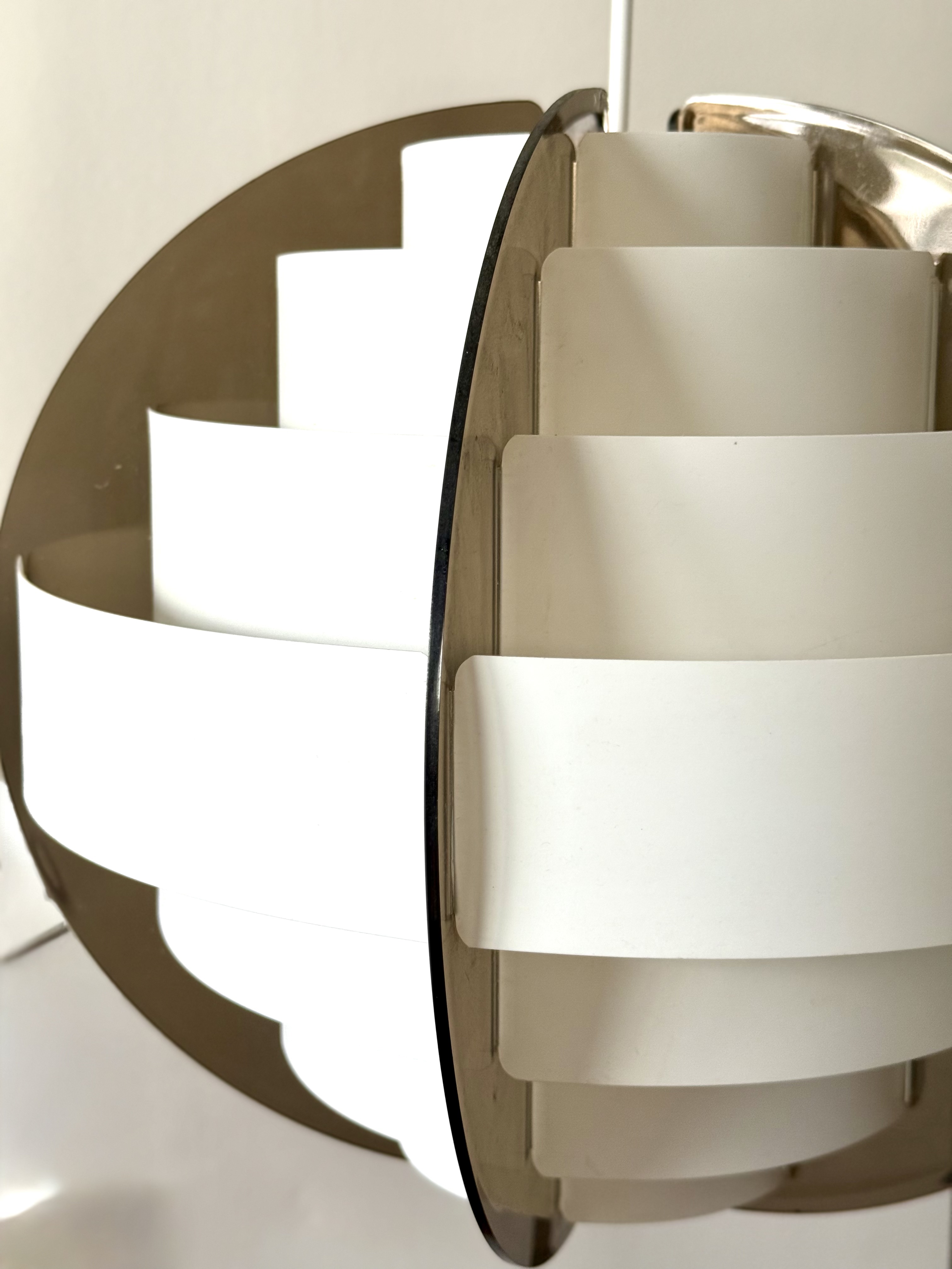 In the 1970s, when Denmark was searching for new ways to think about light and material, two young designers from Frederiksberg presented an idea considered radical at the time. Brylle & Jacobsen proposed a lamp that doesn't come as a finished product, but as an assembly kit. The idea was simple and clever: dozens of white plastic strips that lock into each other and create a precise optical form that softens the light. Around them, a smoked acrylic frame holds everything in clean and clear tension. This approach made Strips a milestone. It was one of the first lamps in the world sold as flat-pack. Decades before a global furniture giant made the method standard, Quality System already made it democratic and accessible. The design was so successful that in the 1990s, IKEA purchased the copyright and released a renewed version called Lakene. Strips has something timeless: a connection between technical innovation and the softness of light. The white strips break the glare and diffuse warm, quiet light. The smoked acrylic gives depth and form. The result is modern yet delicate, iconic yet not loud. The two lamps I found come from Danish village homes. Original from the period, preserved in an unusual way, without distortions and without scratches. True and good vintage condition. Perfect for a dining area, living room, or office seeking soft, modernist light.