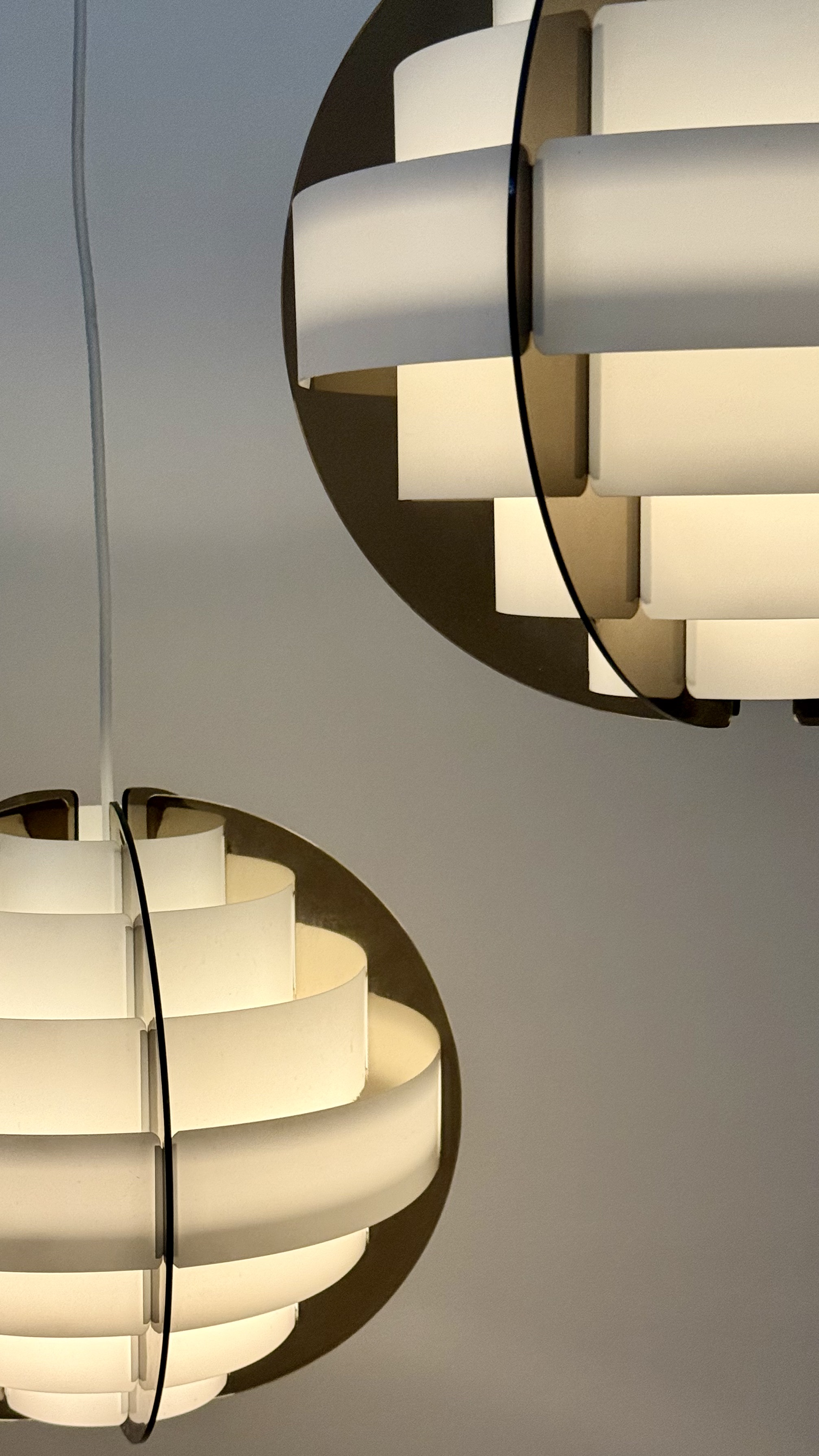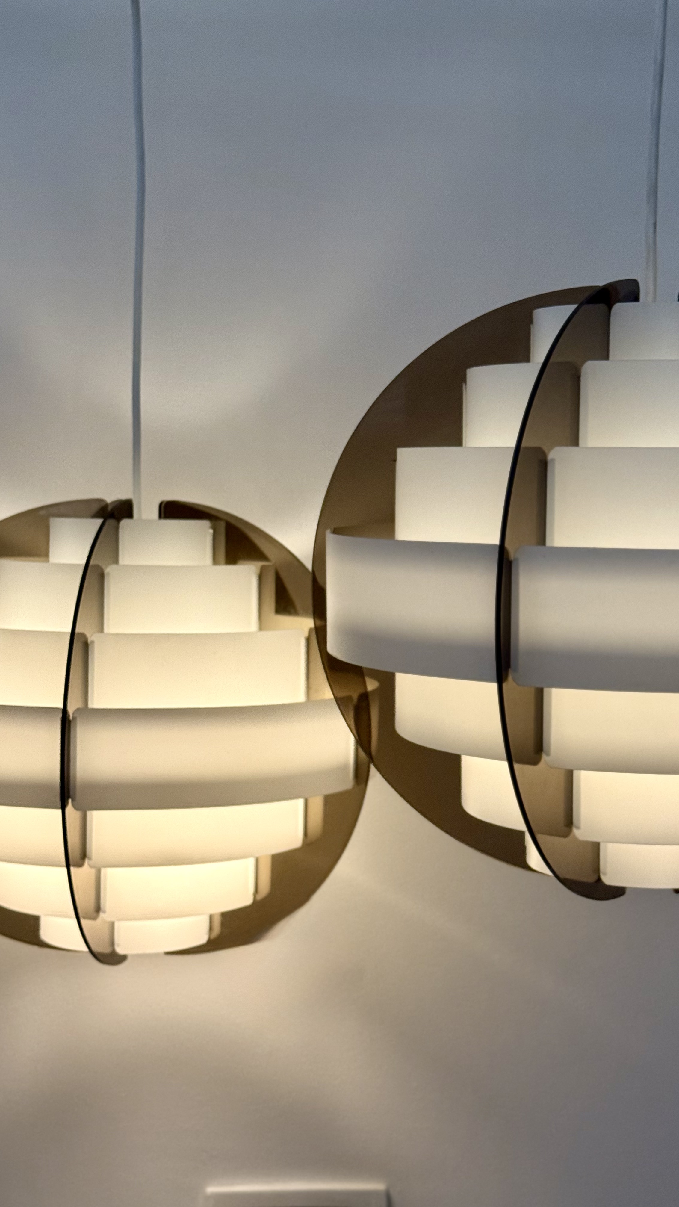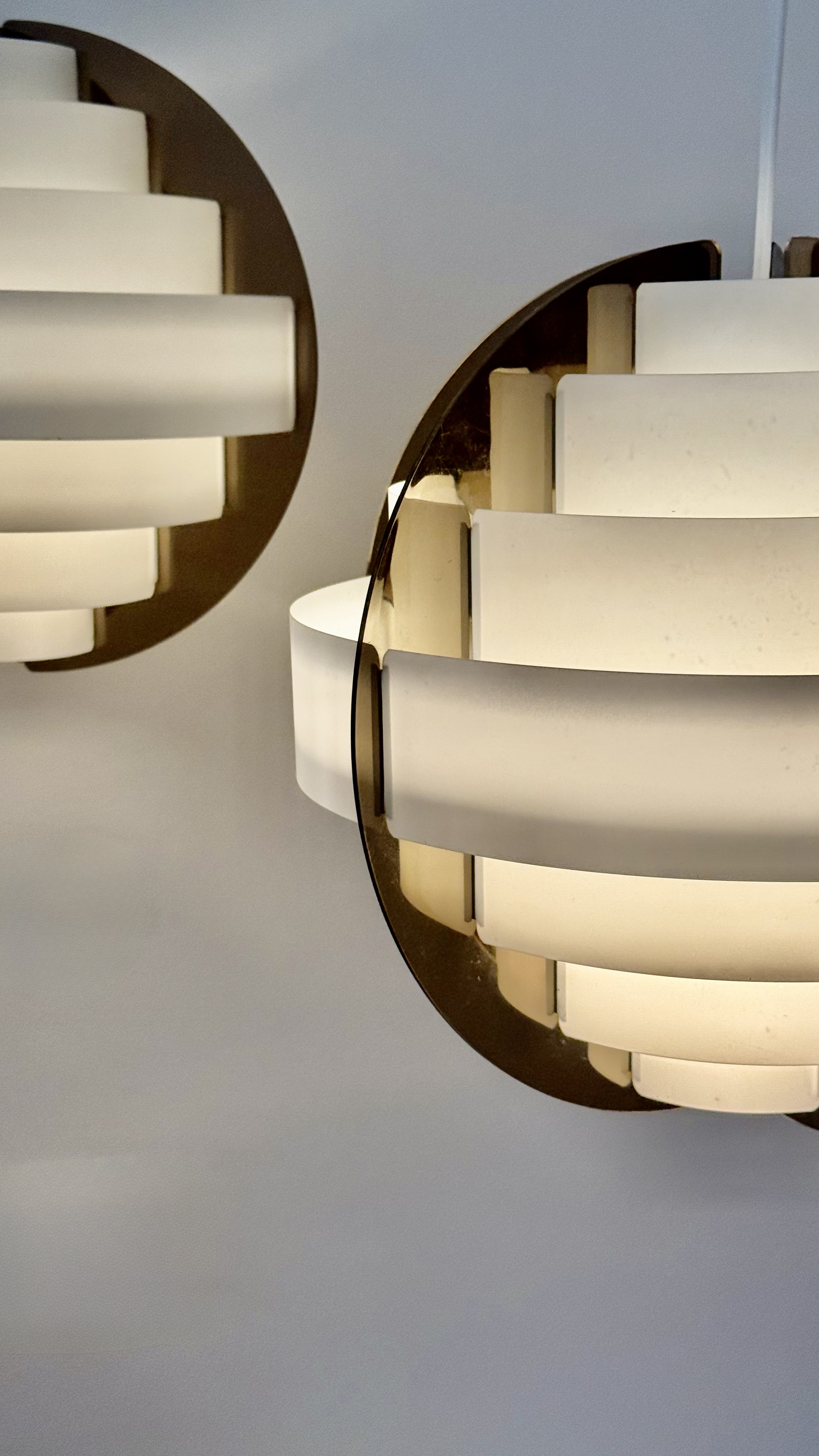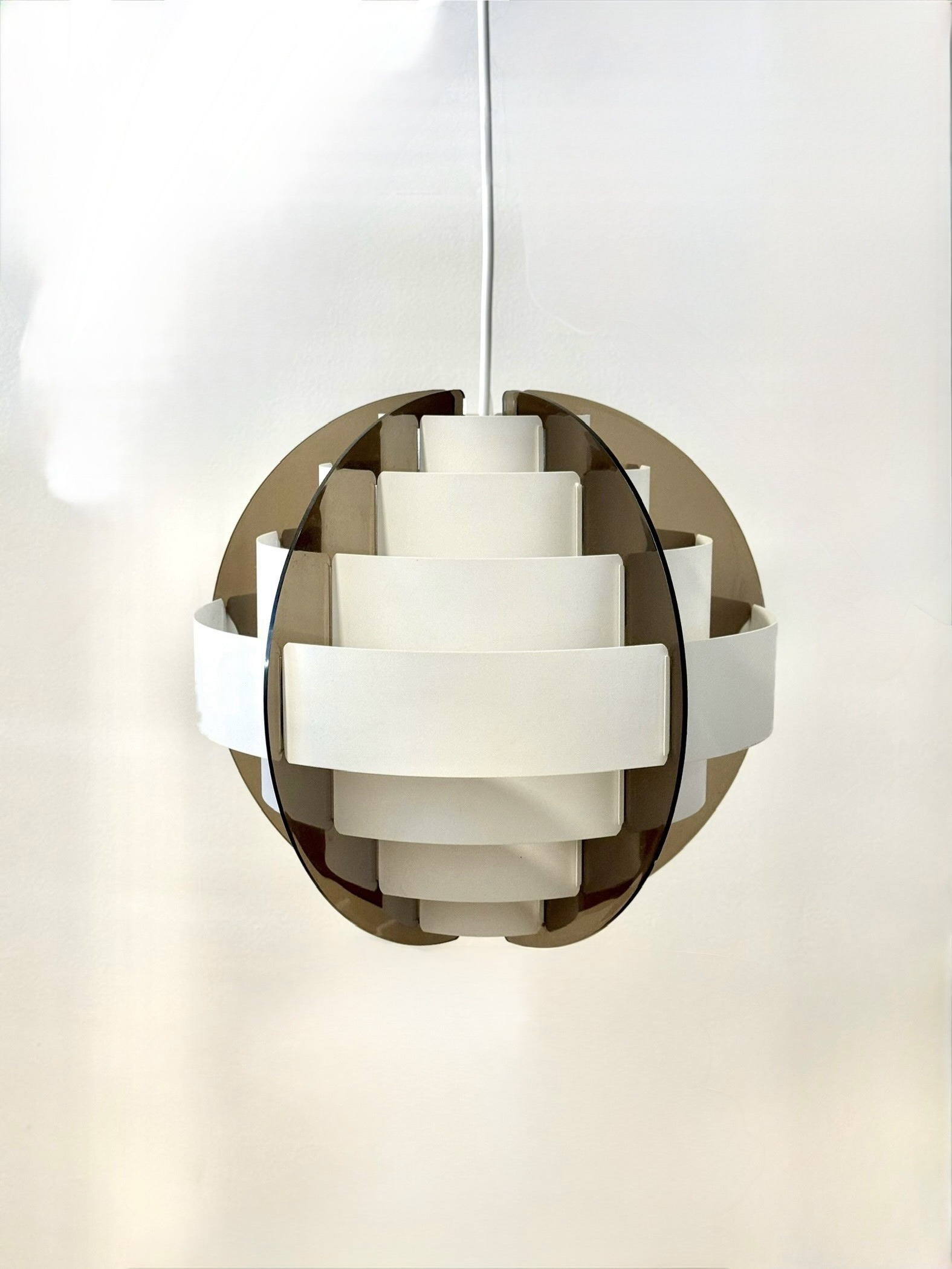 In the 1970s, when Denmark was searching for new ways to think about light and material, two young designers from Frederiksberg presented an idea considered radical at the time. Brylle & Jacobsen proposed a lamp that doesn't come as a finished product, but as an assembly kit. The idea was simple and clever: dozens of white plastic strips that lock into each other and create a precise optical form that softens the light. Around them, a smoked acrylic frame holds everything in clean and clear tension. This approach made Strips a milestone. It was one of the first lamps in the world sold as flat-pack. Decades before a global furniture giant made the method standard, Quality System already made it democratic and accessible. The design was so successful that in the 1990s, IKEA purchased the copyright and released a renewed version called Lakene. Strips has something timeless: a connection between technical innovation and the softness of light. The white strips break the glare and diffuse warm, quiet light. The smoked acrylic gives depth and form. The result is modern yet delicate, iconic yet not loud. The two lamps I found come from Danish village homes. Original from the period, preserved in an unusual way, without distortions and without scratches. True and good vintage condition. Perfect for a dining area, living room, or office seeking soft, modernist light.