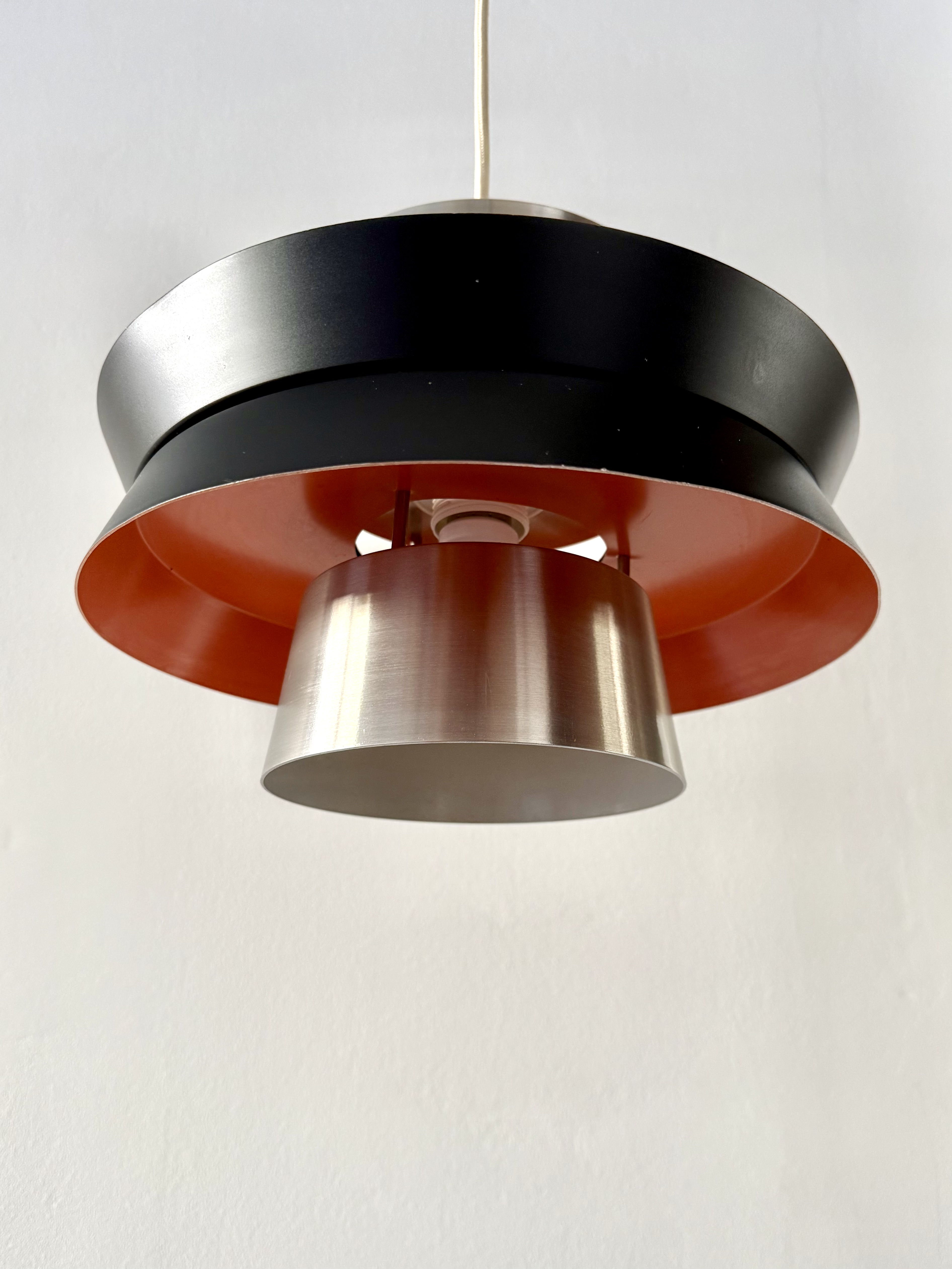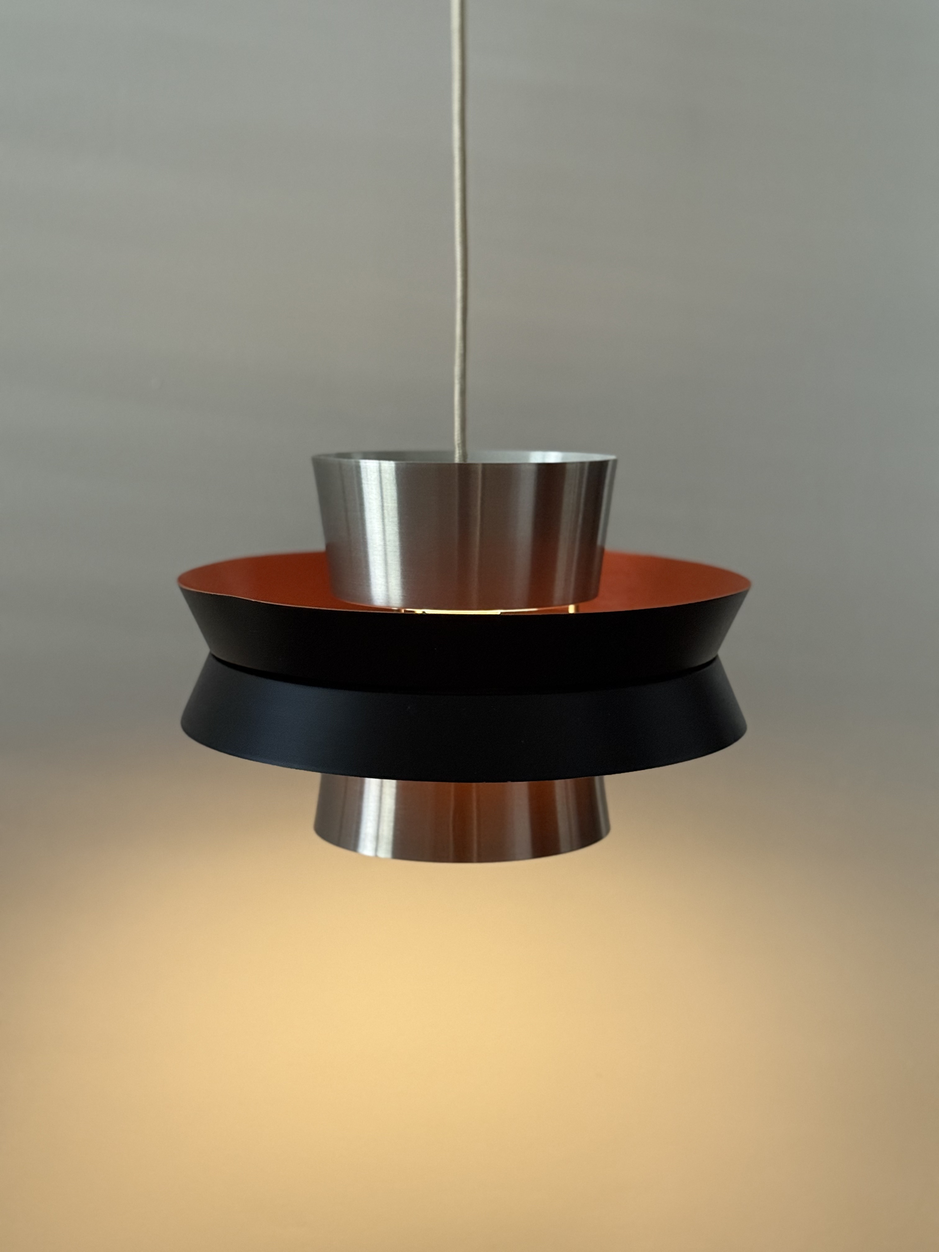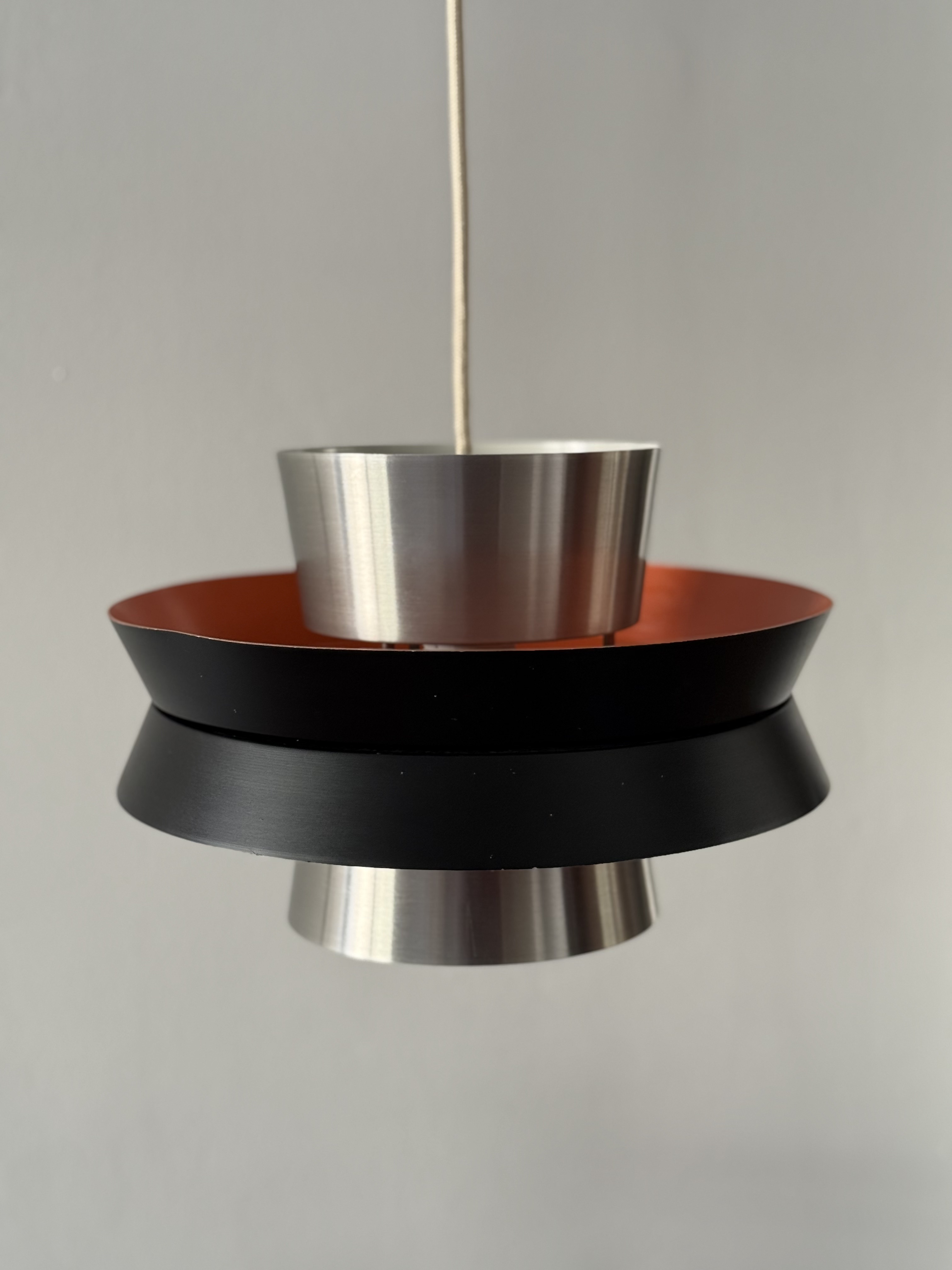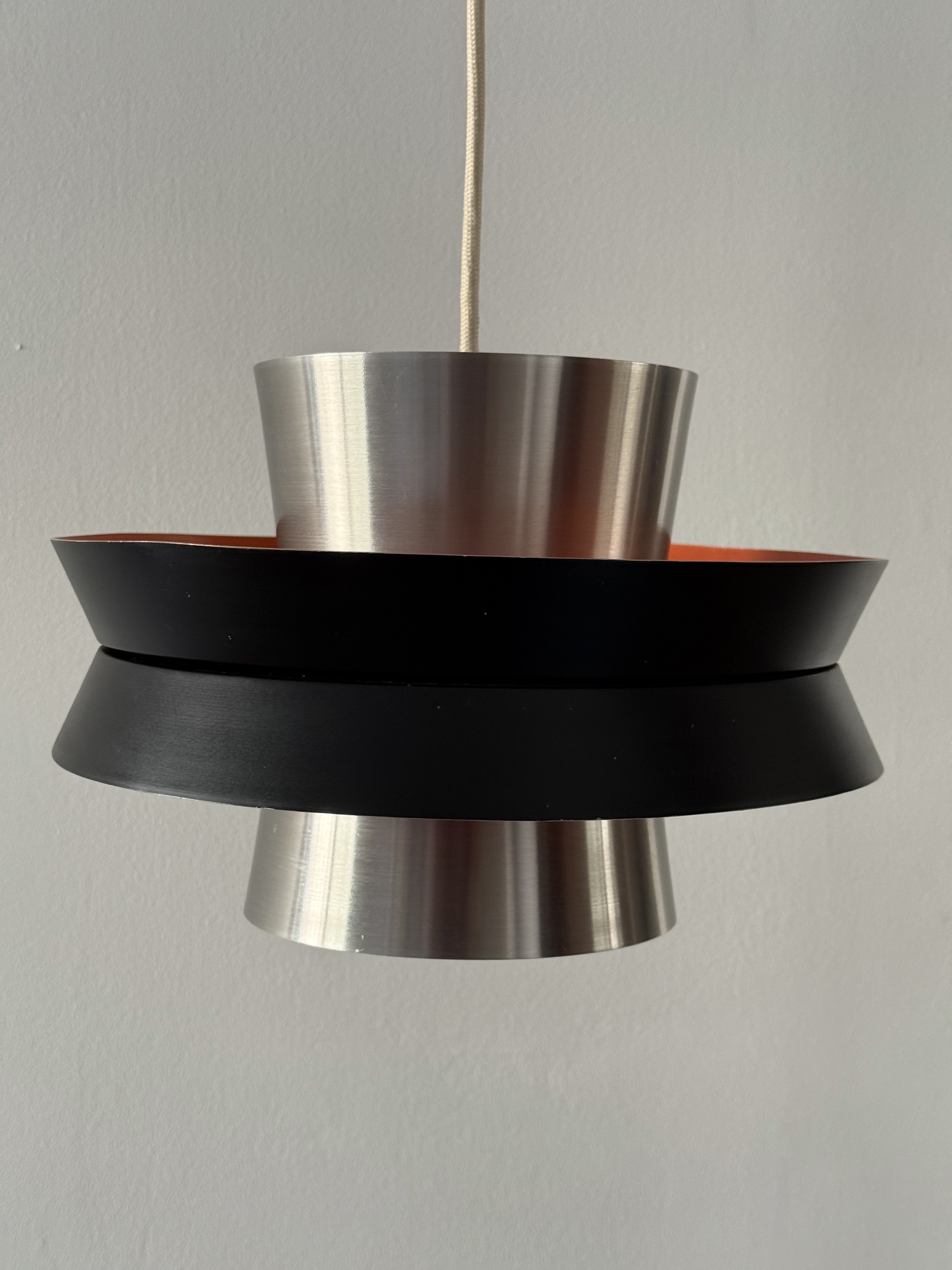 The Karl Thor Trava pendant lamp, designed in the 1970s, is a notable example of Scandinavian modernism. Karl Thor, a pseudonym for Swedish designer Sigurd Lindqvist, created this special lamp during his time at Granhaga Metall in Sweden. The lamp features an interesting combination of smooth metal finishes in black, orange, and silver. It was designed to complement modern 20th-century designs, with clean lines and minimalist elegance. The Trava series became popular due to its unique structure, capable of effectively distributing light. Today, it is particularly coveted by collectors for its stylish retro look and brilliant design. With a height of about 30 cm and a diameter of 35 cm, it fits a variety of spaces, from apartments to bedrooms. The color and material combination reflects the aesthetic trends of the 1970s, featuring bold yet harmonious contrasts. Its Swedish origin highlights a period when Swedish design gained significant international recognition. As a vintage item, the Trava pendant lamp not only offers functionality but also serves as a design jewel that attests to the timeless appeal of Scandinavian design.