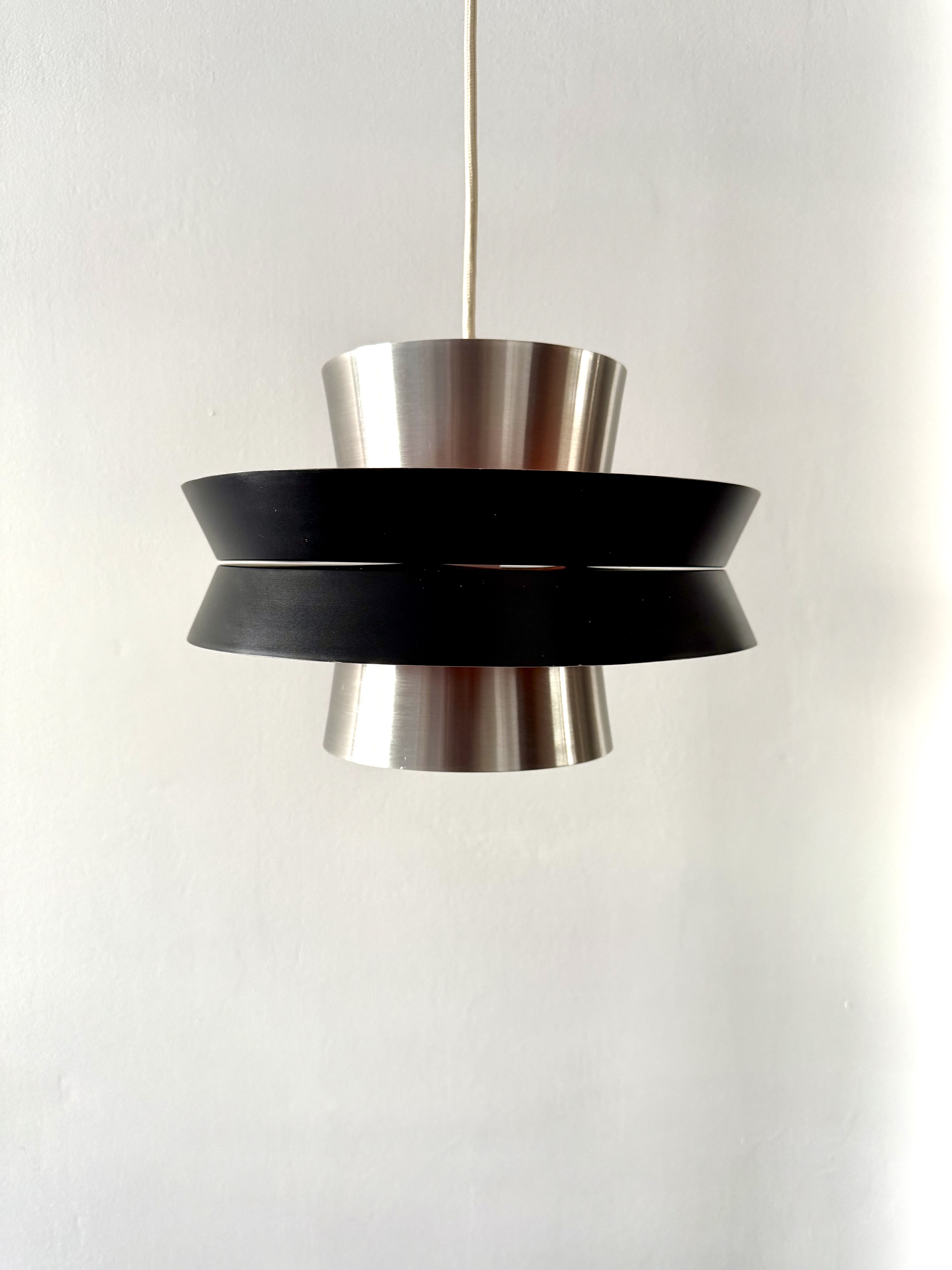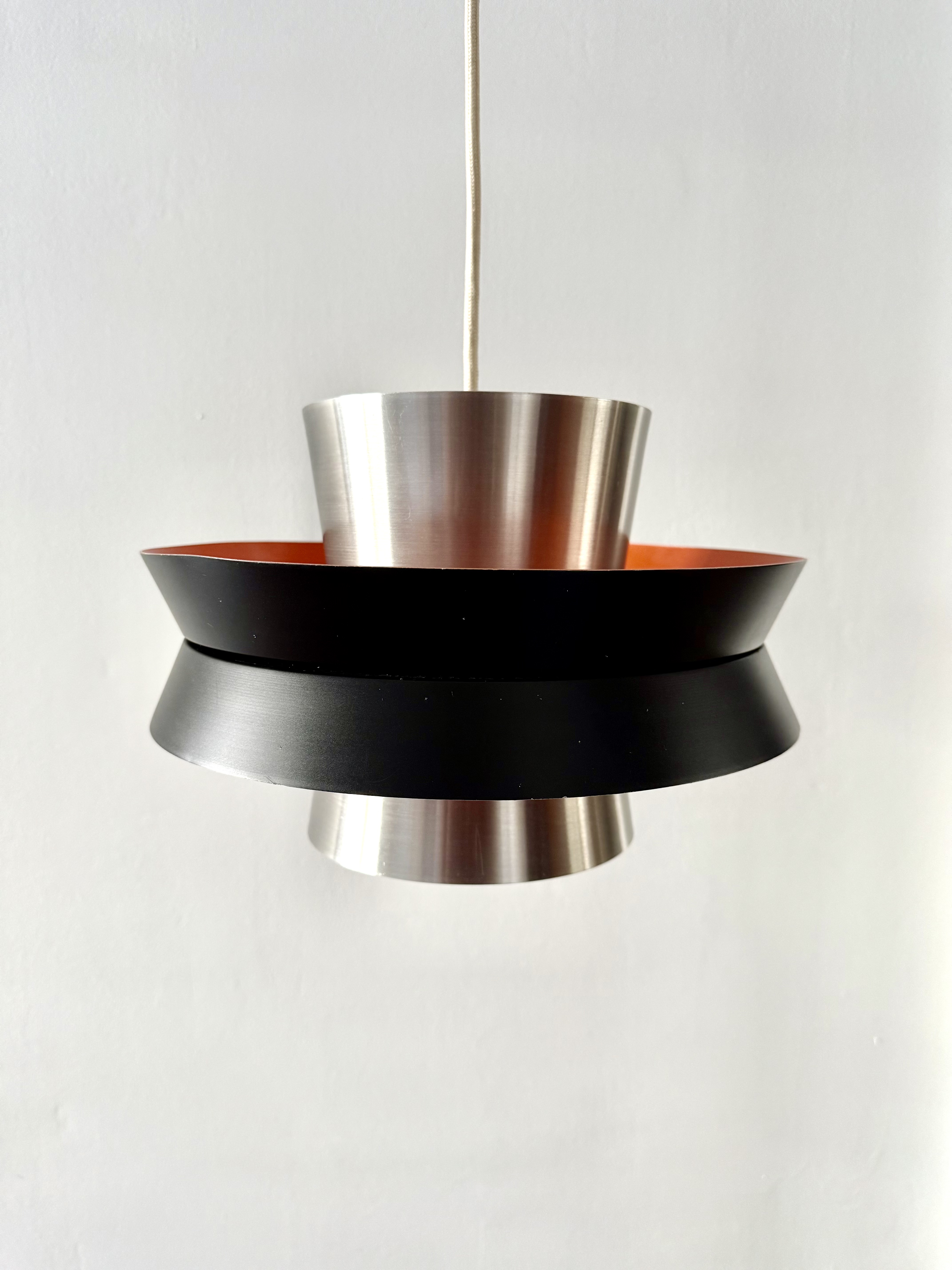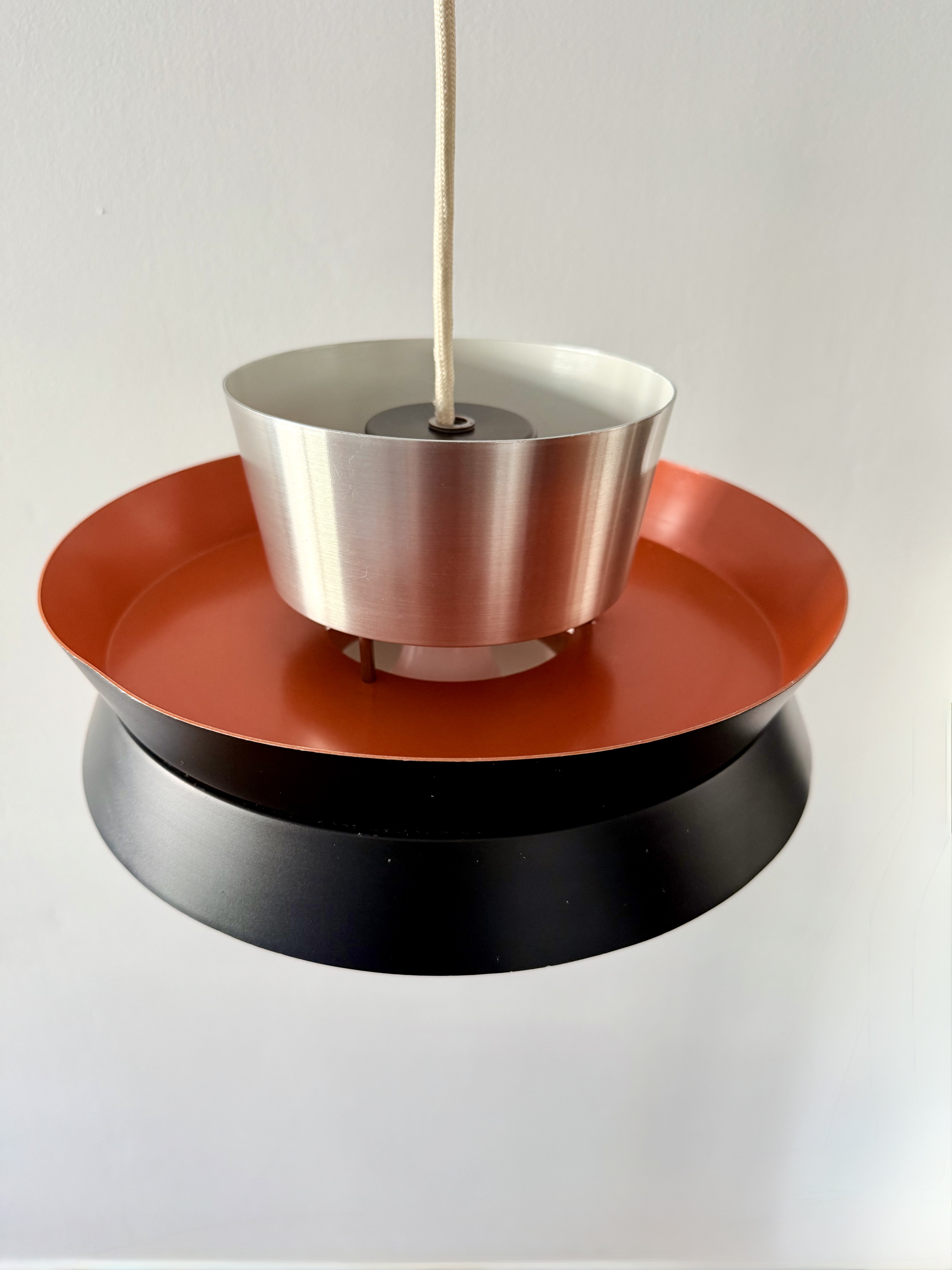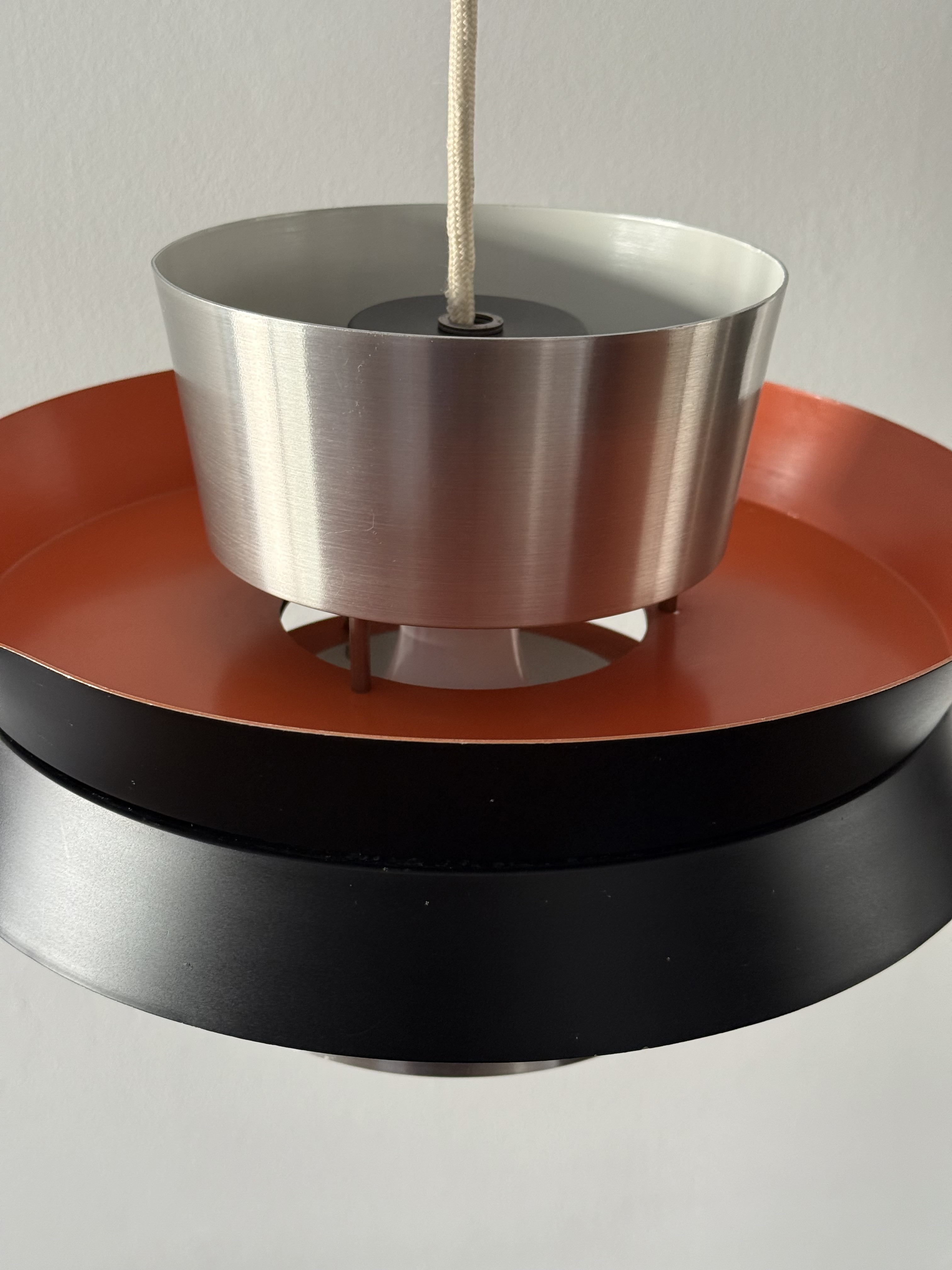 The Karl Thor Trava pendant lamp, designed in the 1970s, is a notable example of Scandinavian modernism. Karl Thor, a pseudonym for Swedish designer Sigurd Lindqvist, created this special lamp during his time at Granhaga Metall in Sweden. The lamp features an interesting combination of smooth metal finishes in black, orange, and silver. It was designed to complement modern 20th-century designs, with clean lines and minimalist elegance. The Trava series became popular due to its unique structure, capable of effectively distributing light. Today, it is particularly coveted by collectors for its stylish retro look and brilliant design. With a height of about 30 cm and a diameter of 35 cm, it fits a variety of spaces, from apartments to bedrooms. The color and material combination reflects the aesthetic trends of the 1970s, featuring bold yet harmonious contrasts. Its Swedish origin highlights a period when Swedish design gained significant international recognition. As a vintage item, the Trava pendant lamp not only offers functionality but also serves as a design jewel that attests to the timeless appeal of Scandinavian design.