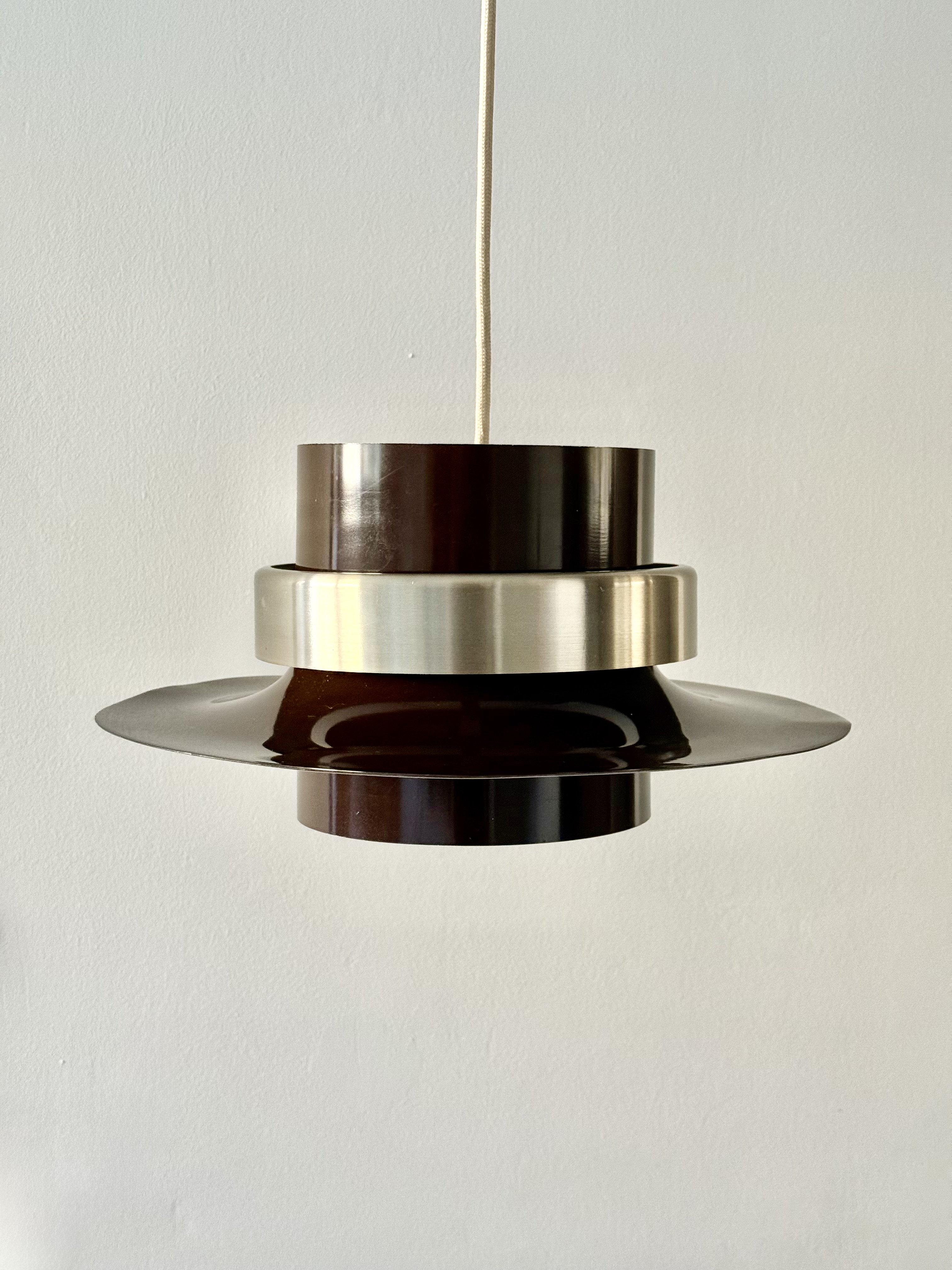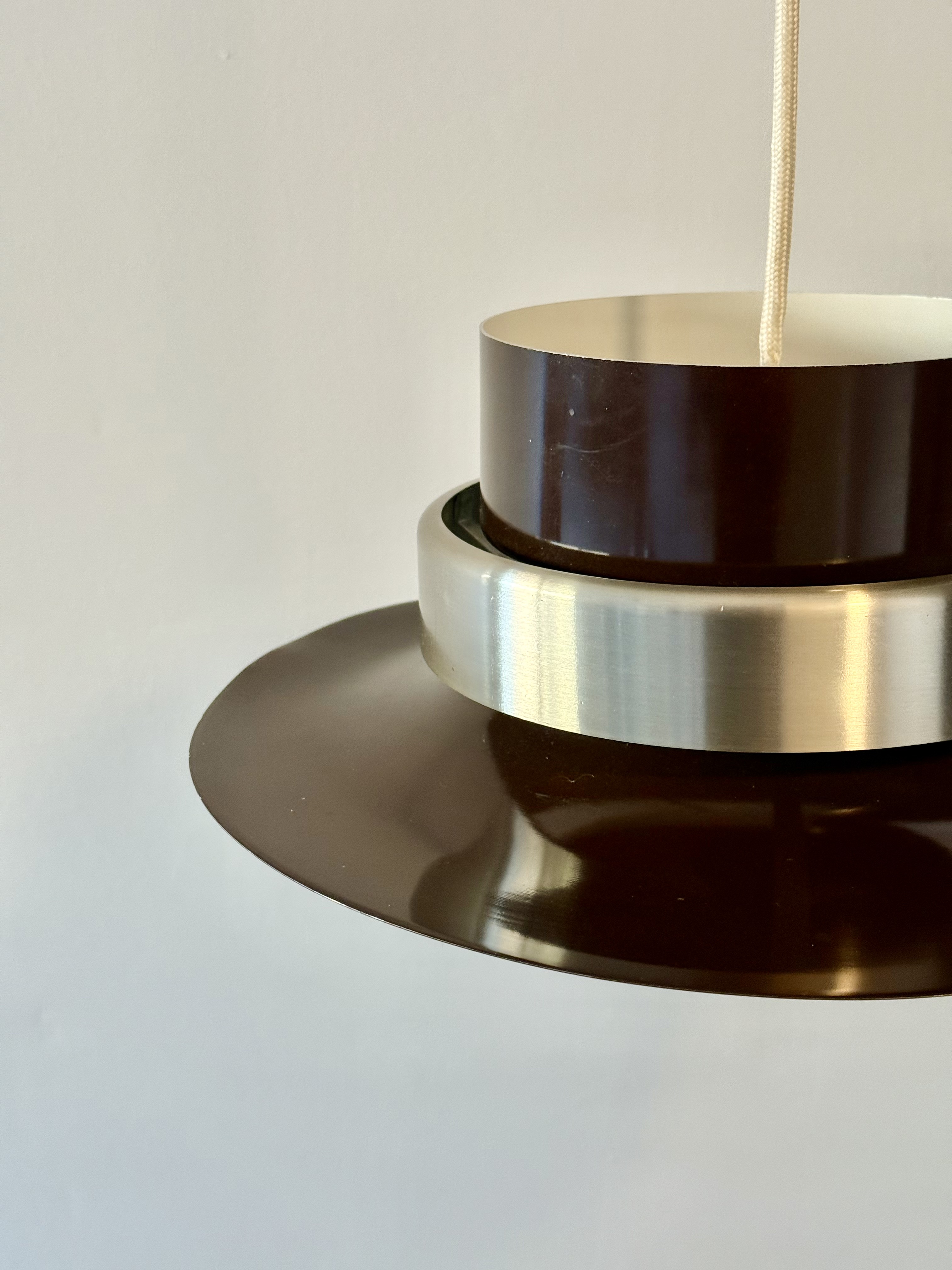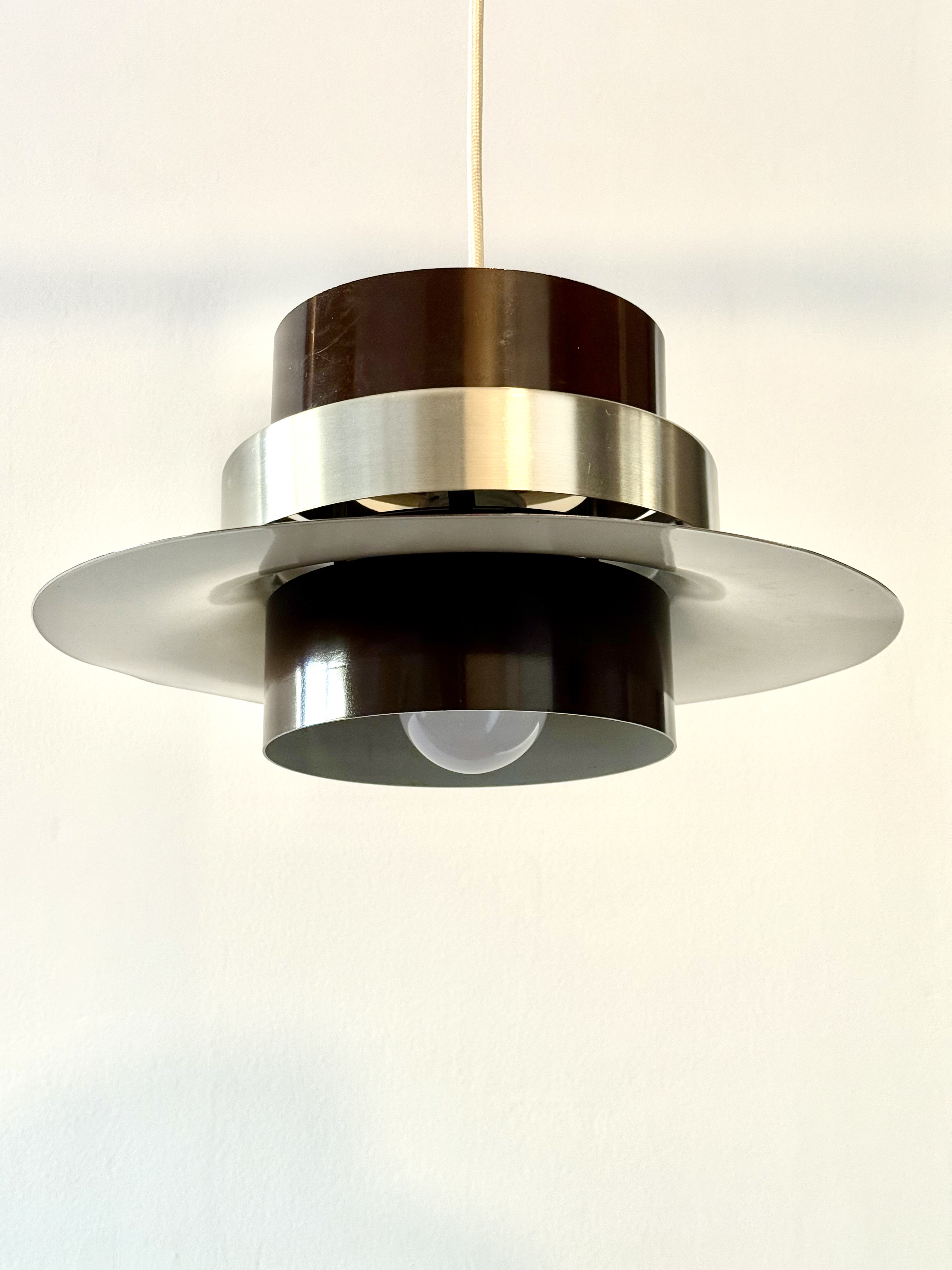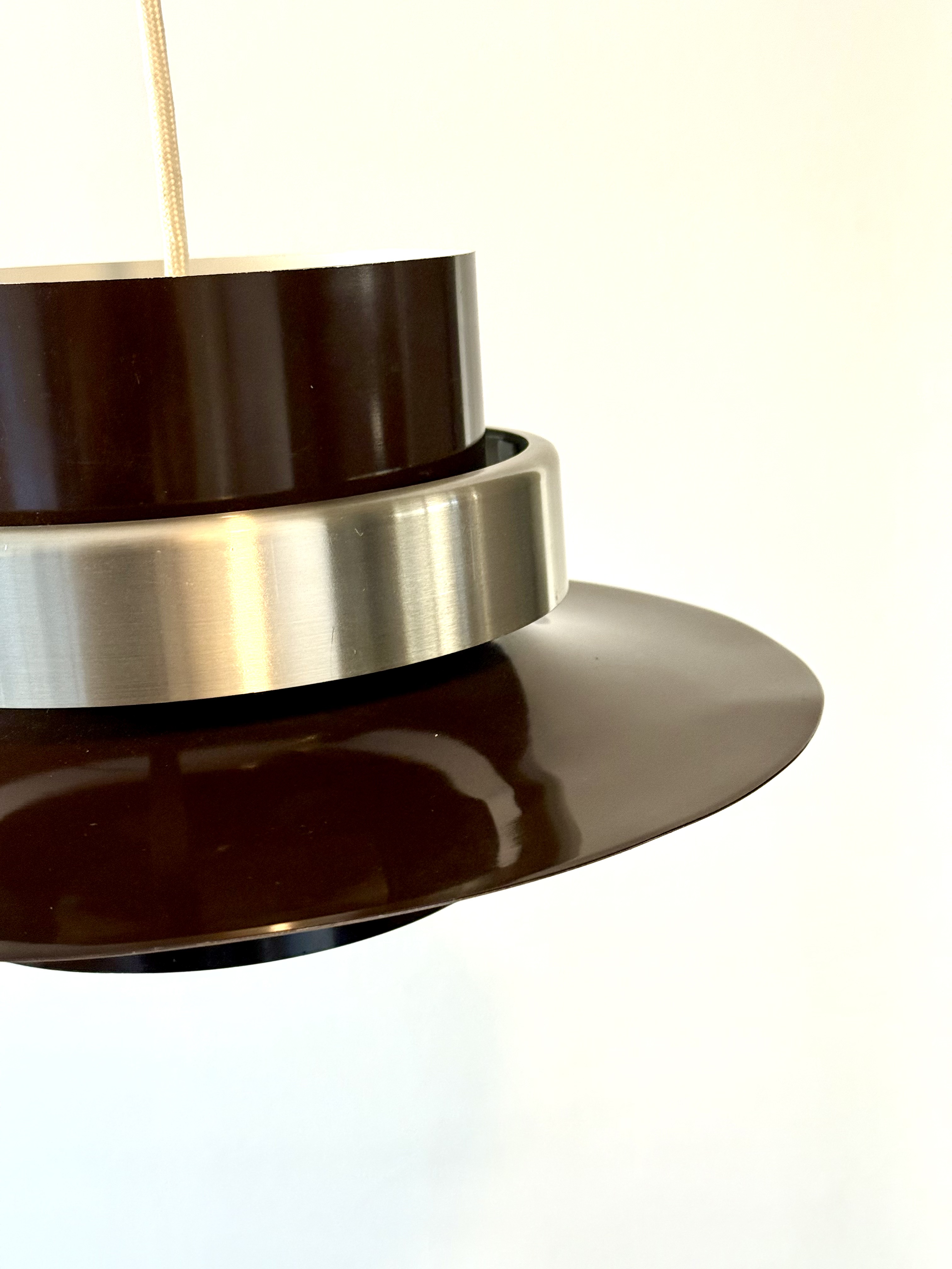 This lamp represents the shared design language of Denmark and Germany in the 1970s—a decade when industrial design adopted dark earth tones as a reaction to the plastic colorfulness of the previous decade. The body is constructed from layers of aluminum painted in deep chocolate brown. At its center, an exposed aluminum band allows controlled lateral light spillage. This engineering solution creates a visual separation between the shade layers and diffuses a halo around the body when the lamp is lit, beyond the central beam directed downward. The model is attributed to Danish manufacturers (such as Lyskaer) or German ones (such as Staff), reflecting the technological knowledge exchange in Europe during those years. The design leans on the rejection of modernism's "absolute truth" and alienation in favor of creating intimacy (Hygge) through layers of light and shadow.
