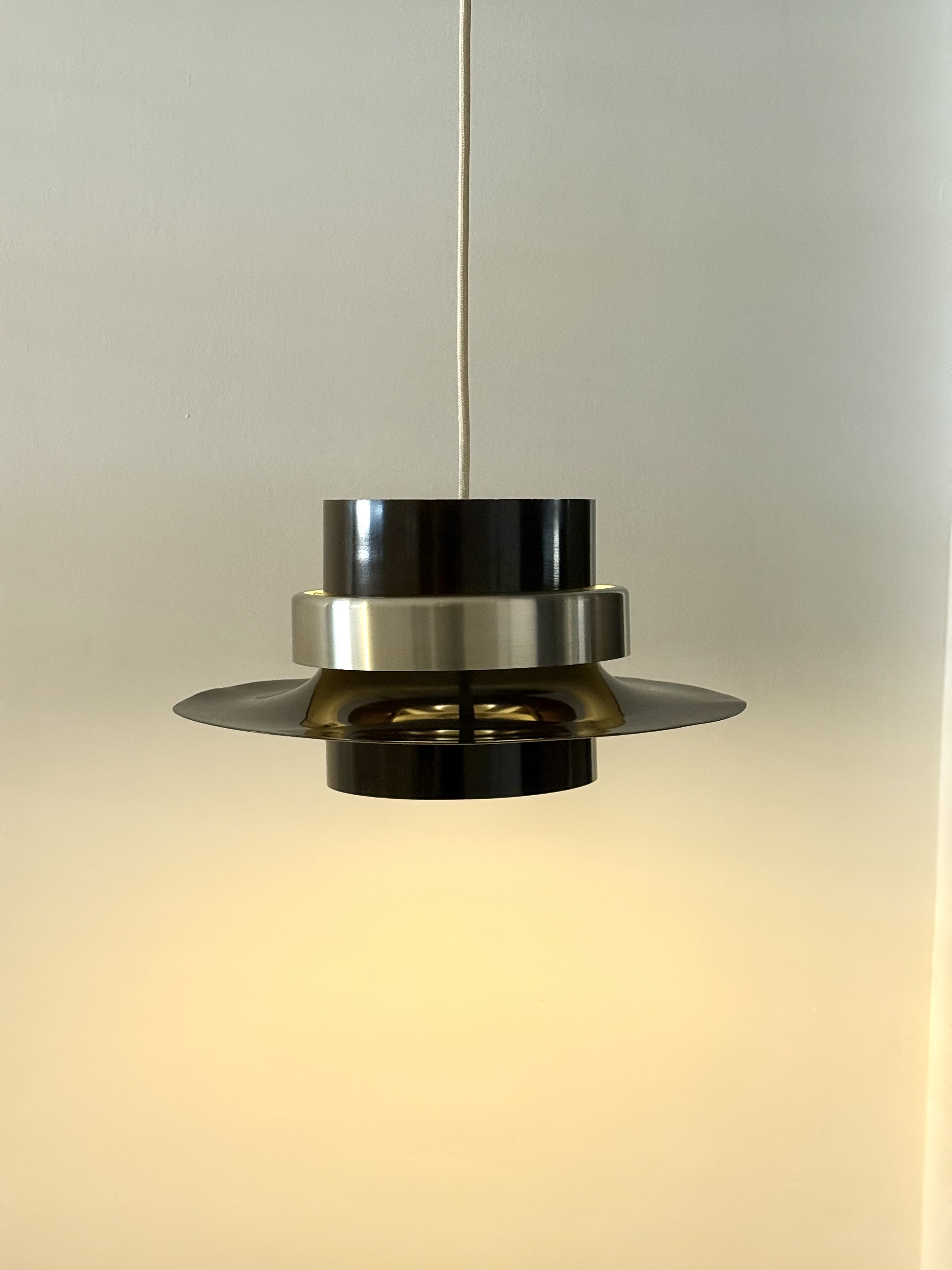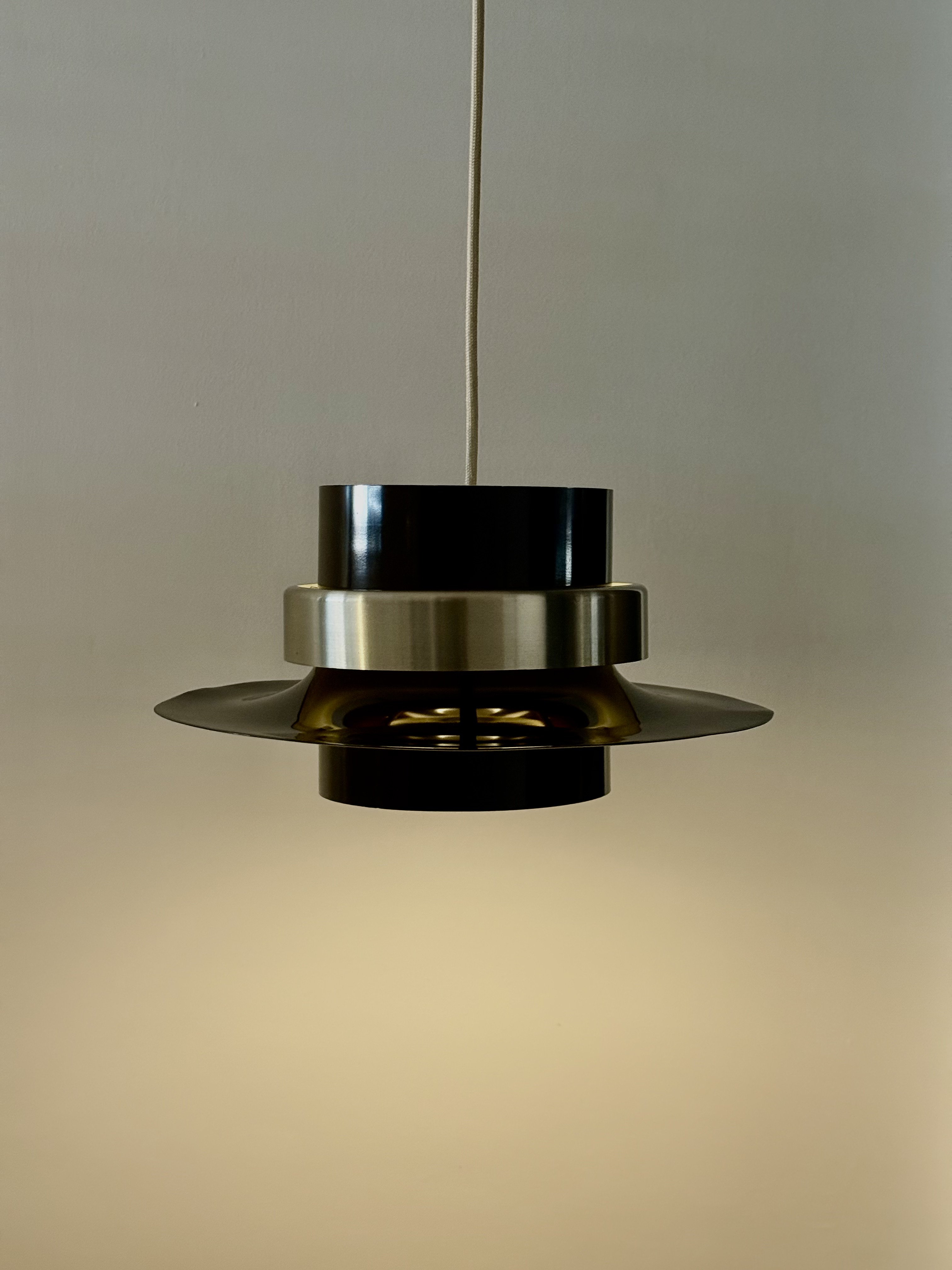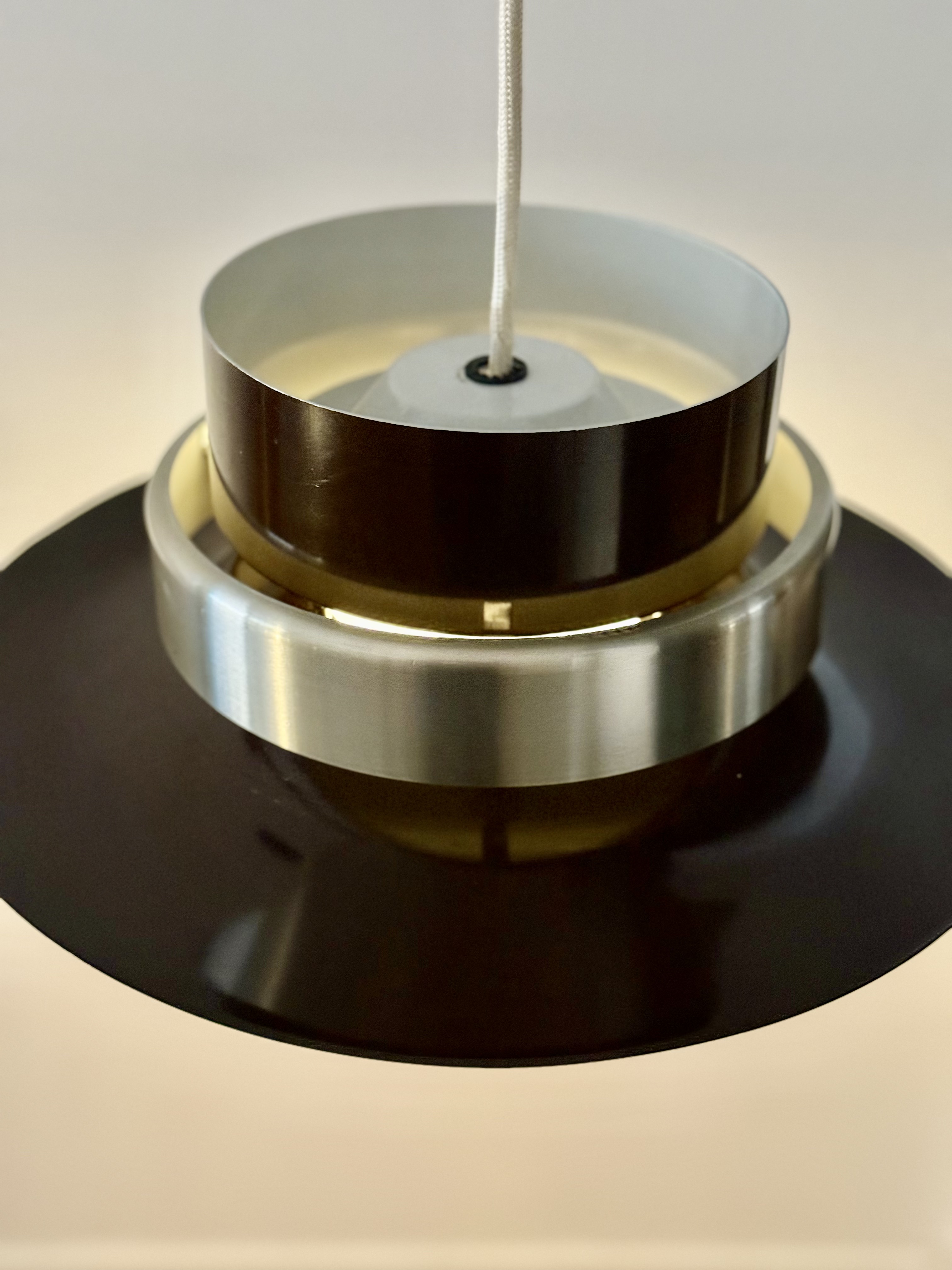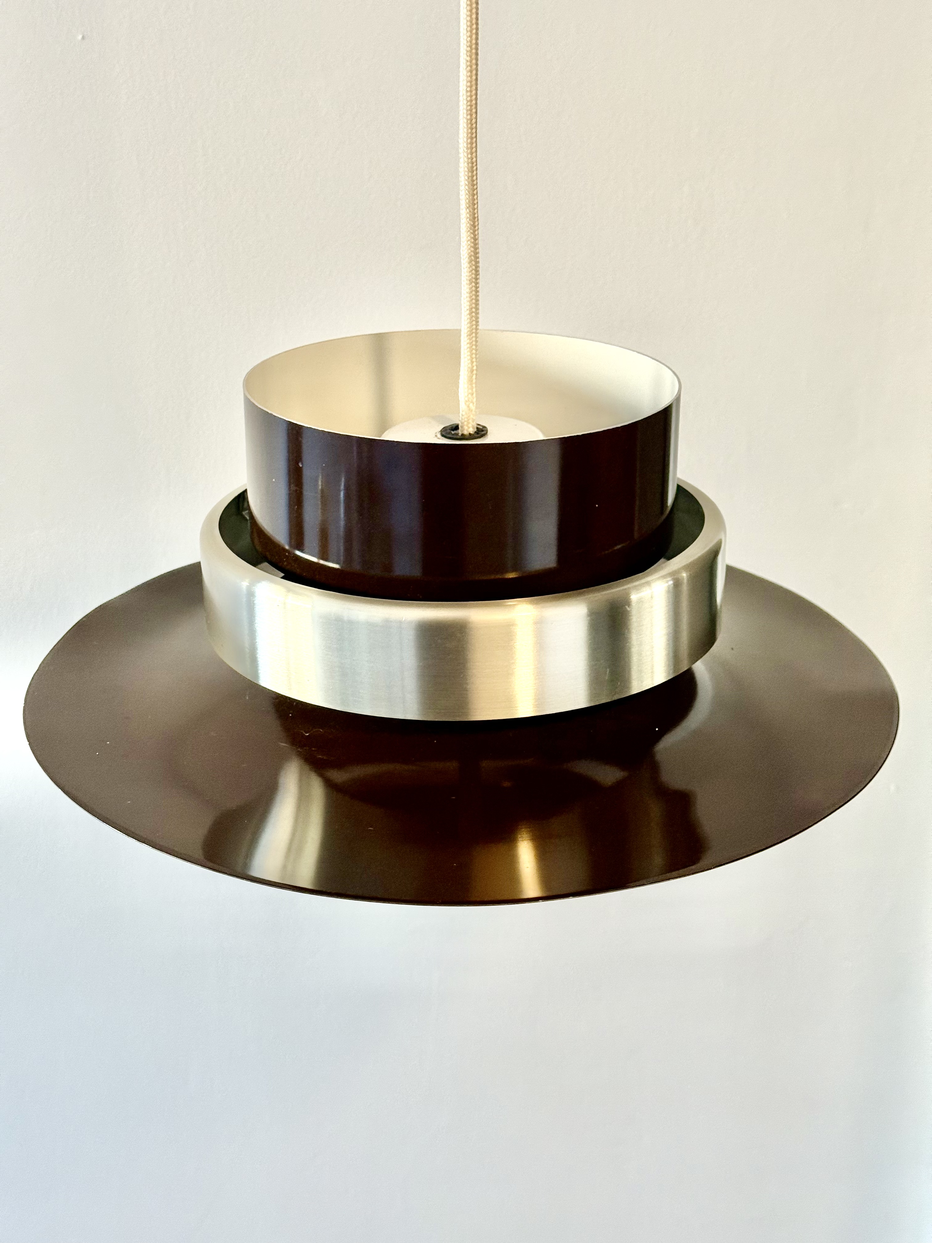 This lamp represents the shared design language of Denmark and Germany in the 1970s—a decade when industrial design adopted dark earth tones as a reaction to the plastic colorfulness of the previous decade. The body is constructed from layers of aluminum painted in deep chocolate brown. At its center, an exposed aluminum band allows controlled lateral light spillage. This engineering solution creates a visual separation between the shade layers and diffuses a halo around the body when the lamp is lit, beyond the central beam directed downward. The model is attributed to Danish manufacturers (such as Lyskaer) or German ones (such as Staff), reflecting the technological knowledge exchange in Europe during those years. The design leans on the rejection of modernism's "absolute truth" and alienation in favor of creating intimacy (Hygge) through layers of light and shadow.