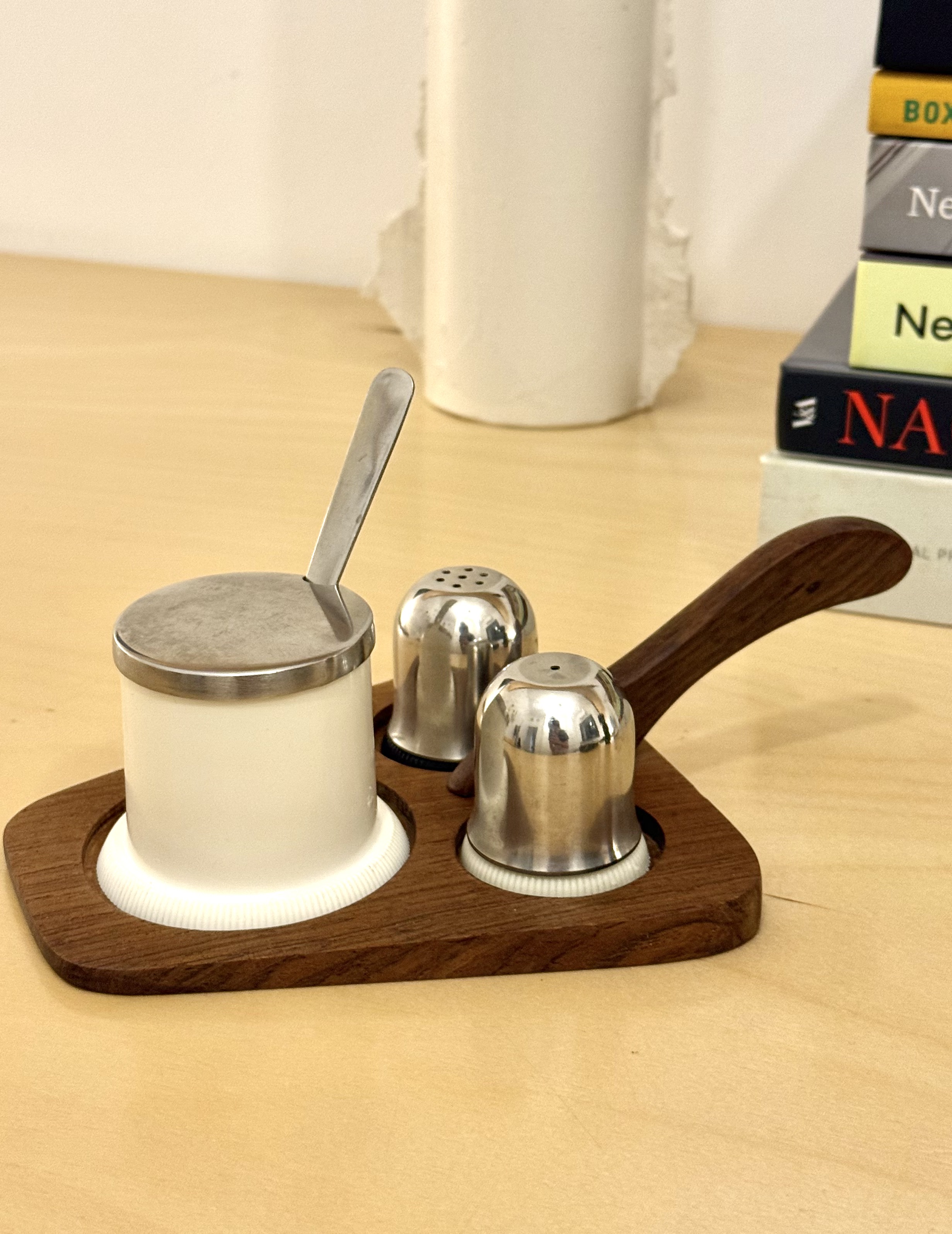 Mid-Century Modern Danish condiment set known as "Plat de Menage." Combines rosewood (palisander), stainless steel, and plastic in a minimalist 1960s design. Includes two stainless steel shakers, a white plastic jar with stainless steel lid and spoon, and a rosewood tray. Often attributed to Axel Salomonsen or A&B Lundtofte, though many unsigned Danish examples exist.