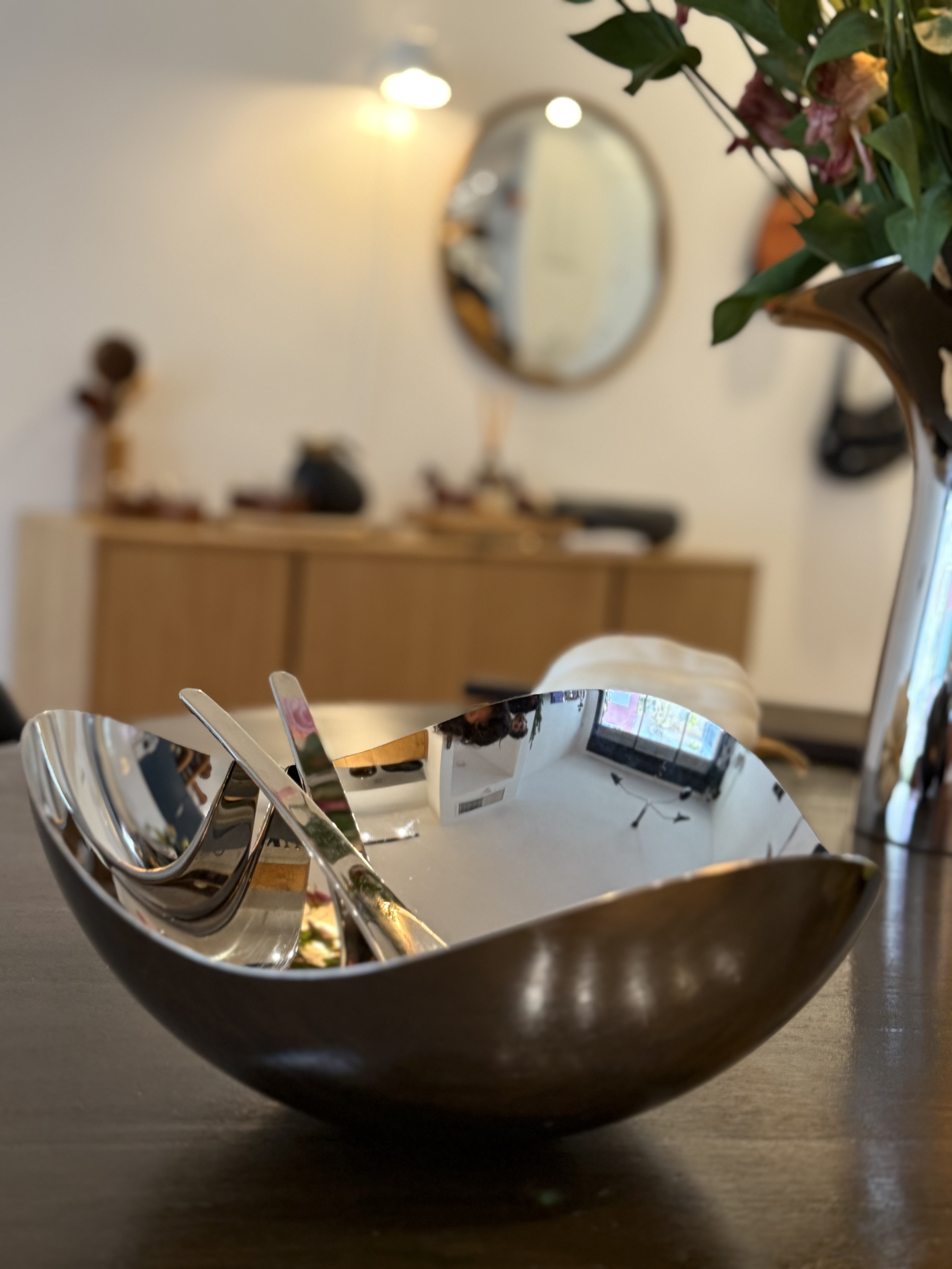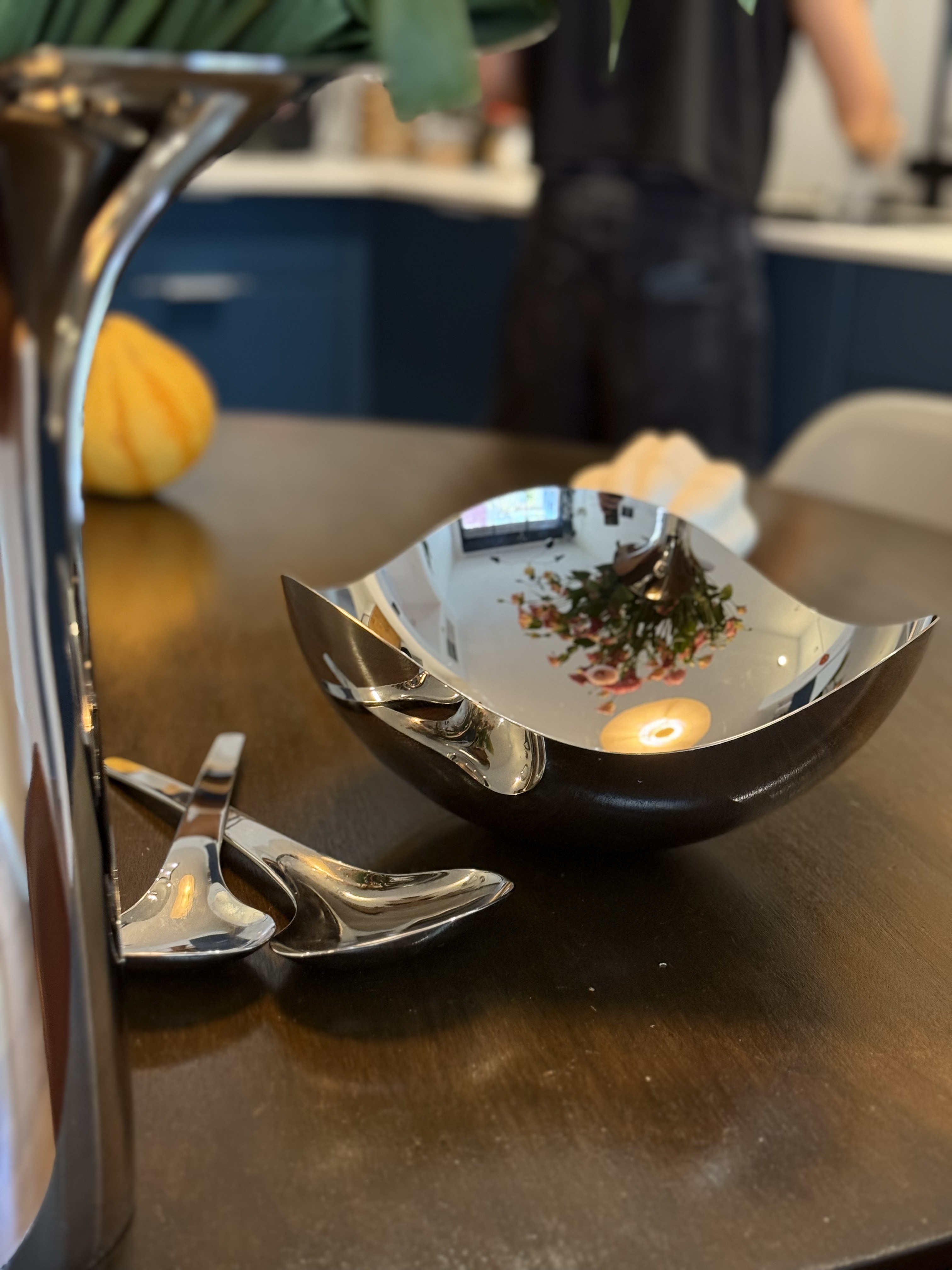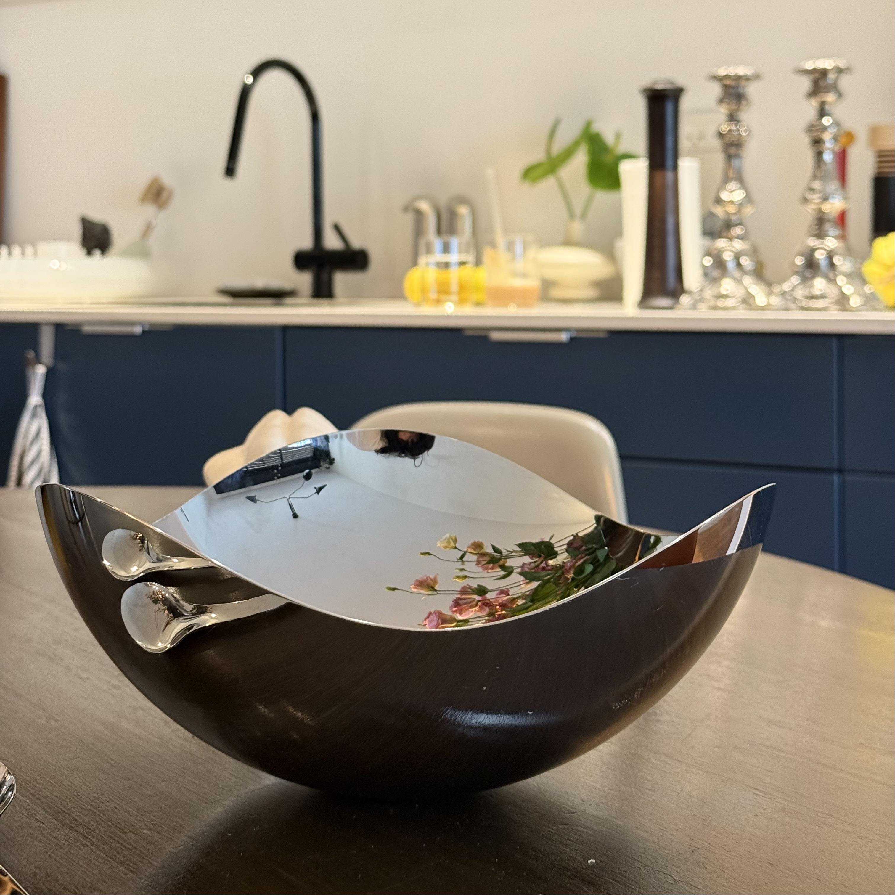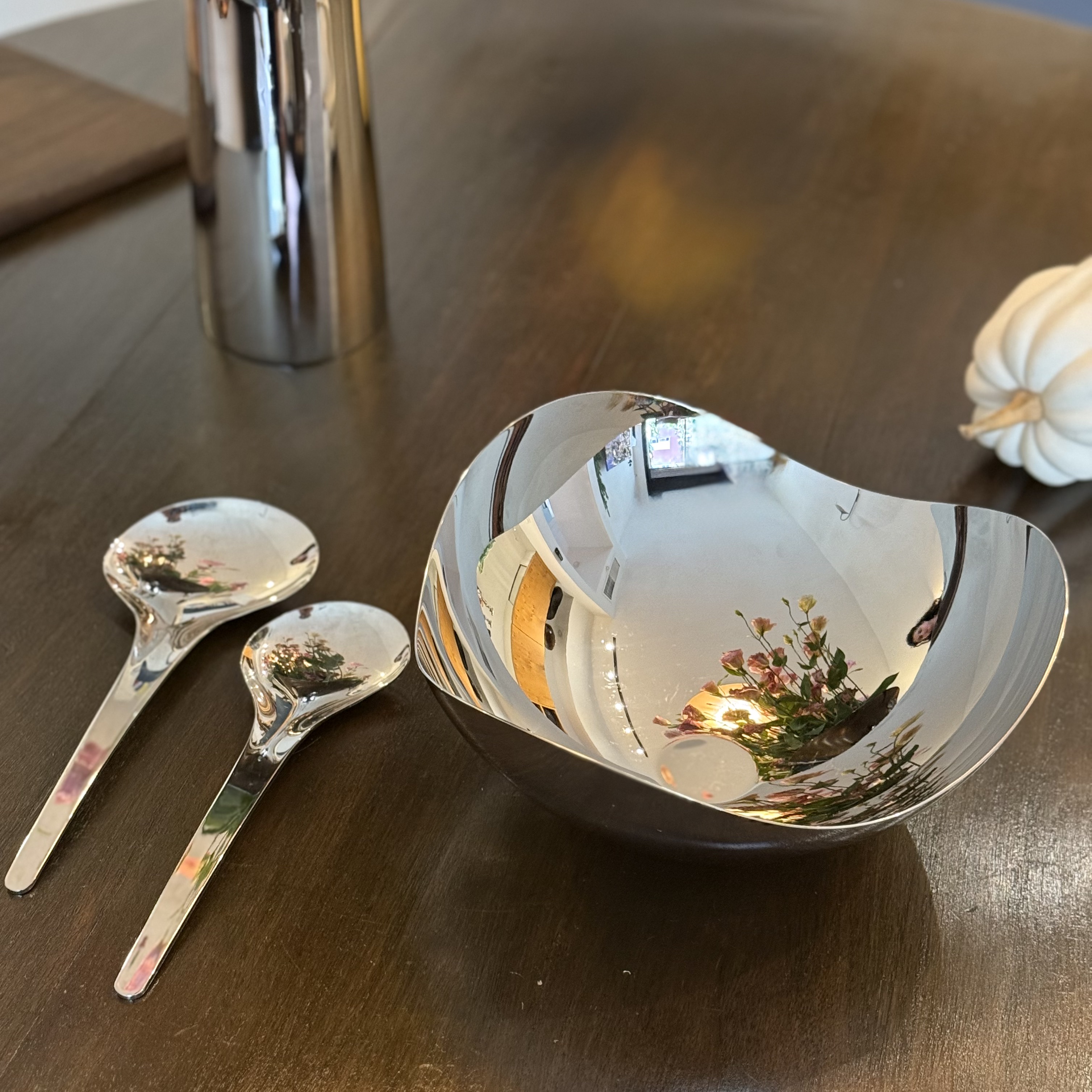 The Georg Jensen Bloom Bowl, designed by Helle, is a stunning piece of contemporary kitchenware that reflects the elegance and innovation of Danish design. Created in a modern era, this bowl exemplifies the minimalist yet sophisticated aesthetic that Georg Jensen is renowned for. The stainless steel material not only gives it a sleek, matte appearance but also ensures durability and timelessness, making it a perfect centerpiece for any dining table. The reflective surface of the bowl subtly captures the surrounding environment, adding an interactive element to its design. This piece is not just a functional kitchen item but also a statement of taste and class, embodying the Scandinavian tradition of combining form and function. Its creation reflects a cultural appreciation for simplicity and quality, hallmarks of modern Danish craftsmanship. The Bloom Bowl's gentle curves and polished finish invite touch and admiration, making it a cherished item in any home.