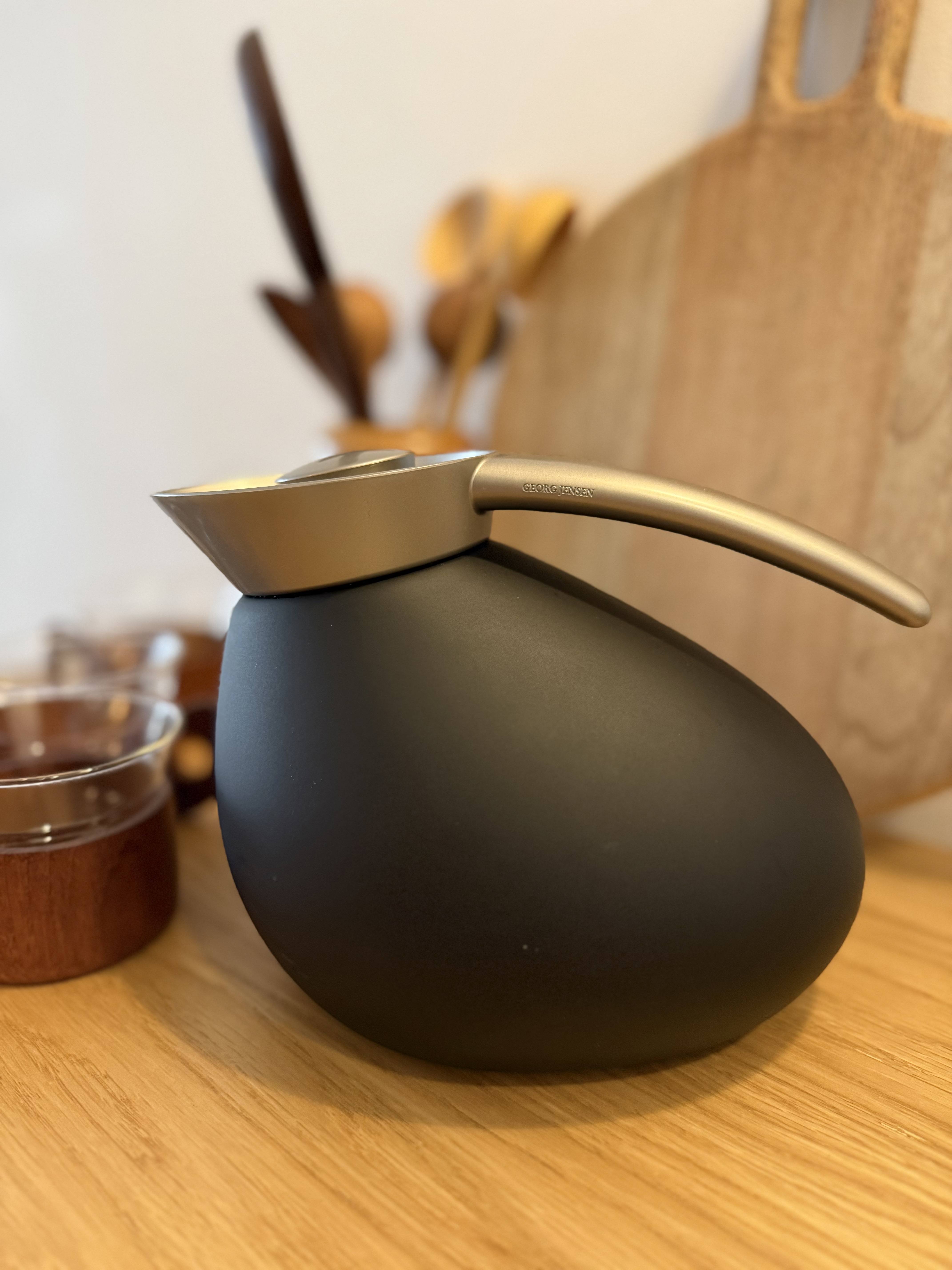 The Georg Jensen Quack Thermos Jug, designed by Maria Berntsen in the 1990s, epitomizes Scandinavian design's elegant functionality. Known for its sleek, organic form and subtle curvature, the jug stands as a distinctive piece in any modern kitchen. Maria Berntsen, a celebrated Danish designer, brought her minimalist yet sophisticated aesthetic to this piece, making it both a functional kitchen accessory and a statement of style. Georg Jensen, the brand behind this creation, has a storied history of crafting high-quality design objects since its founding in Denmark in 1904. The jug's name, 'Quack', whimsically hints at its playful yet refined design, reminiscent of a duck in repose. Crafted from stainless steel and plastic, it features a matte black body with a contrasting silver handle, ensuring durability and a contemporary look. Its ergonomic design not only adds visual interest but also offers practical benefits, such as ease of pouring and insulation to keep beverages hot or cold. This piece reflects the Danish cultural emphasis on design that marries form and function, catering to a lifestyle where aesthetics and utility coexist seamlessly. Collectors and design enthusiasts value the Quack Thermos for its unique design and the legacy of the Georg Jensen brand, making it a sought-after item in vintage markets.