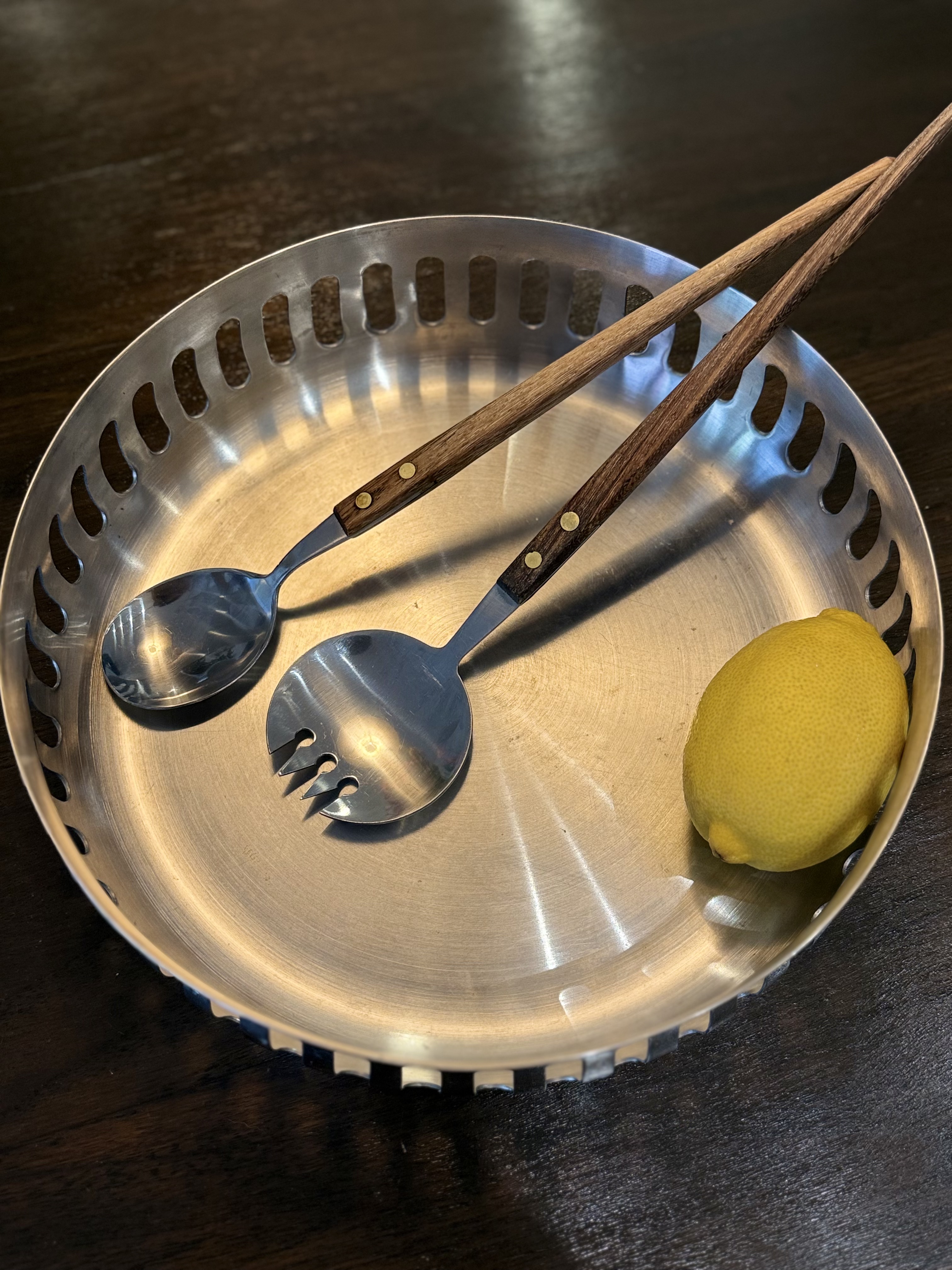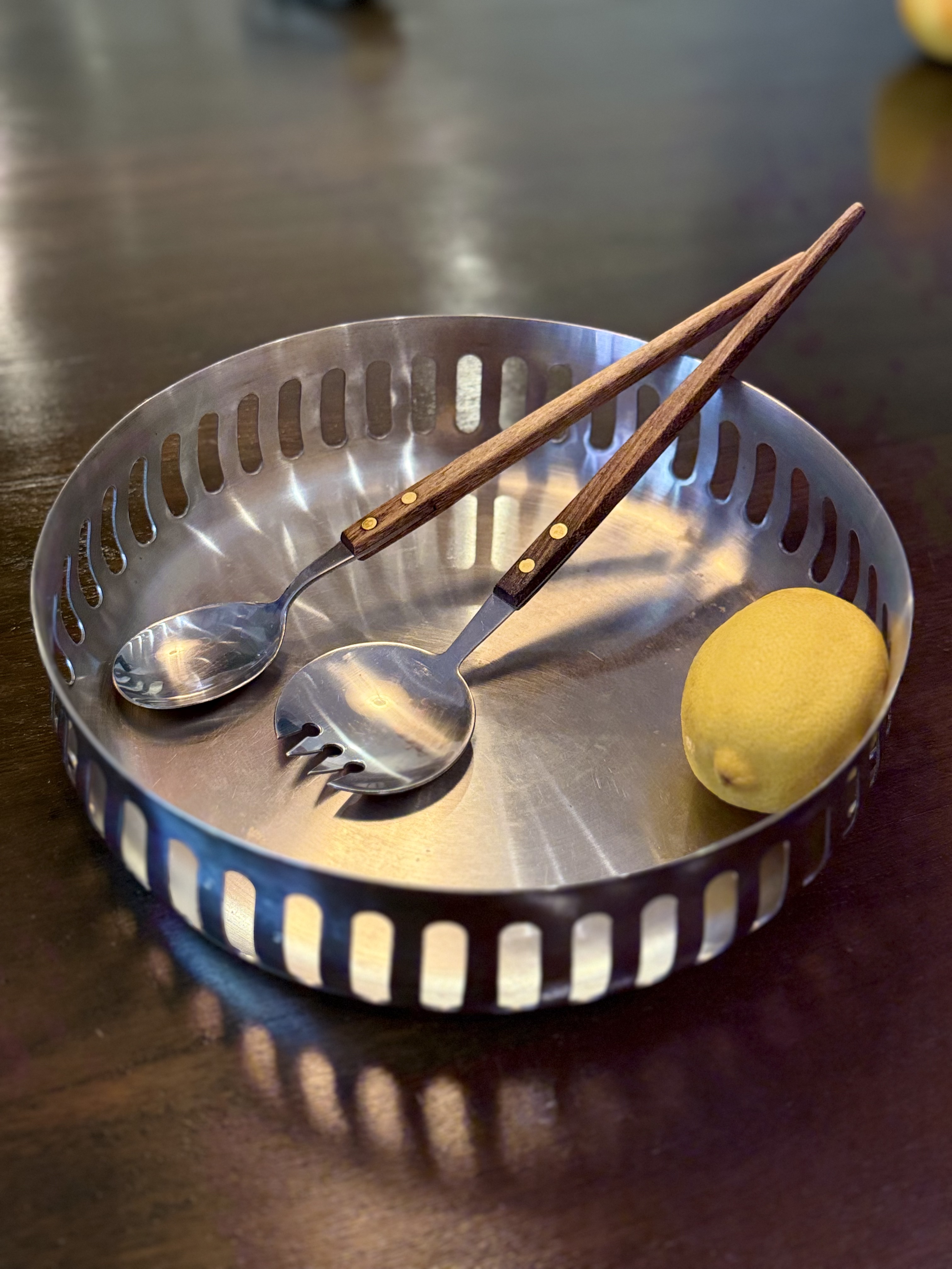 The Erik Bagger Salad Bowl Set represents a modern interpretation of Scandinavian design, crafted in Denmark during the 2000s. Known for his minimalist yet functional pieces, Erik Bagger has made a significant mark in the world of kitchenware and home design. His background as a trained goldsmith lends a meticulous attention to detail in his work, blending form and function. This salad bowl set, made of high-quality stainless steel with wooden-handled serving utensils, reflects Bagger's commitment to both aesthetics and practicality. Measuring approximately 25 cm in diameter and 5 cm in height, the bowl's sleek, polished finish makes it suitable for both everyday use and special occasions. The openwork pattern around the edge not only adds visual interest but also a sense of lightness, synonymous with Scandinavian design principles. In the 2000s, such sets became part of a wider trend emphasizing casual elegance and multifunctionality in home dining. While the set is no longer in production, its design continues to be sought after by collectors and those who appreciate minimalist decor. This piece provides insights into early 21st-century domestic rituals, where practicality met style, and reflects the growing global appeal of Danish design during this period.