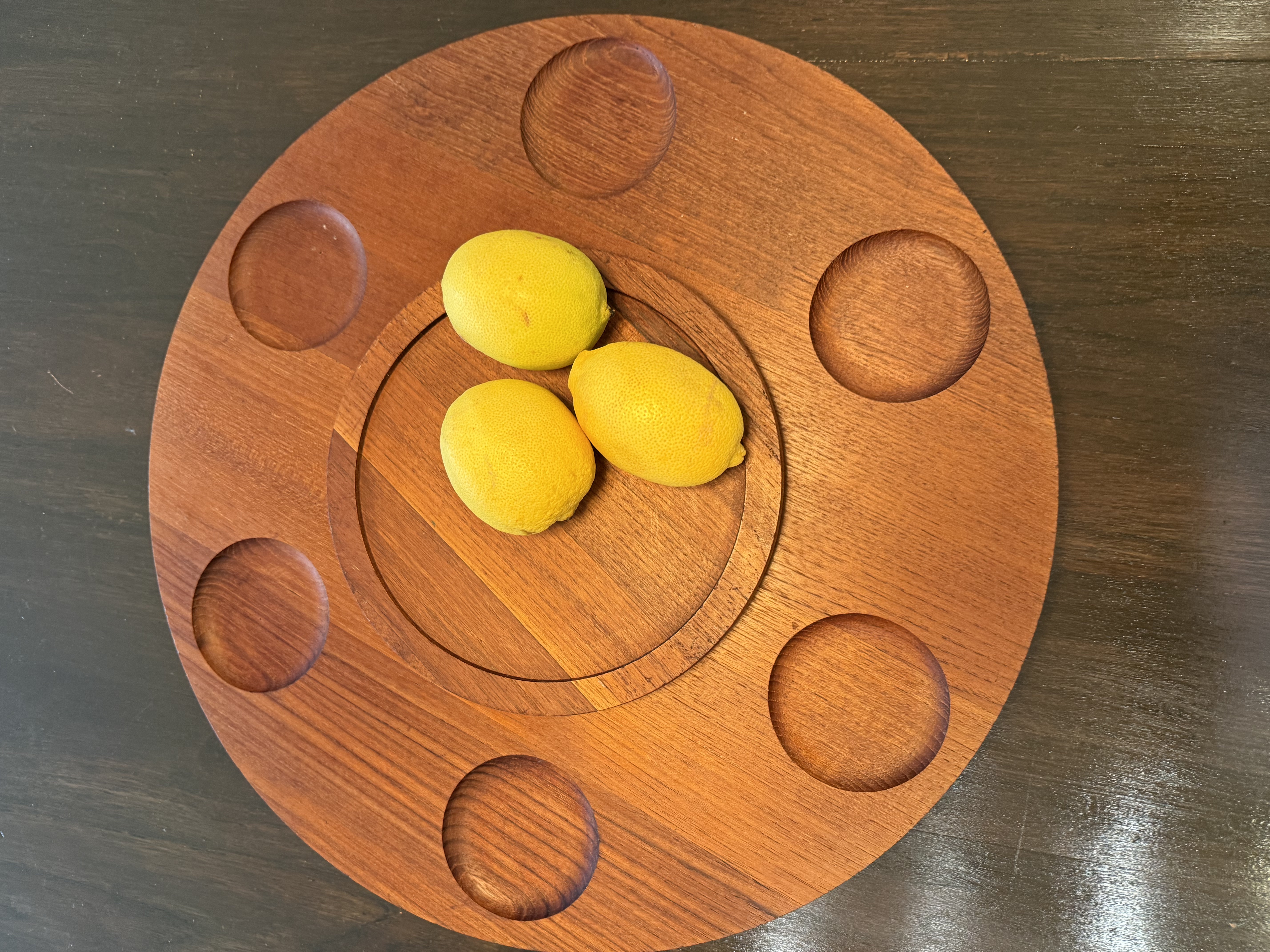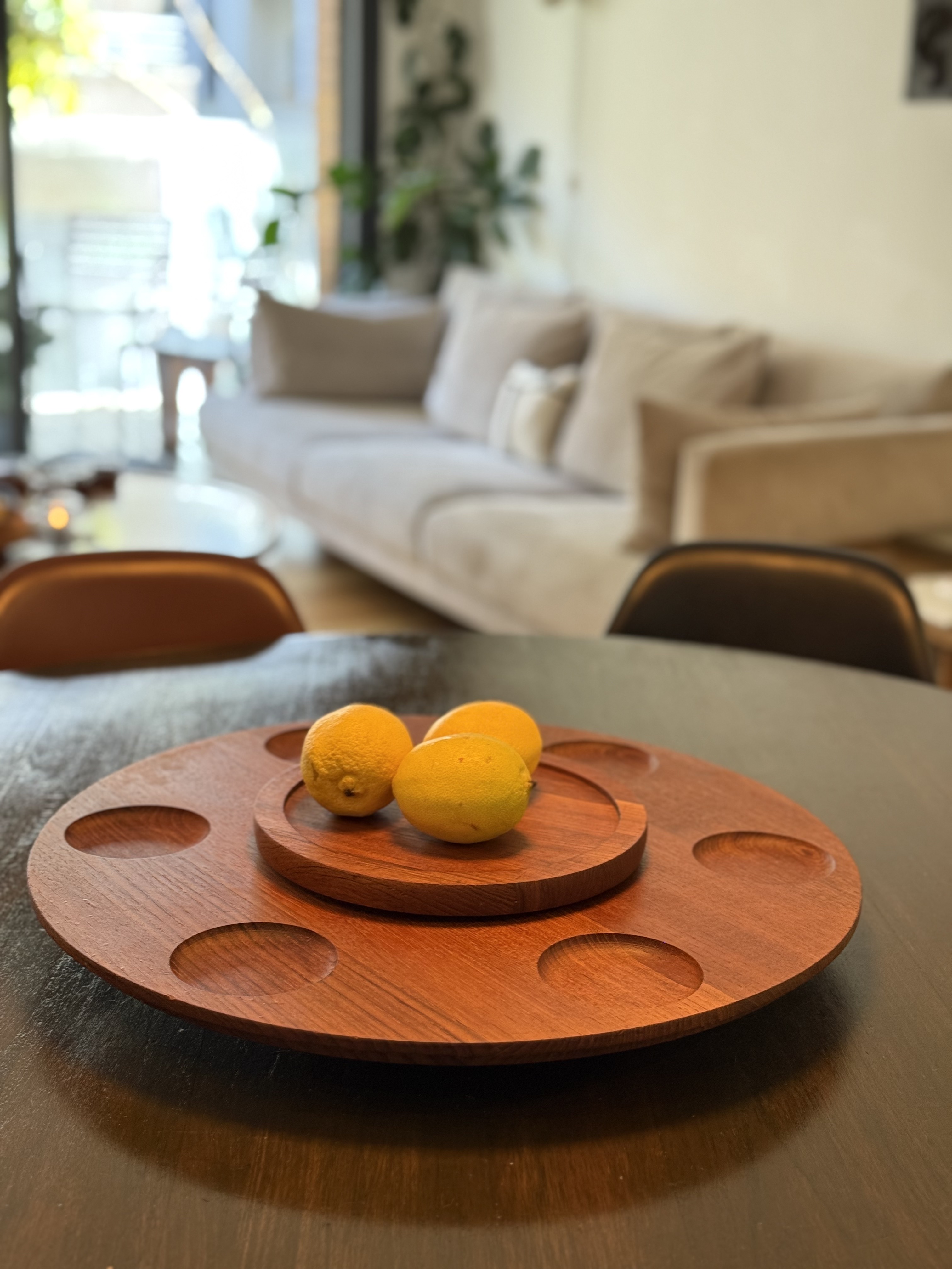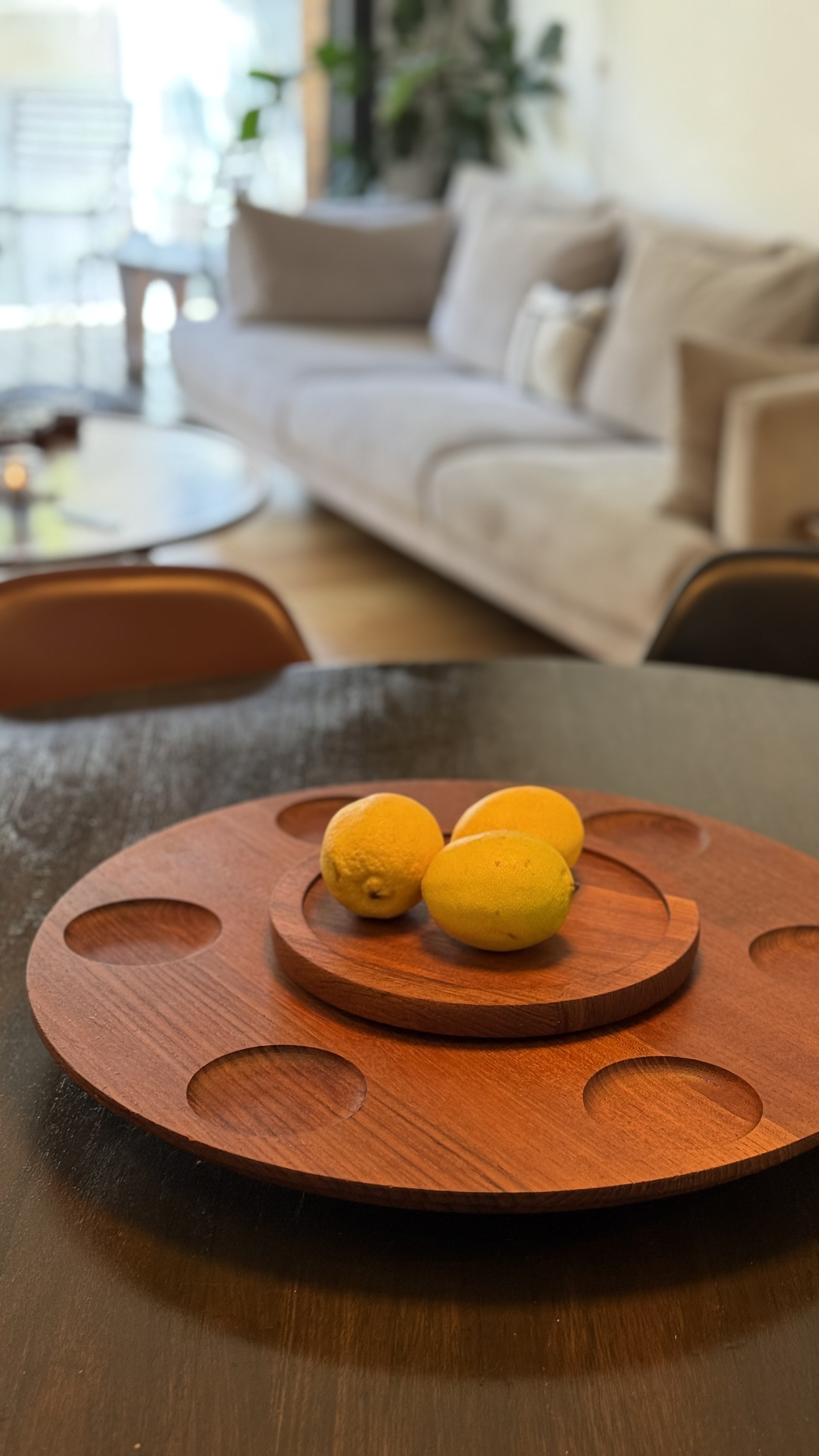 Original Danish teak Lazy Susan, a circular rotating tray with 6 wells (~7.5 cm each). Overall diameter approx. 45 cm, height approx. 7 cm. Classic Scandinavian design with light age‑appropriate wear. Pickup in Tel Aviv or shipping available.