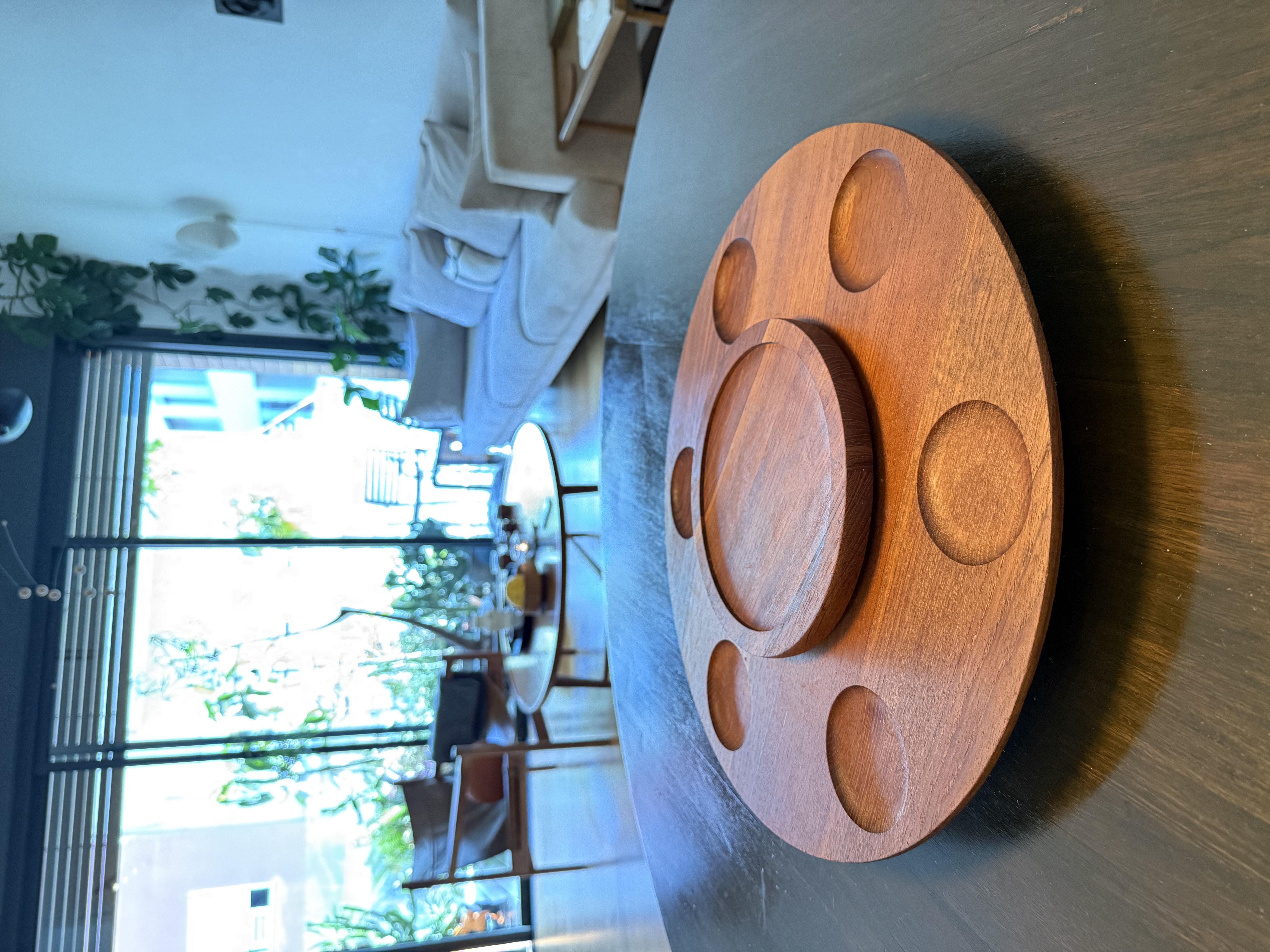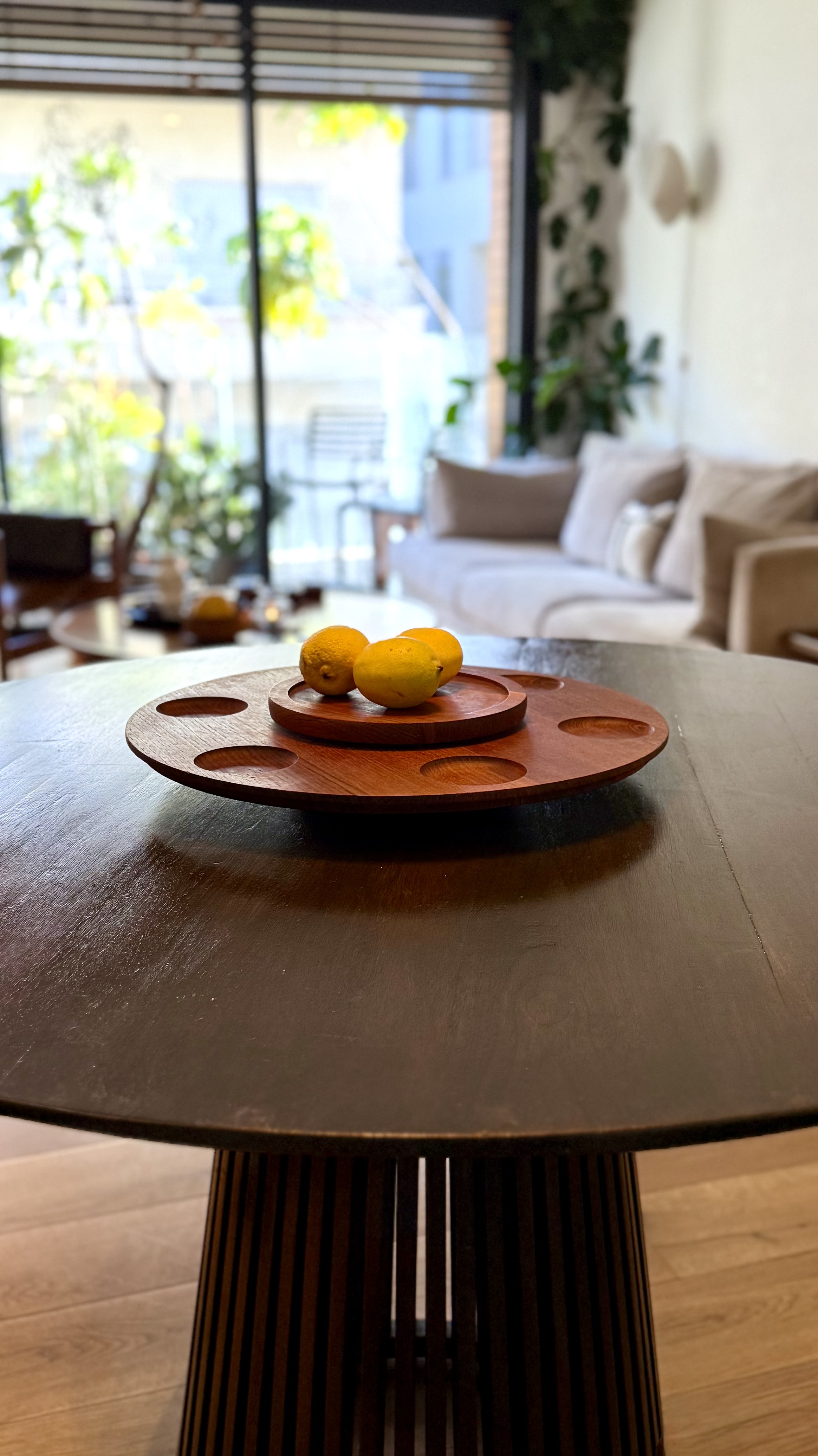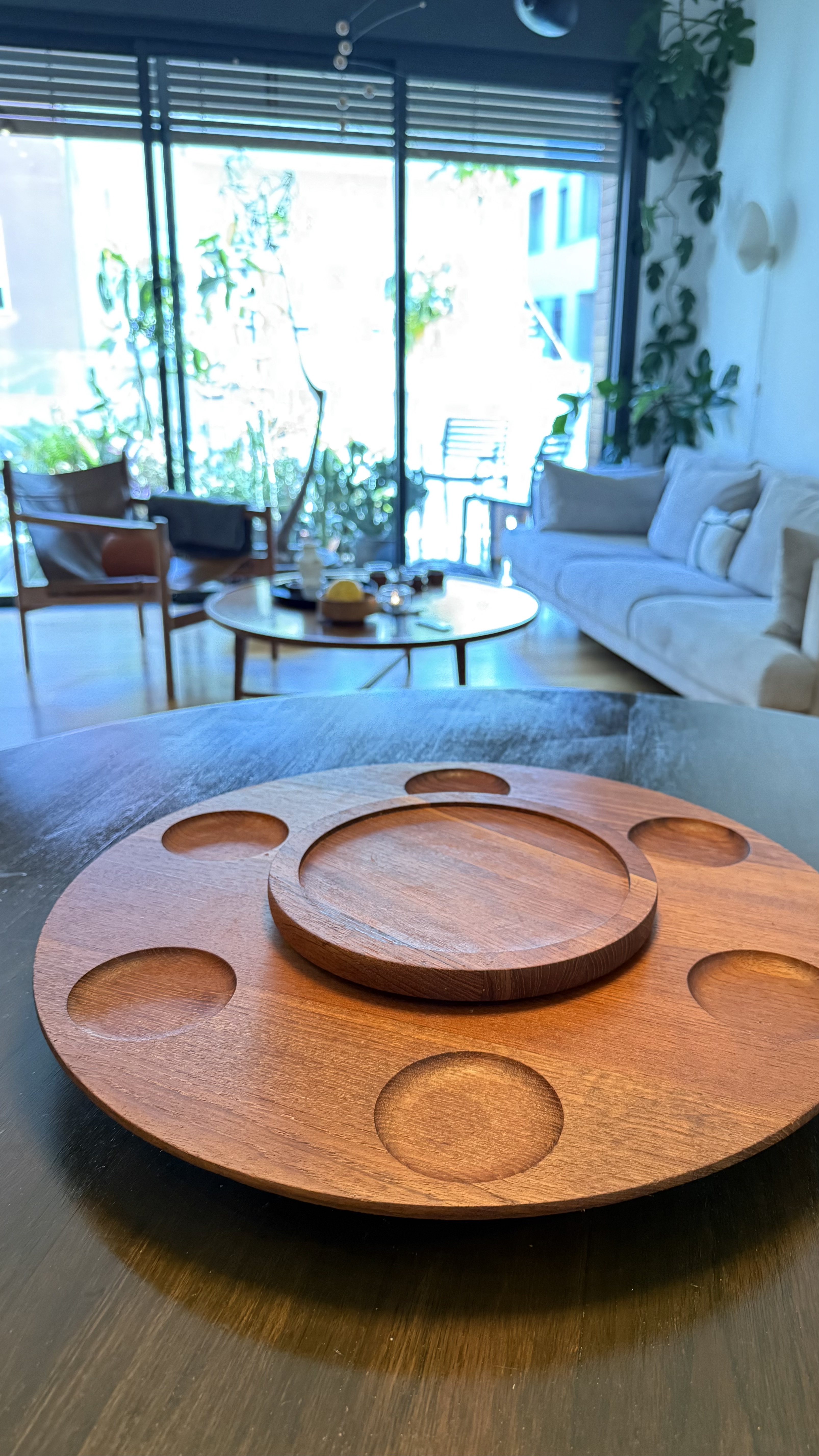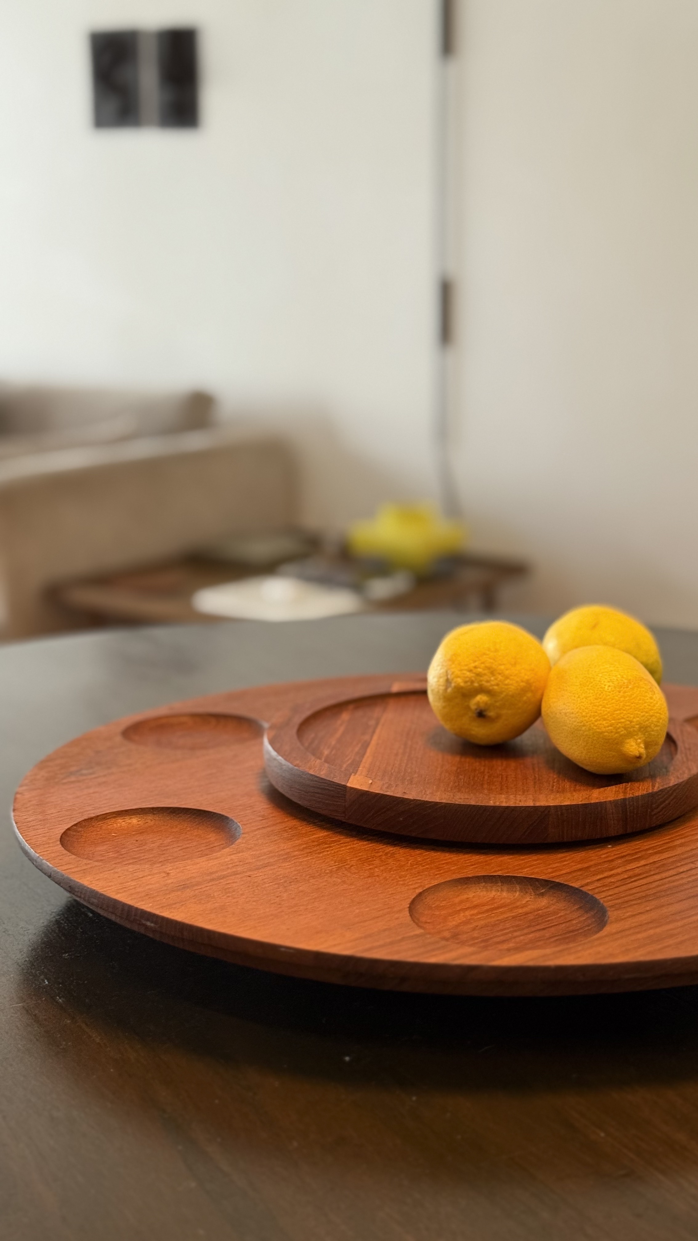 Original Danish teak Lazy Susan, a circular rotating tray with 6 wells (~7.5 cm each). Overall diameter approx. 45 cm, height approx. 7 cm. Classic Scandinavian design with light age‑appropriate wear. Pickup in Tel Aviv or shipping available.