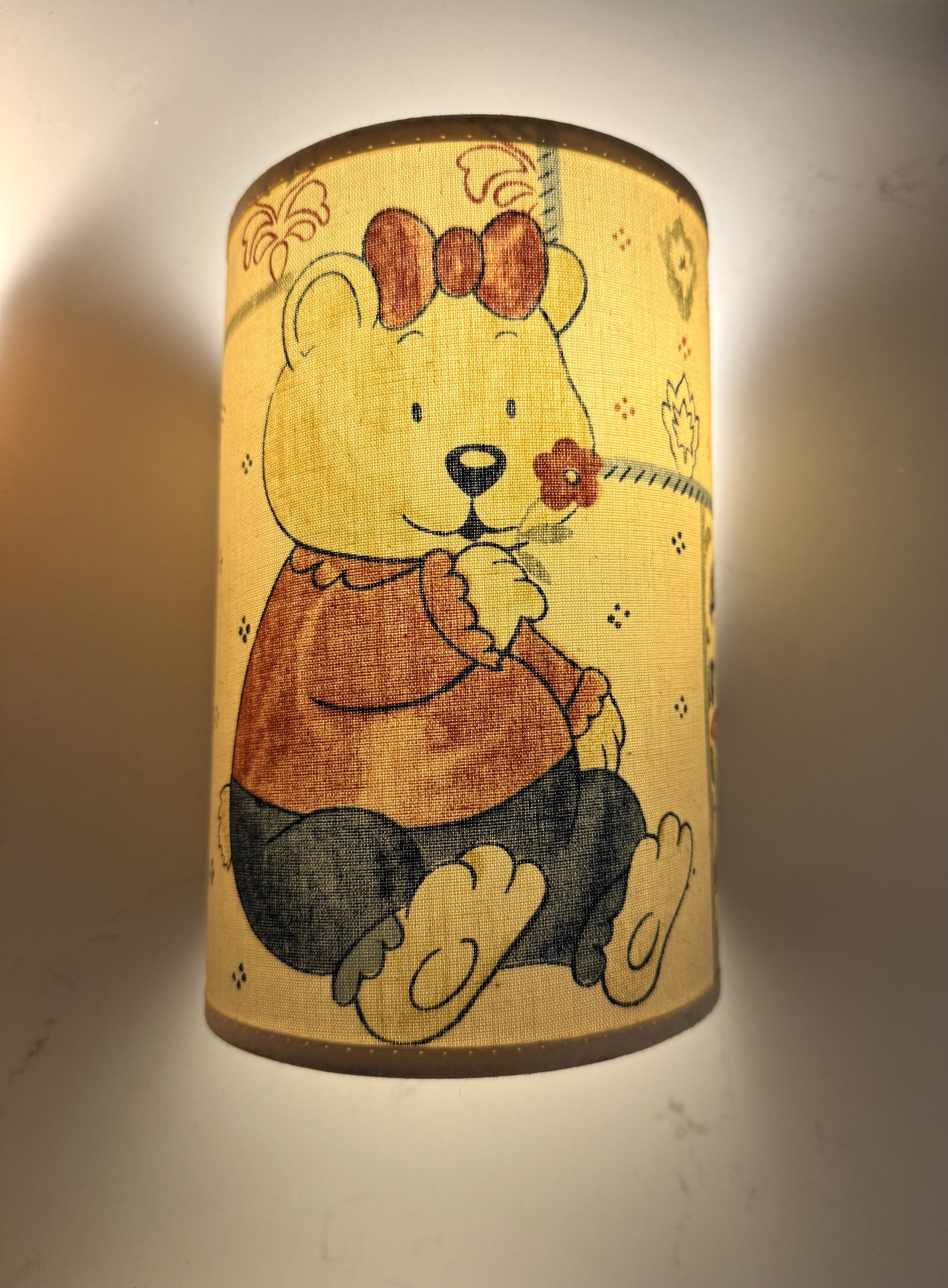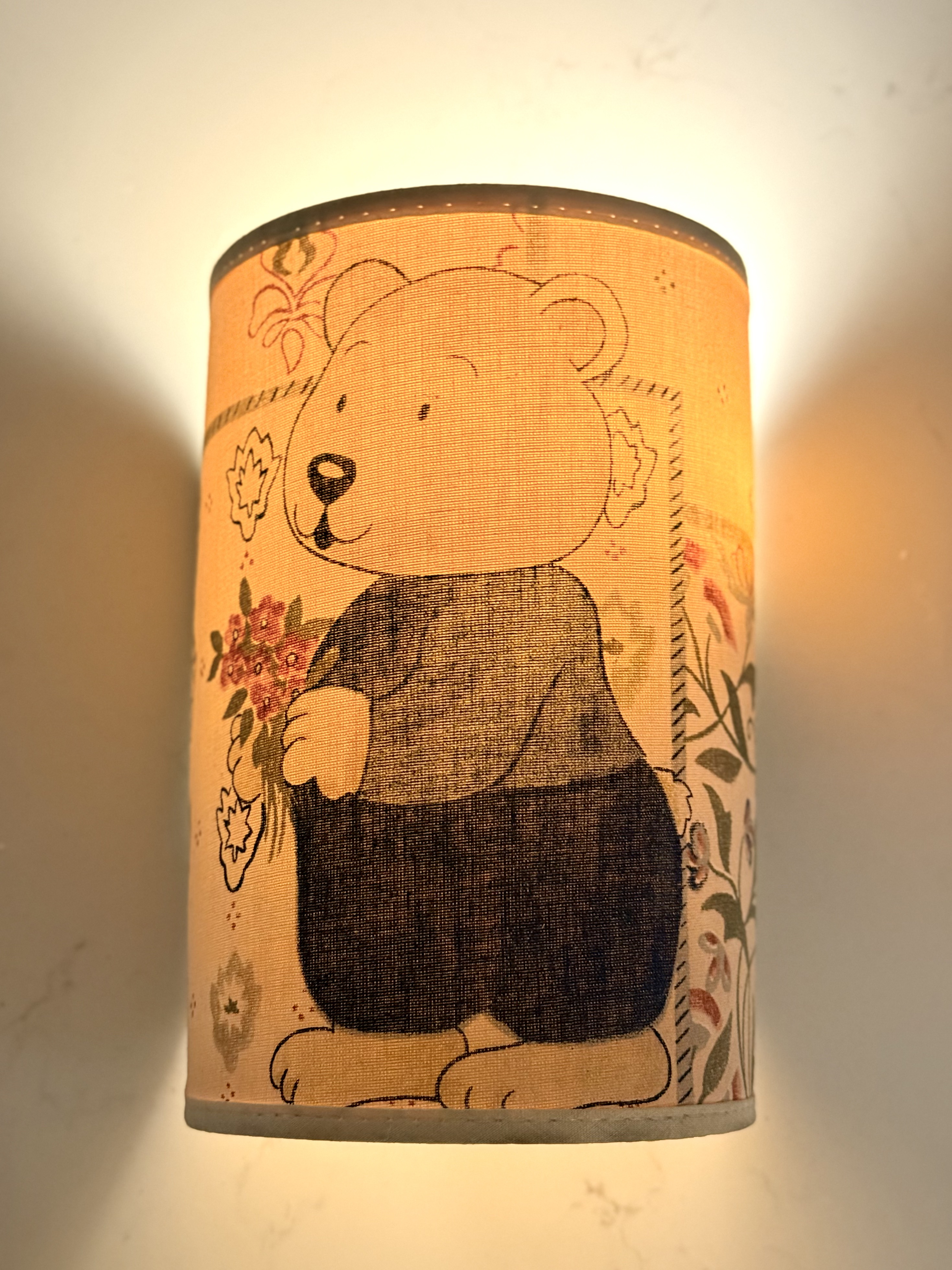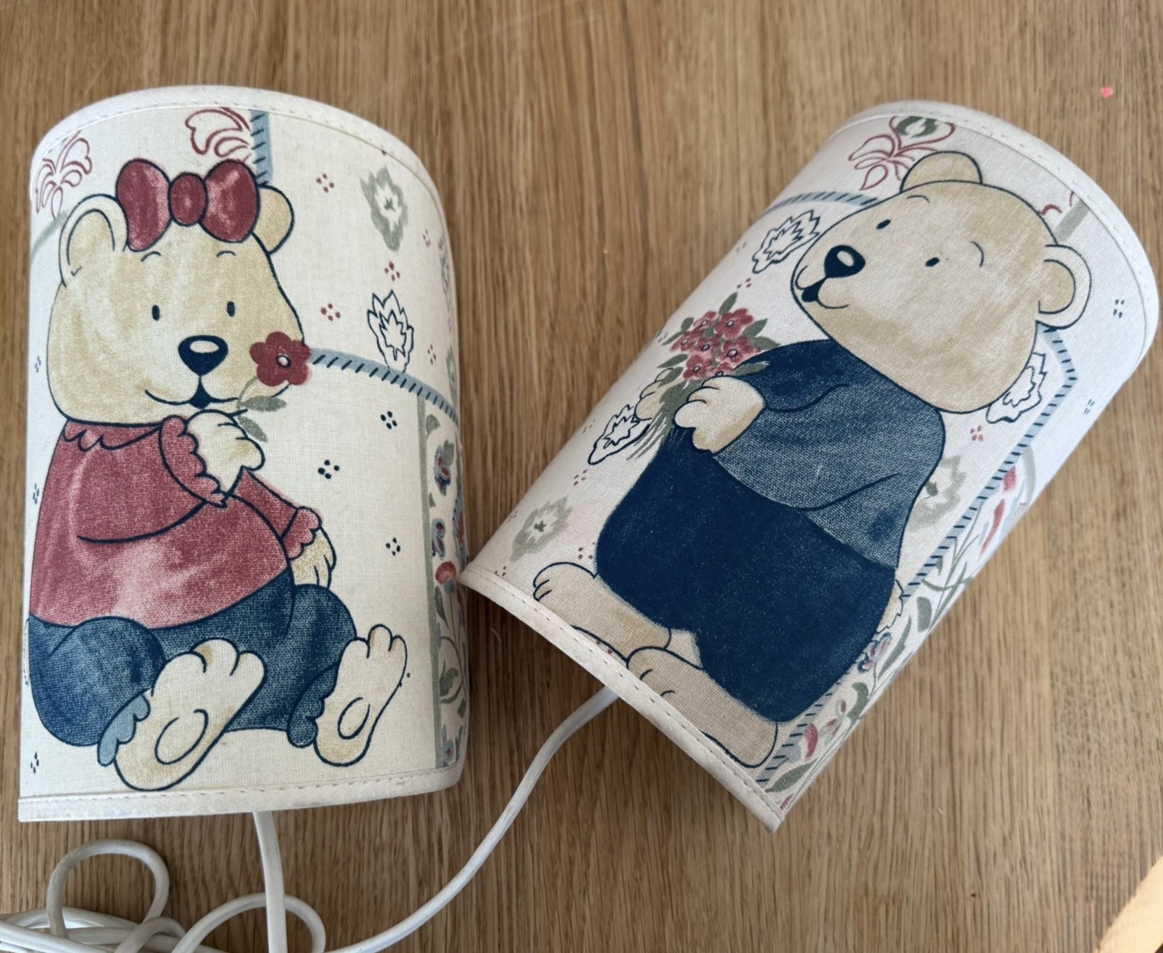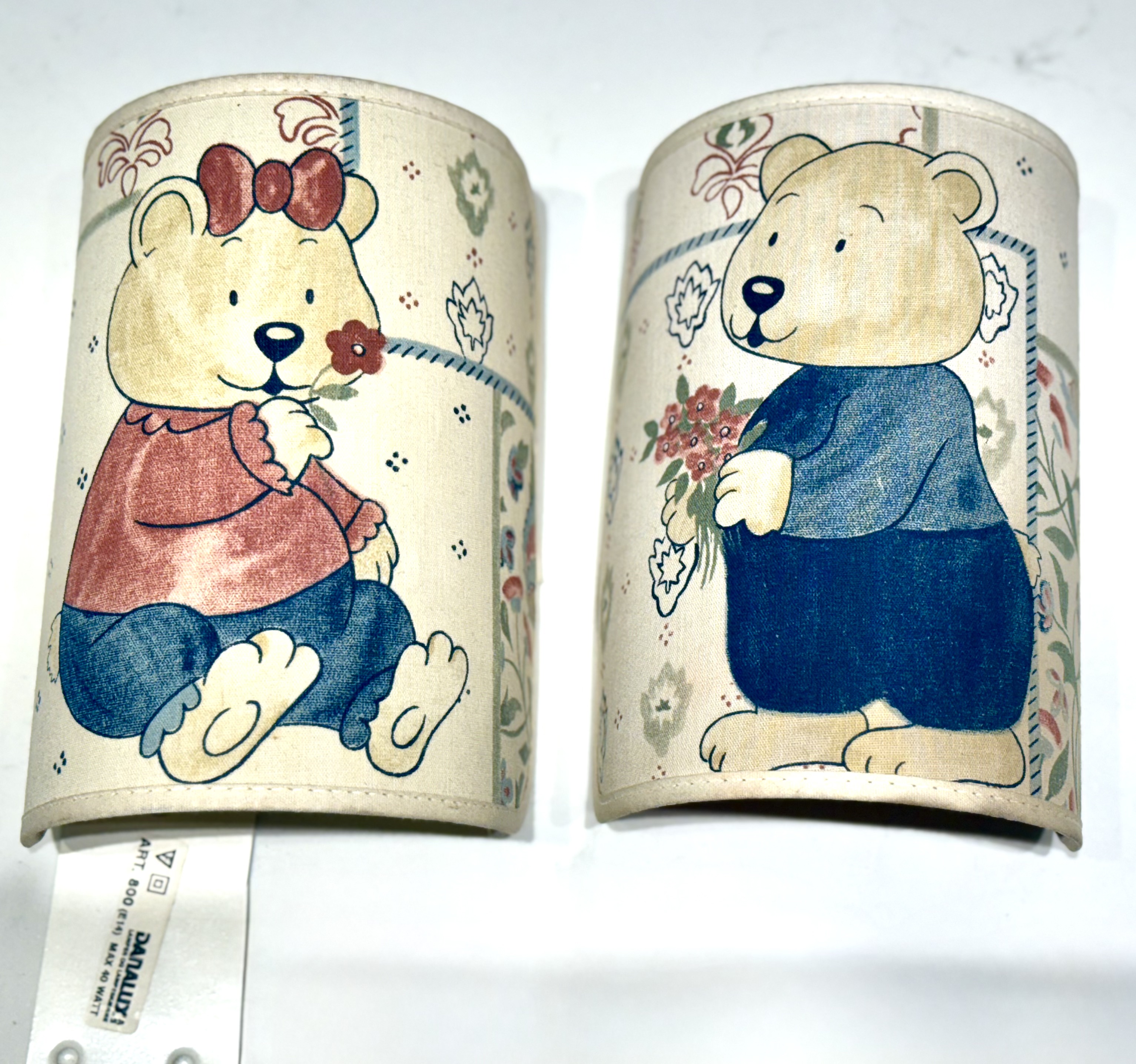 These charming children's wall lamps by Daralus were popular in the 1990s and feature delightful bear illustrations that bring a touch of whimsy to any child's room. Designed to appeal to young children, the lamps are constructed with a blend of fabric lampshades and a sturdy metal backing, ensuring durability while providing a soft, comforting glow. The design, identified as Art. 800, showcases a boy and girl bear holding flowers, appealing strongly to the nostalgia-driven market for vintage children's decor. The intricate details in the fabric print, highlighted in classic colors of the era, mark a period when thematic decor items were central to crafting inviting spaces for children. Originating from Denmark, these lamps are reflective of Scandinavian design principles: simplicity, functionality, and beauty. While designed primarily as functional items, the lamps carry cultural significance, illustrating a shift towards personalized children's spaces during the late 20th century. The estimated dimensions are approximately H 20 × W 12 cm. Such items often surface in secondhand markets, where the playful design and vintage appeal can command interest from collectors and decorators alike.