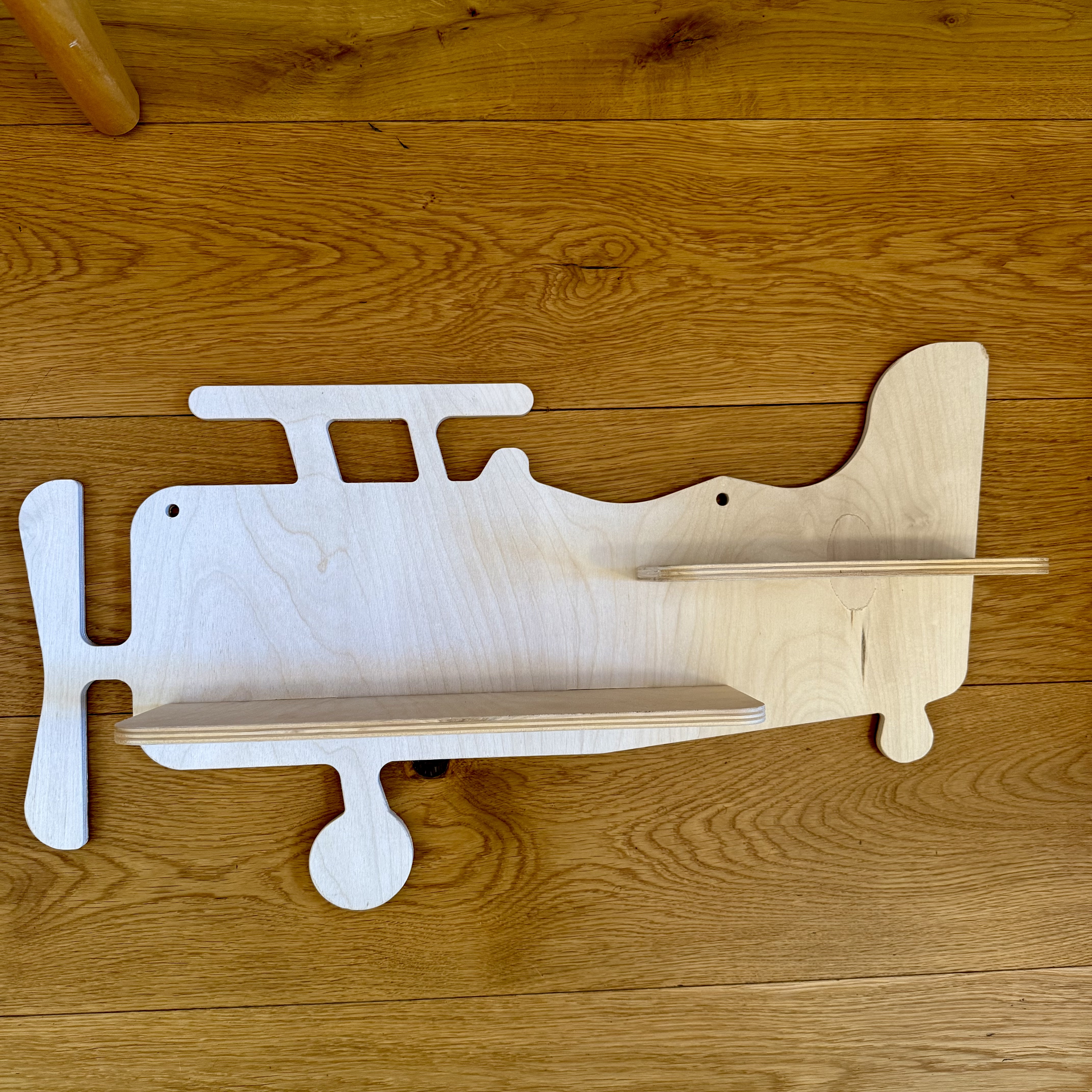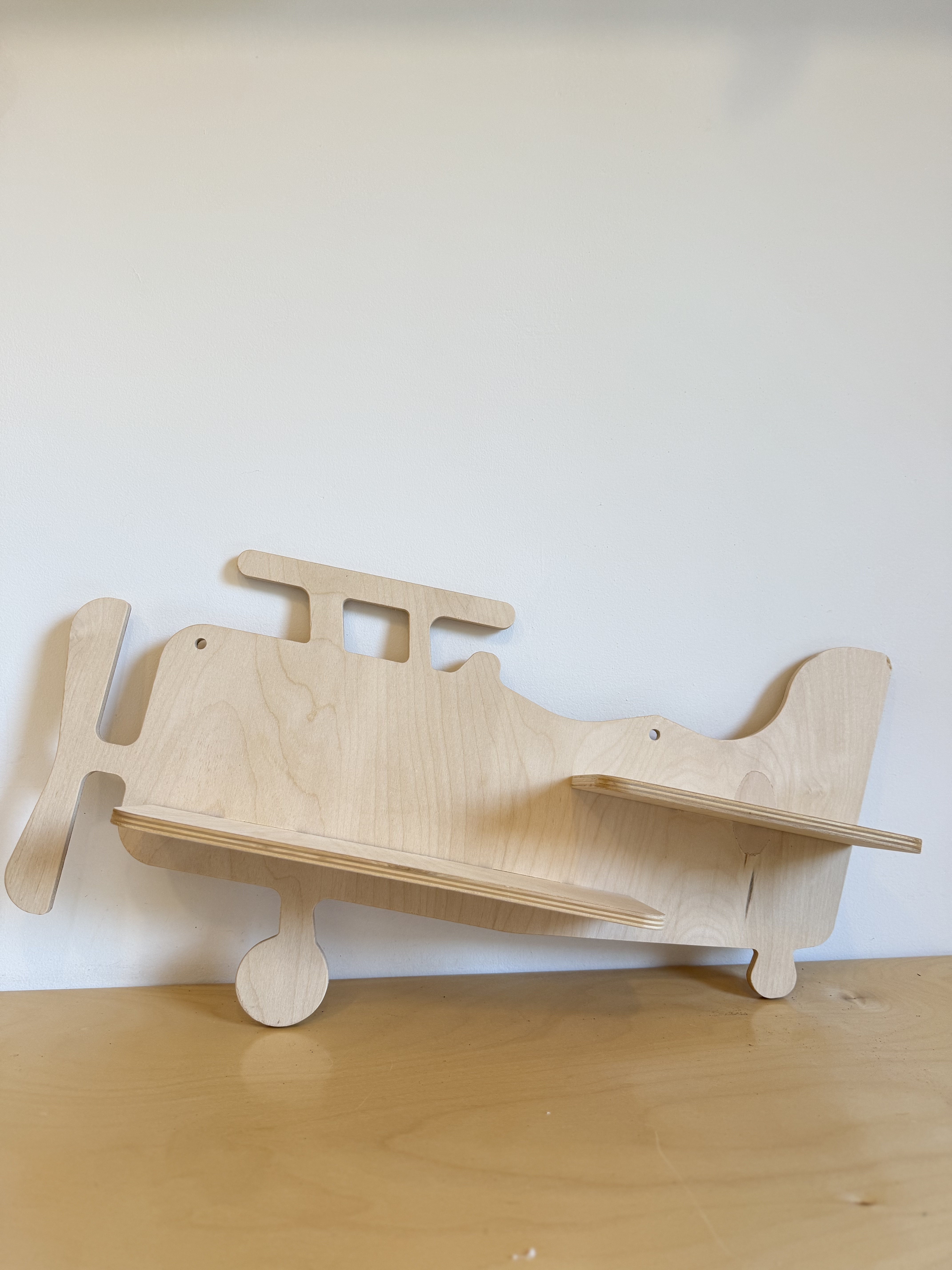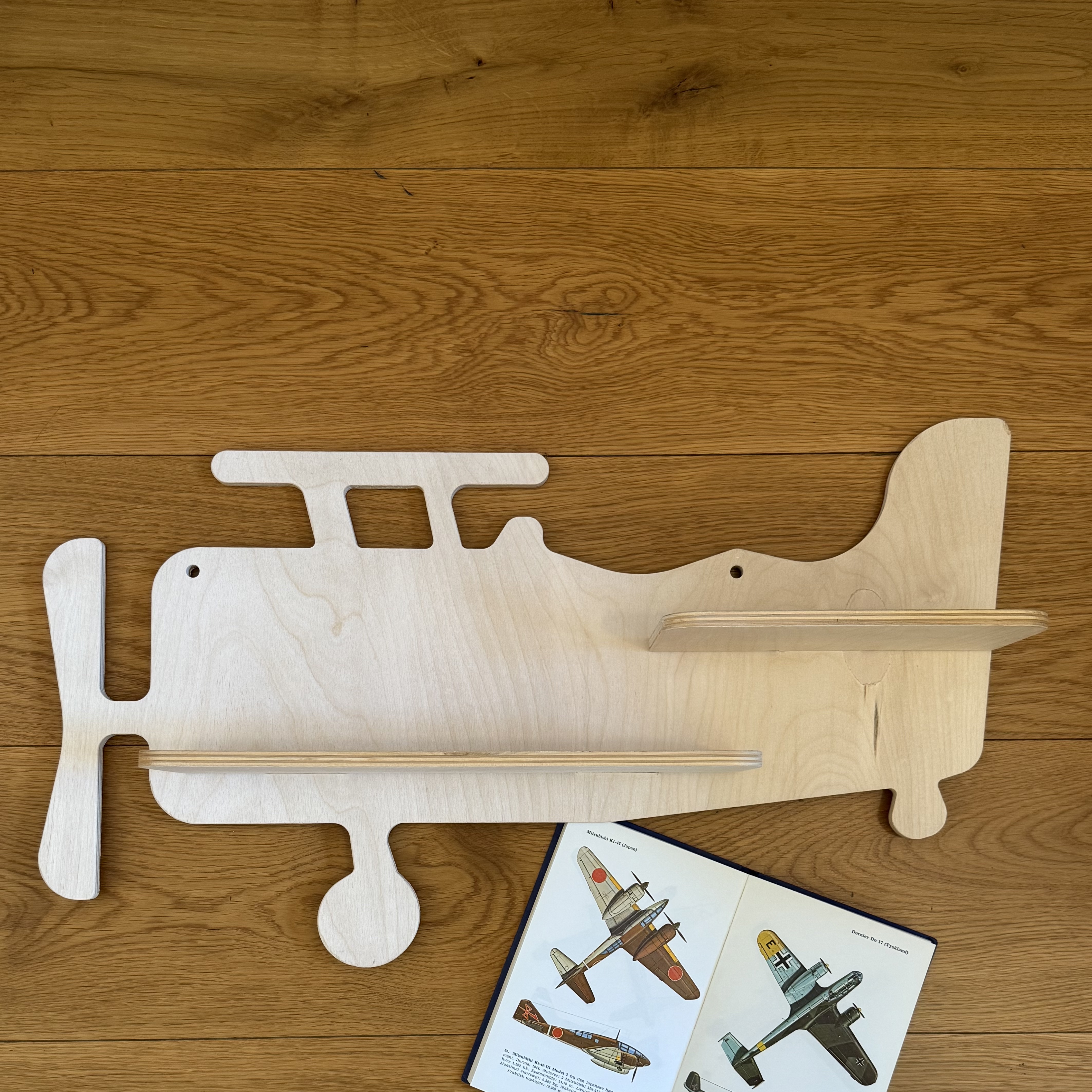 The Pixiform Airplane Wall Shelf 'Christian' is a charming piece of furniture that blends functionality with whimsical design. Emerging in the 2020s, this wooden shelf is crafted to resemble a classic biplane, offering a playful yet practical addition to children's rooms or aviation enthusiasts' spaces. Made in Denmark, known for its rich design heritage, this shelf exemplifies Scandinavian minimalism and craftsmanship. The natural wood finish maintains a clean, modern aesthetic while subtly highlighting the grain of the material. This wall shelf not only serves as a decorative piece but also provides storage for books and toys, reflecting a trend towards multi-purpose furniture in contemporary interior design. Its design echoes the fascination with flight and adventure, capturing imaginations and bringing a touch of nostalgia with its retro airplane silhouette. Although it's a modern piece, its vintage-inspired shape draws from early 20th-century aviation, making it a conversation starter. Measuring approximately 60cm by 25cm, it's an ideal size for small to medium spaces. This item speaks to a growing appreciation for personalized, theme-based decor that can transform a room's feel with a single statement piece.