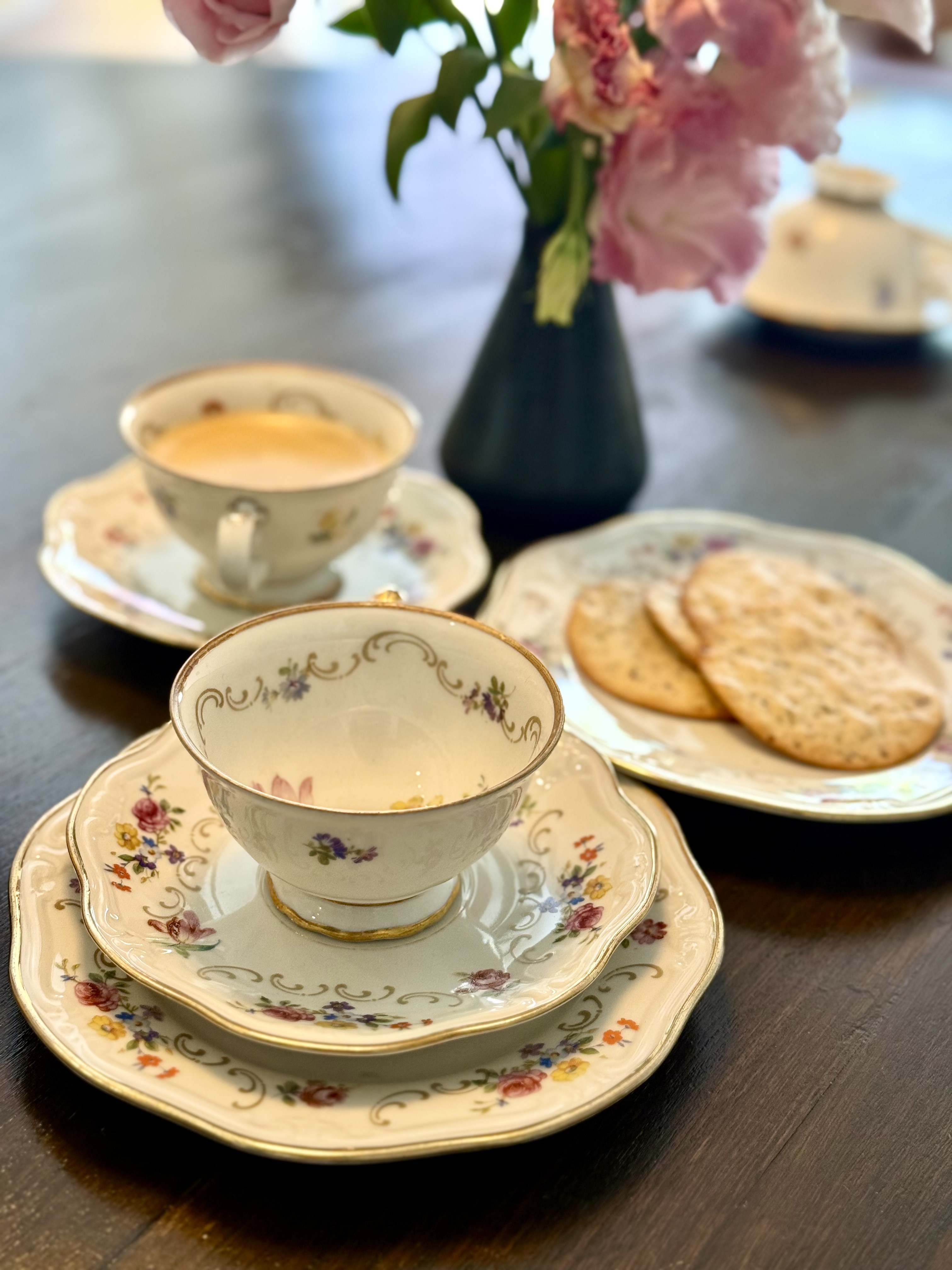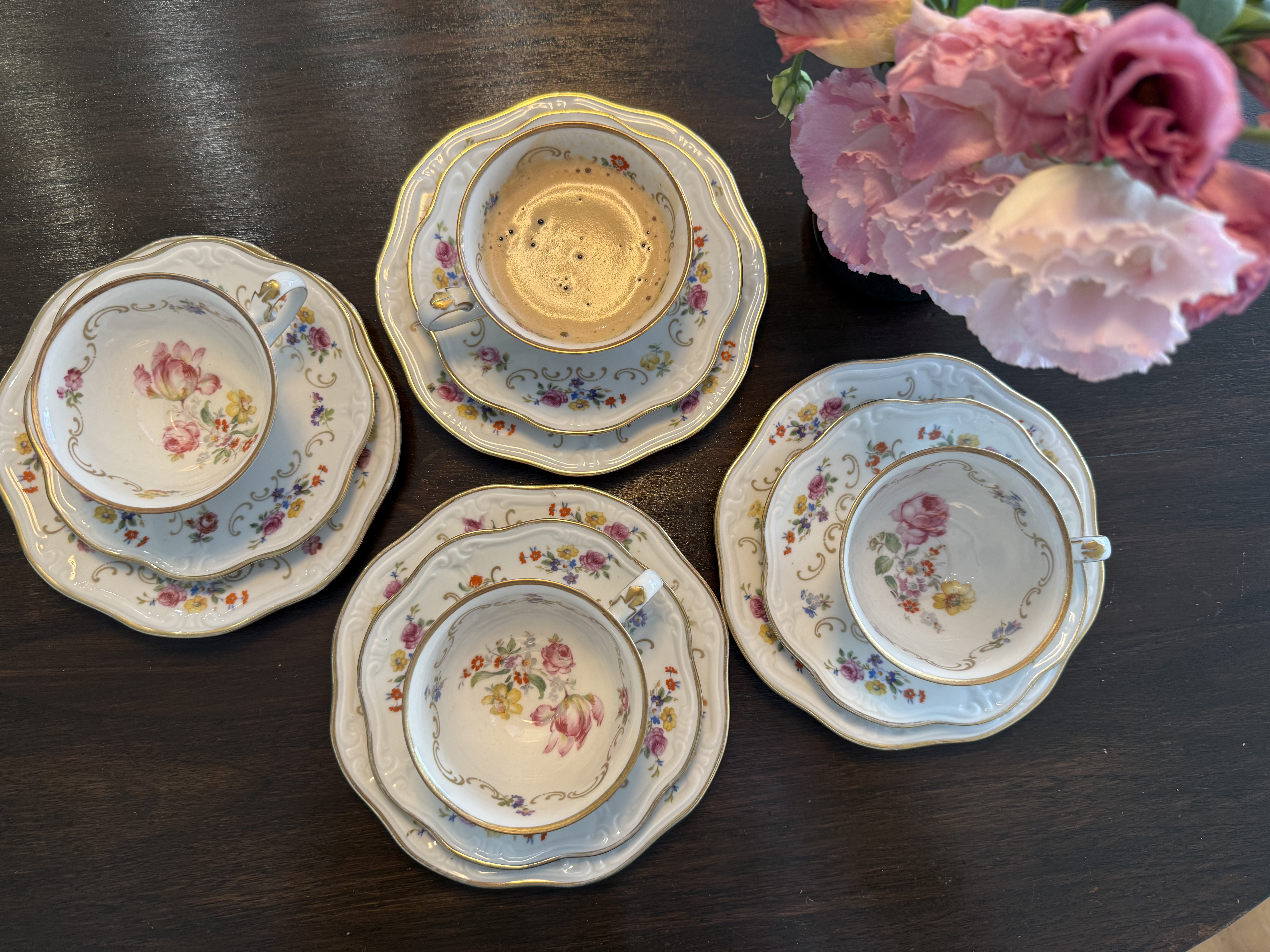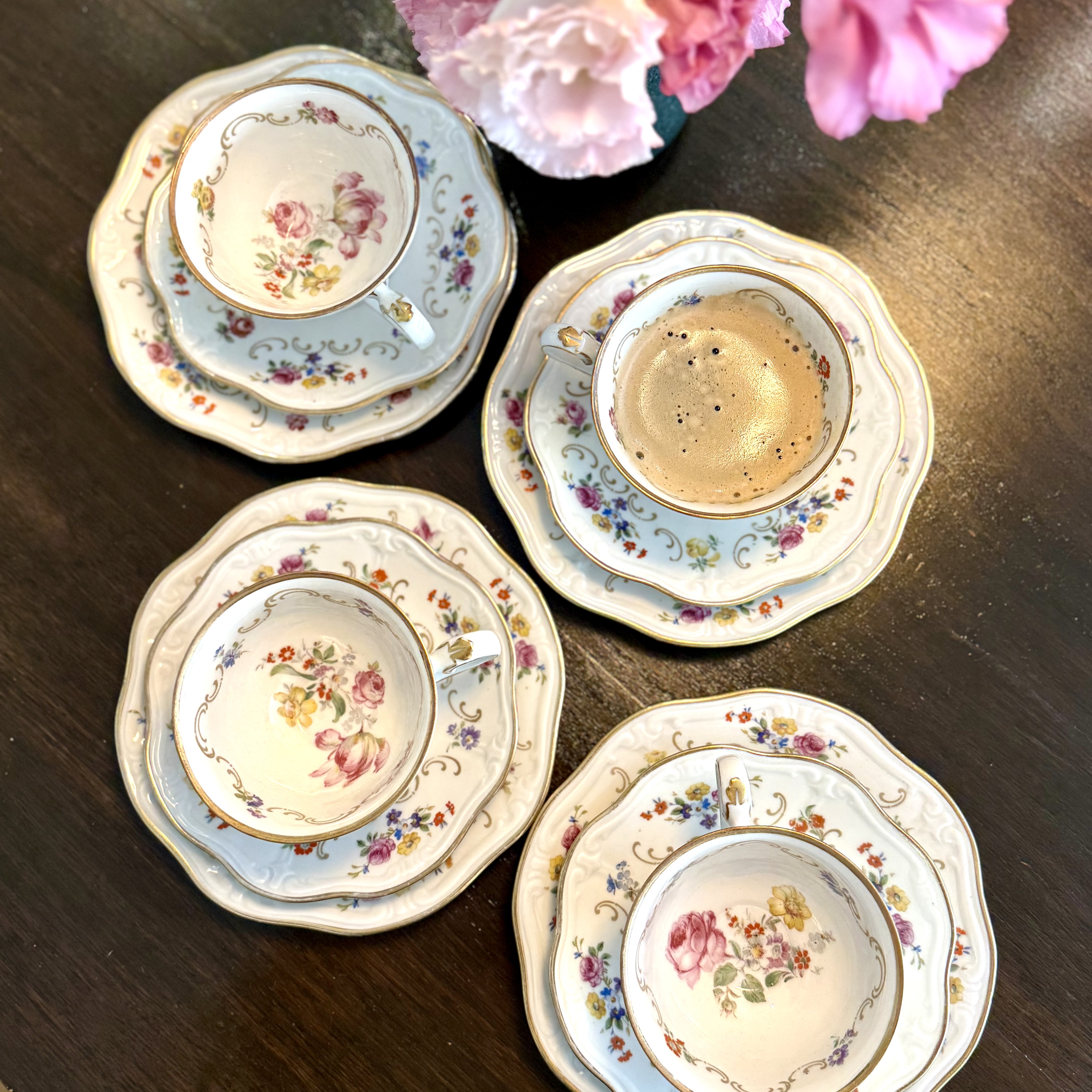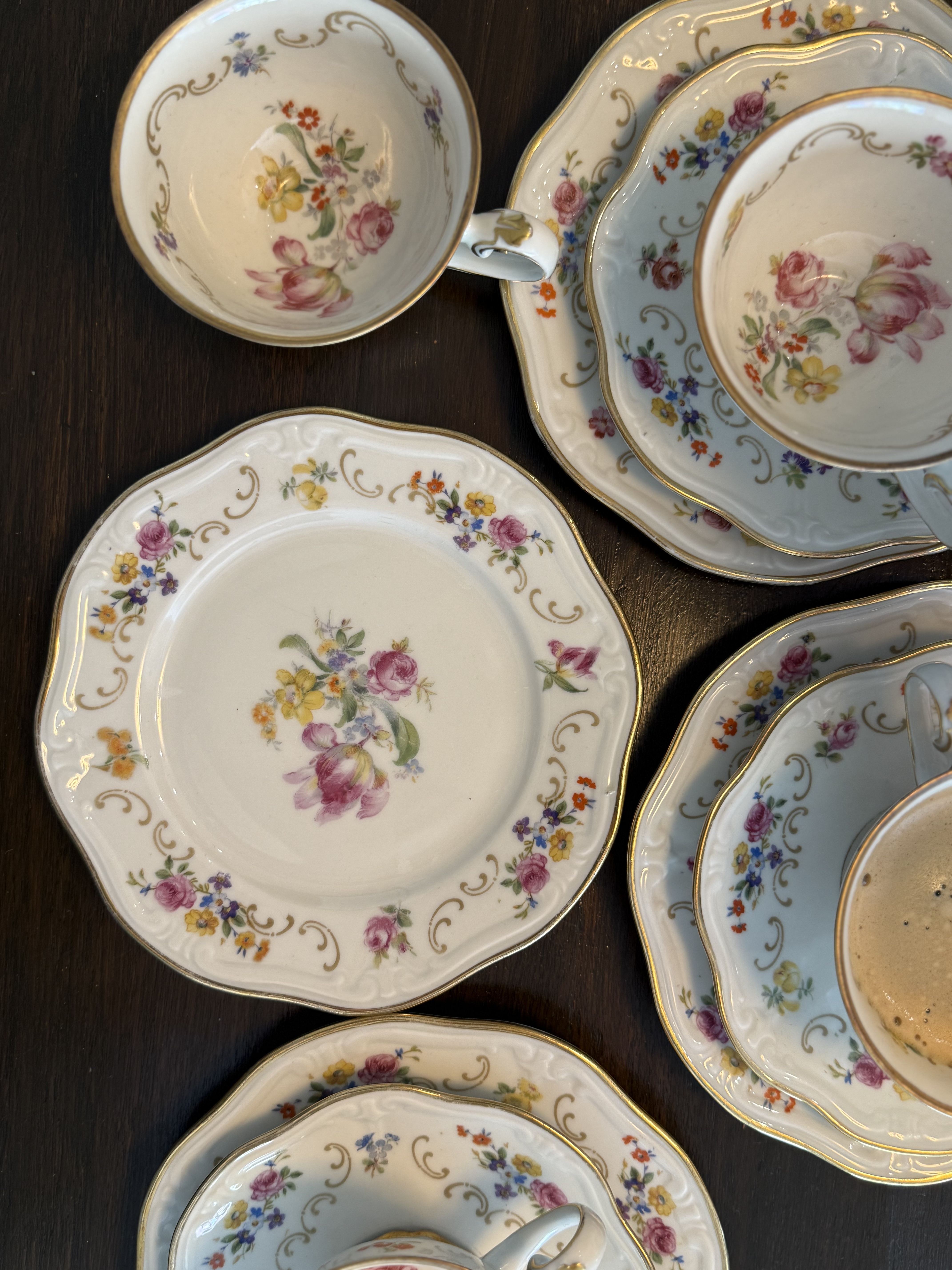 Reichenbach cup and saucer with 24 karat gold decoration. Reichenbach is a German porcelain manufacturer from Thuringia that produced fine dinnerware during the 1960s-1970s era. VEB (Volkseigener Betrieb) marked pieces indicate production during East Germany's rule, with marks showing 'GDR' (German Democratic Republic) dating from approximately 1968-1990. Reichenbach porcelain from this period typically features 24 karat gold gilt decoration, fine porcelain construction, and designs like cobalt blue with gold accents or floral patterns. The porcelain is considered fine quality vintage collectible dinnerware from East Germany's manufacturing period.