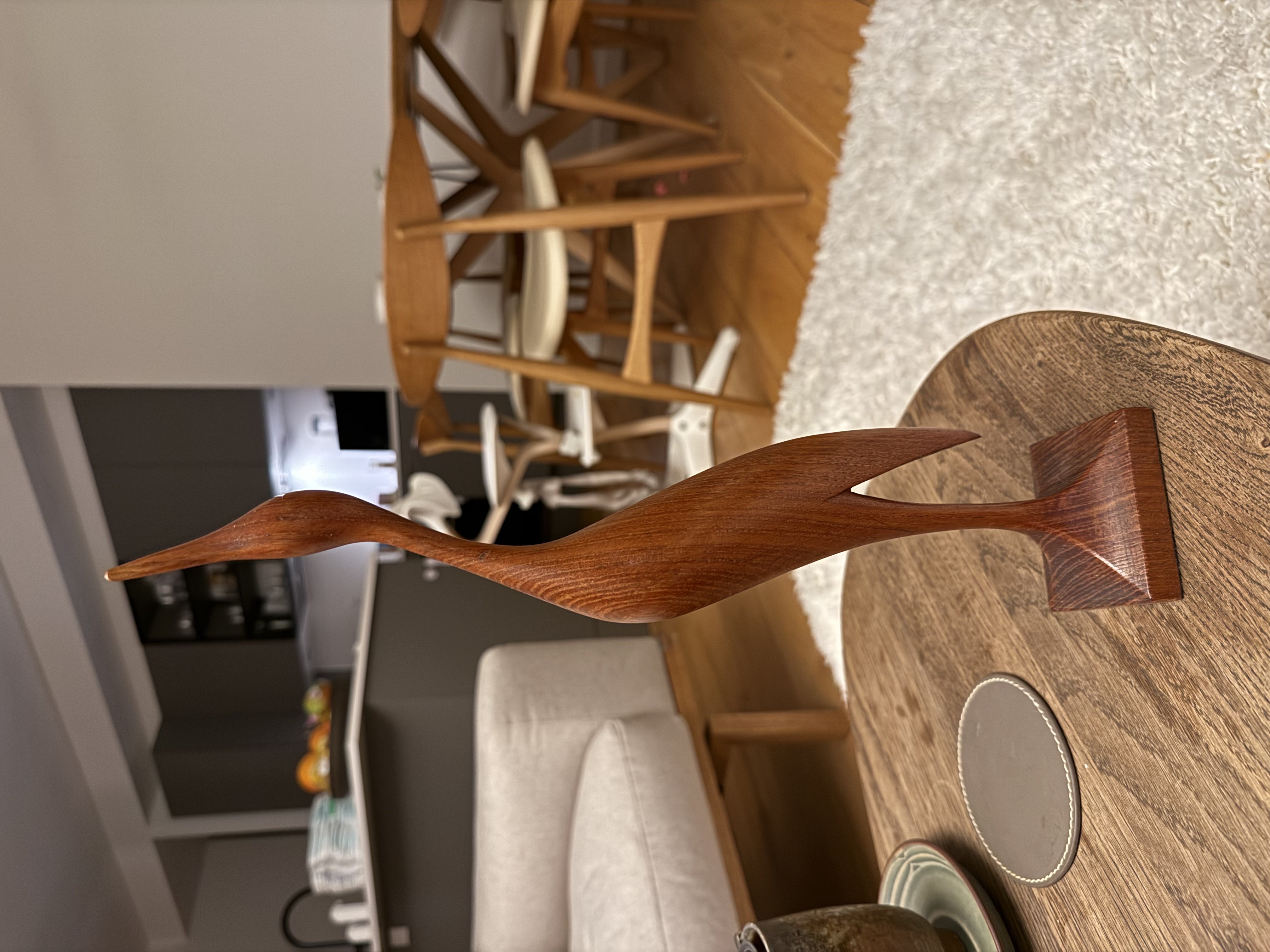 This elegant teakwood crane sculpture dates back to the 1960s, a period known for minimalist and organic shapes in design, particularly within the Danish and Swedish modernist movements. The sculpture is likely crafted from teak, a highly prized material during the mid-century for its rich color and durability. This period saw the rise of sculptors who were fascinated by the simplicity and grace of nature, often capturing birds and animals in sleek, fluid forms. The crane is a symbol of longevity and harmony, often associated with peace and wisdom in many cultures. Sculptures like this one were common in the homes of design enthusiasts during the mid-century modern era, reflecting a blend of artistry and functionality. The estimated dimensions of 30 cm in height allow for easy placement on a mantel or shelf, making it a versatile piece for home decor. Teakwood’s natural resistance to wear ensures that such pieces remain in good condition even today. Collectors value these sculptures for their aesthetic purity and the craftsmanship evident in the smooth, seamless finish. As a representation of Scandinavian design ethos, it exemplifies the pursuit of beauty in utility. Its market value varies due to its condition and provenance, but it remains an attractive piece for mid-century collectors. The warm hues of the teak bring organic warmth to interior spaces, enhancing their architectural features.
